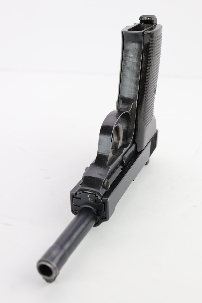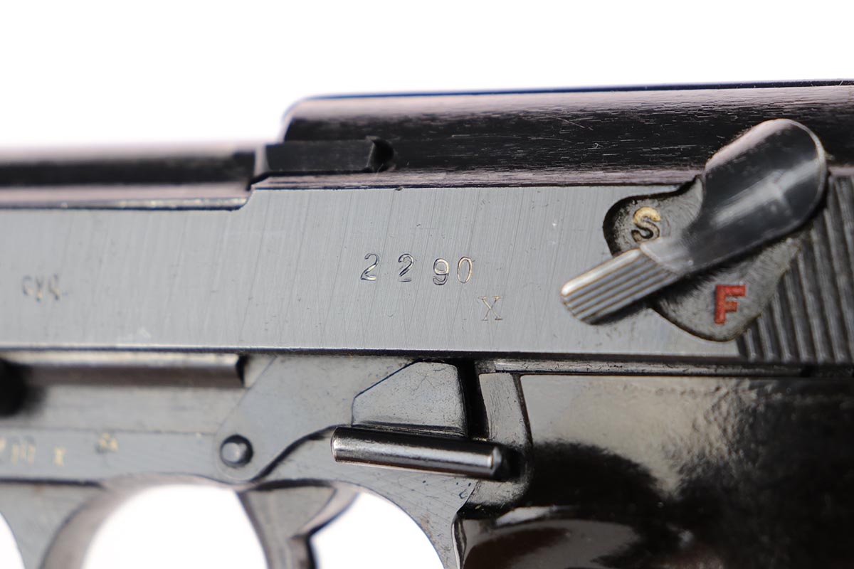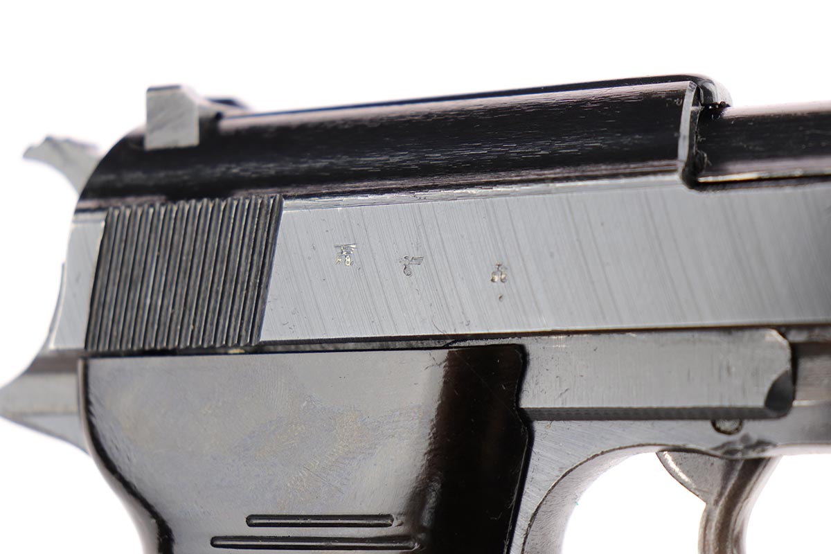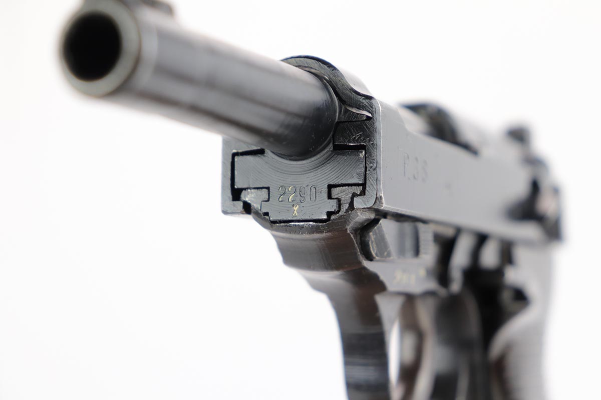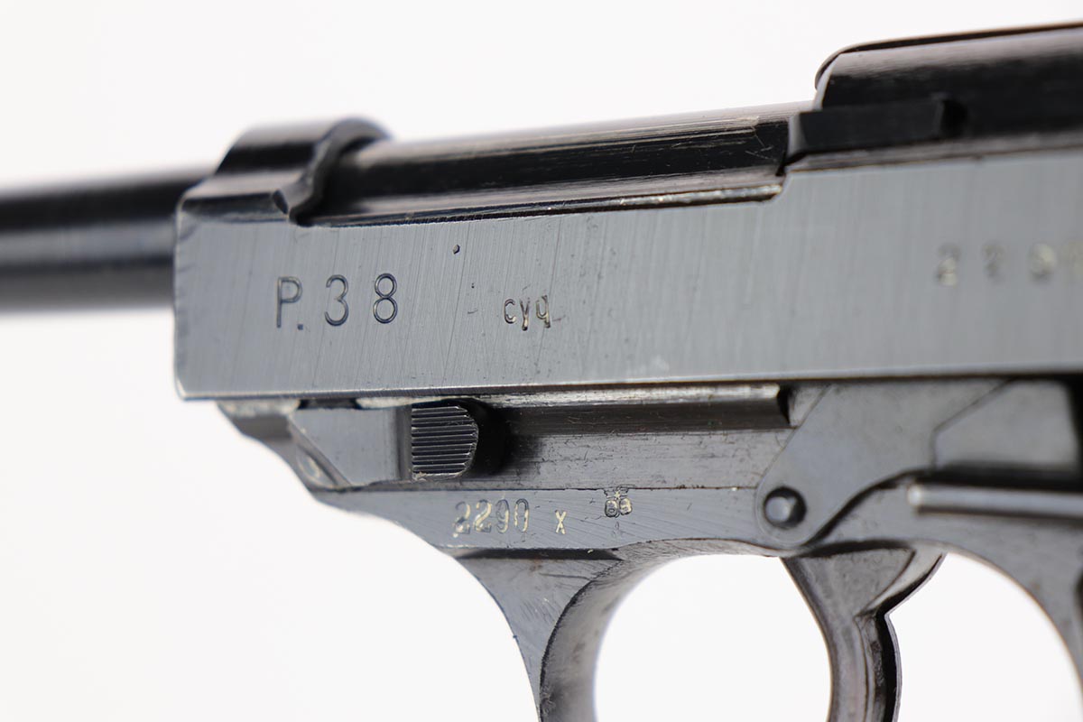 2/14/20 – This is an excellent Spreewerk P.38 from December of 1944, which comes in an unmarked shoulder holster. The pistol is all matching and original with about 96% blue remaining. There’s an area of finish loss along the top of the barrel in the area over the chamber, and minor thinning on the front strap. Excellent bore and proper mechanics. Magazine is ‘jvd’ marked. Holster is in very good condition with no major issues.