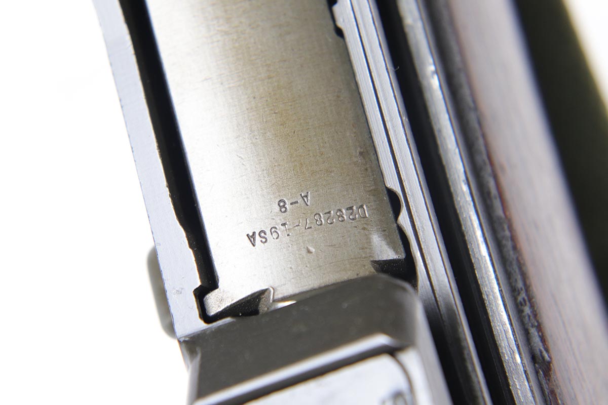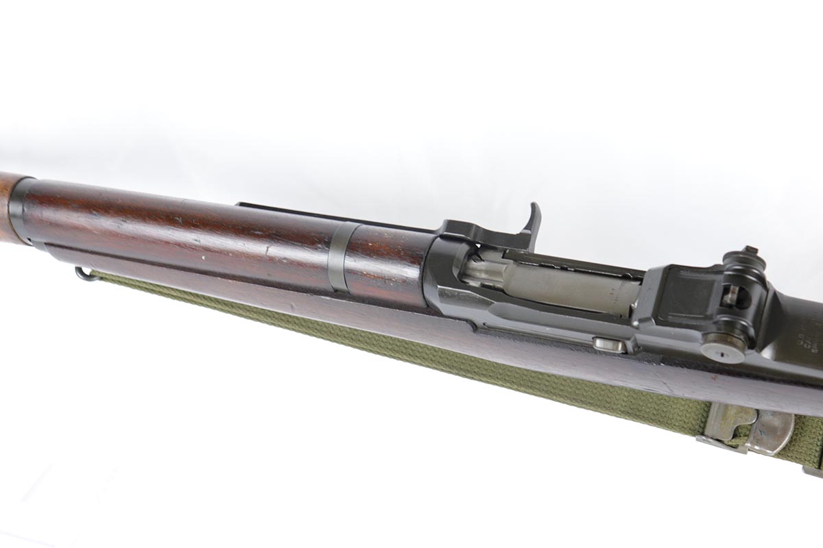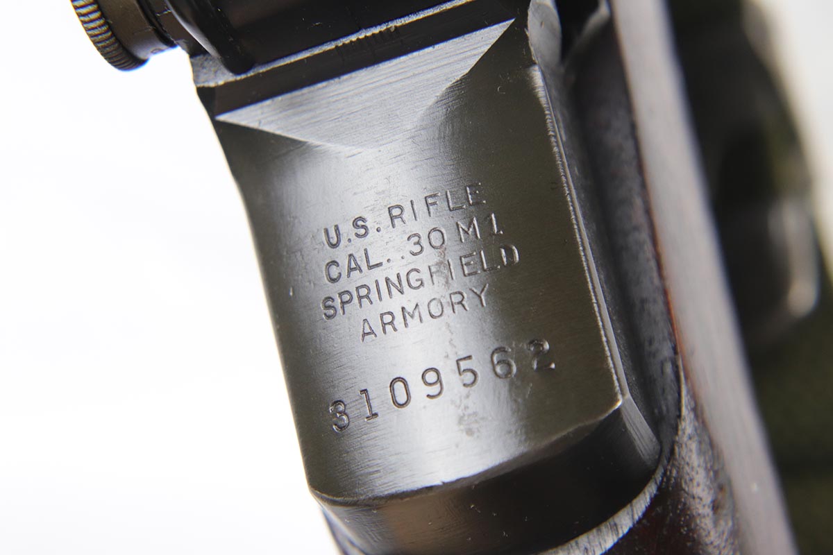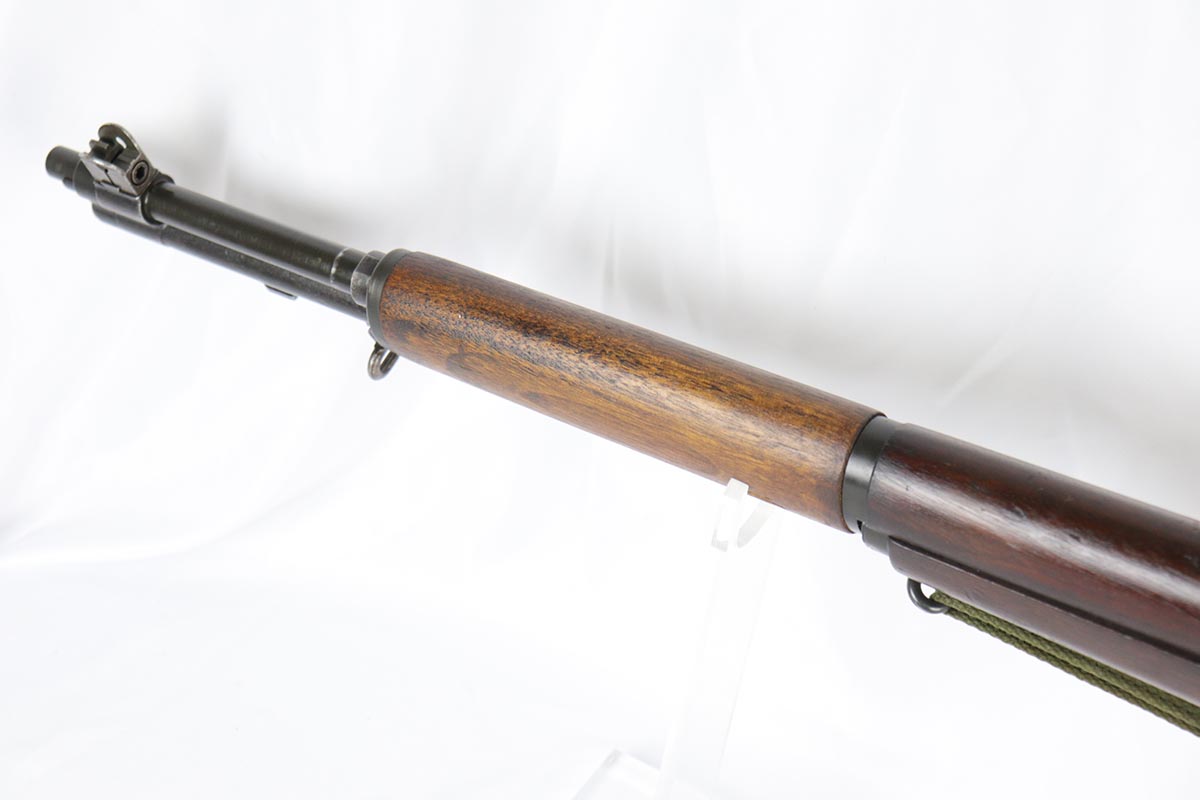 6/6/18 – This is an excellent and unmodified example of the best designed WWII infantry rifle – an M1 Garand.  This one was made in August 1944 and chambered in .30-06 caliber. This is an all original and all correct rifle that had not been rearsenaled and retains 90-95% of its parkerizing and has all the correct parts with appropriate “drawing” numbers. The receiver is near mint but there is some finish loss on the underside of the barrel.  The barrel is dated 8/44 which matches the year and month of production of the receiver.  Excellent unrefinished wood with sharp ordnance wheel cartouche and SA GAW acceptance marking next to it. There are no cracks.  Everything on this rifle is original WWII Springfield Armory, including the lock-bar rear sight. Very few of the unmodified WWII M1 Garands exist as the vast majority had gone through an Arsenal update at least once in the past 70 years.