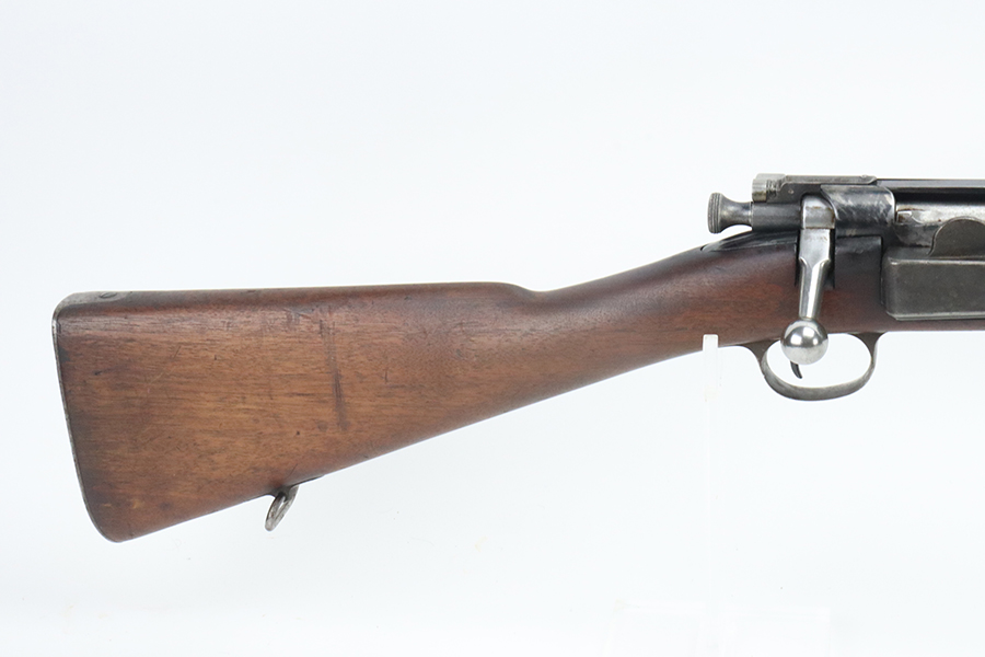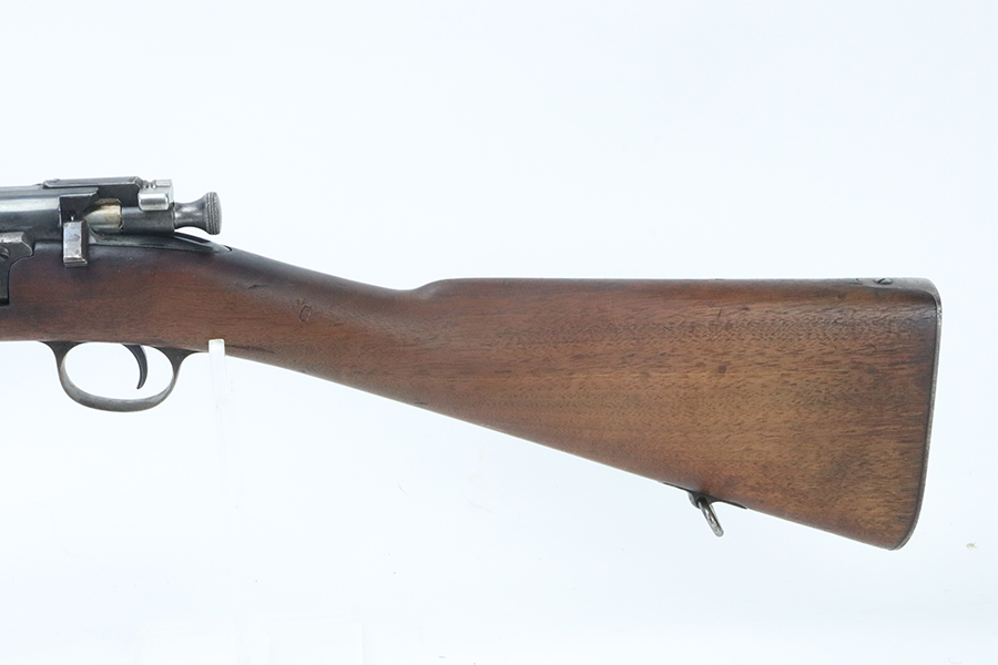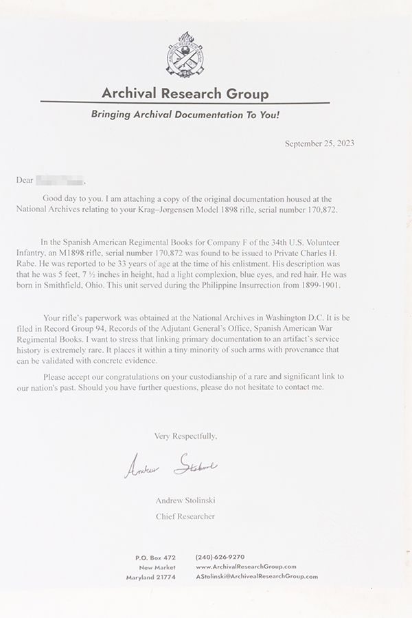 05/29/2024 – For sale is a special Krag Model 1898 rifle made in 1899. This rifle has been researched and found to be issued to Private Charles H. Rabe of Company F of the 34th US Volunteer Infantry, who was stationed in the Philippines from 1899-1901. This rifle is in an overall 97% condition with wear on the receiver, magazine gate, and patina on the barrel bands. The rifle was reworked with a repair on the handguard and the stock is lightly sanded and the acceptance proof is missing. There is a Circle P stamp on the wrist area. The bore is bright but becomes darker towards the muzzle. There is a letter from the Archival Research Group which had researched and found the history of this specific rifle.
