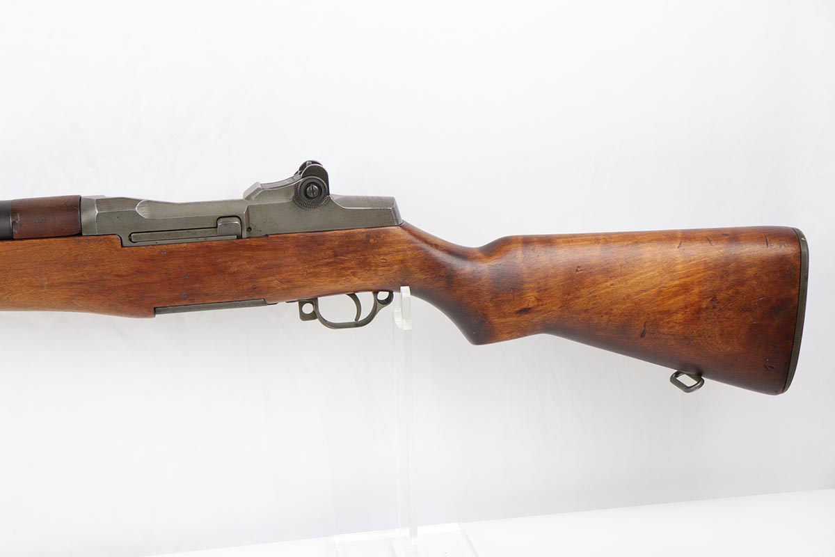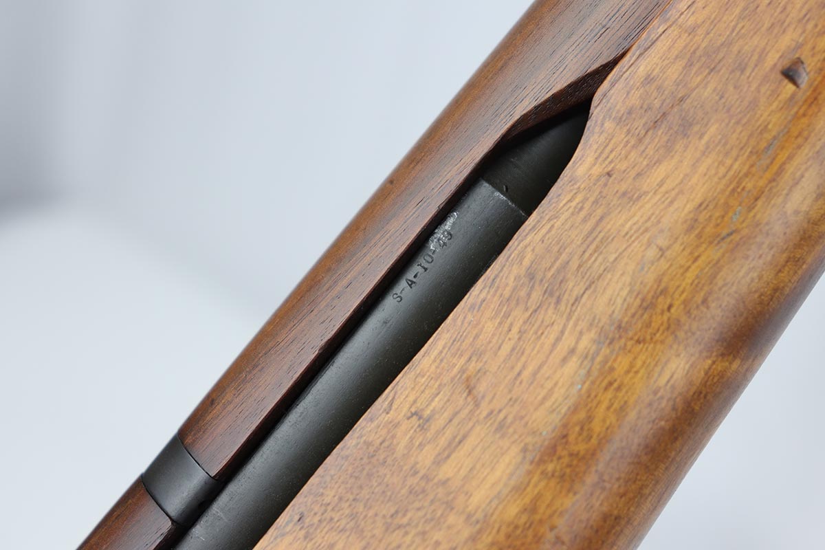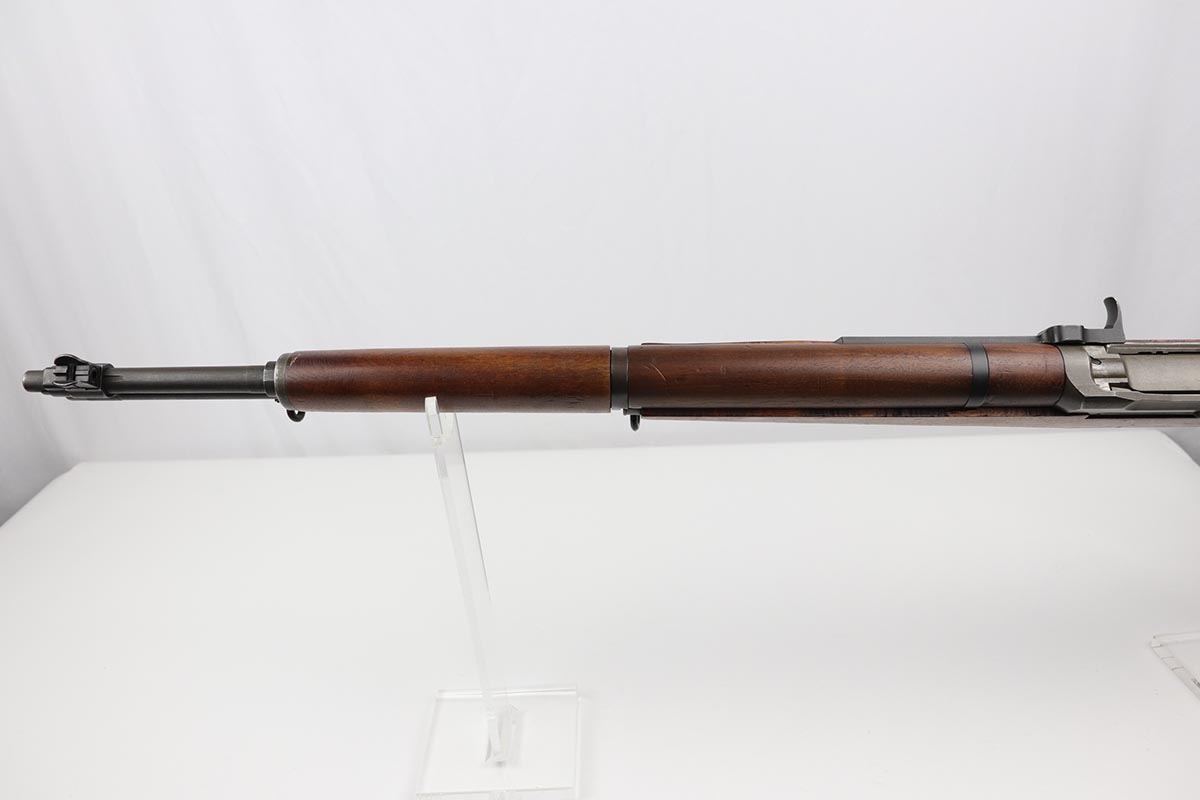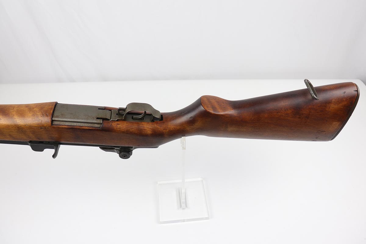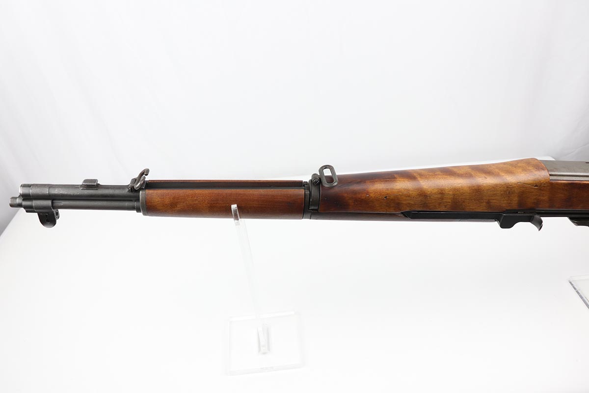 7/23/19 – This is a Springfield Armory M1 Garand from 1944. The barrel is dated October of 1949, and the receiver serial dates to February of 1944. This gun is an interwar Springfield Armory rework, using a beautiful tiger-striped Birch wood stock. It also has an International Harvester (IHC) op rod. It has a flush nut rear sight. Overall, the gun is in very good condition. The metal parts are in good condition and have most of their finish. However, there are small spots of minor discoloration on the receiver, floor plate, and trigger housing throughout. There are very minor handling marks on the barrel and gas trap cylinder, near the muzzle. The tiger-striped wood stock is in excellent condition, just some very minor surface marks here and there. It has a very crisp “P” marking below the trigger group. The front hand guard is a little loose. The bore is excellent – shiny with very strong rifling. The gun is fully functional and the action is smooth.