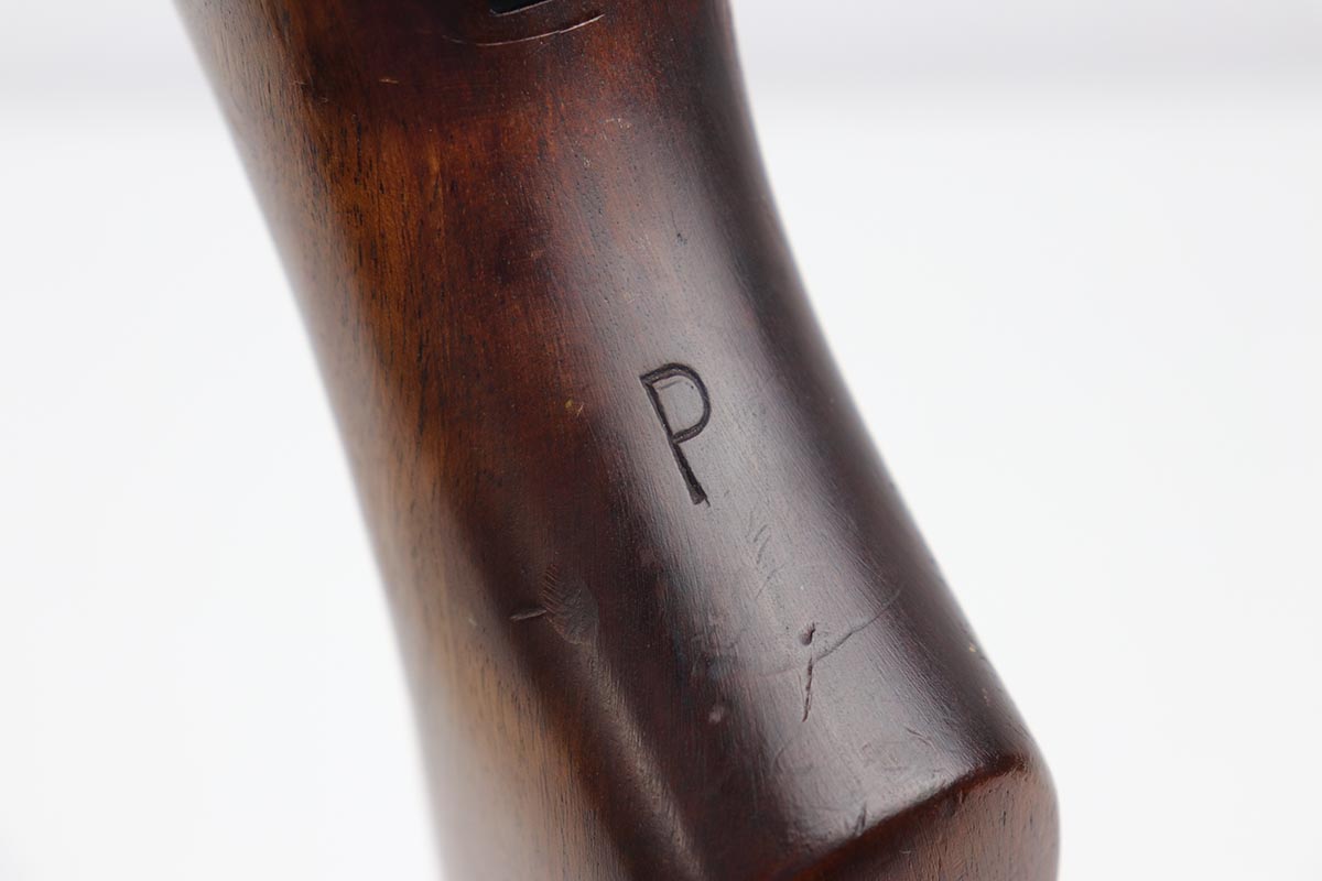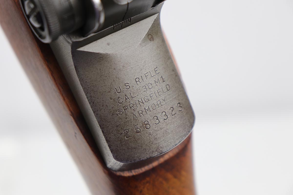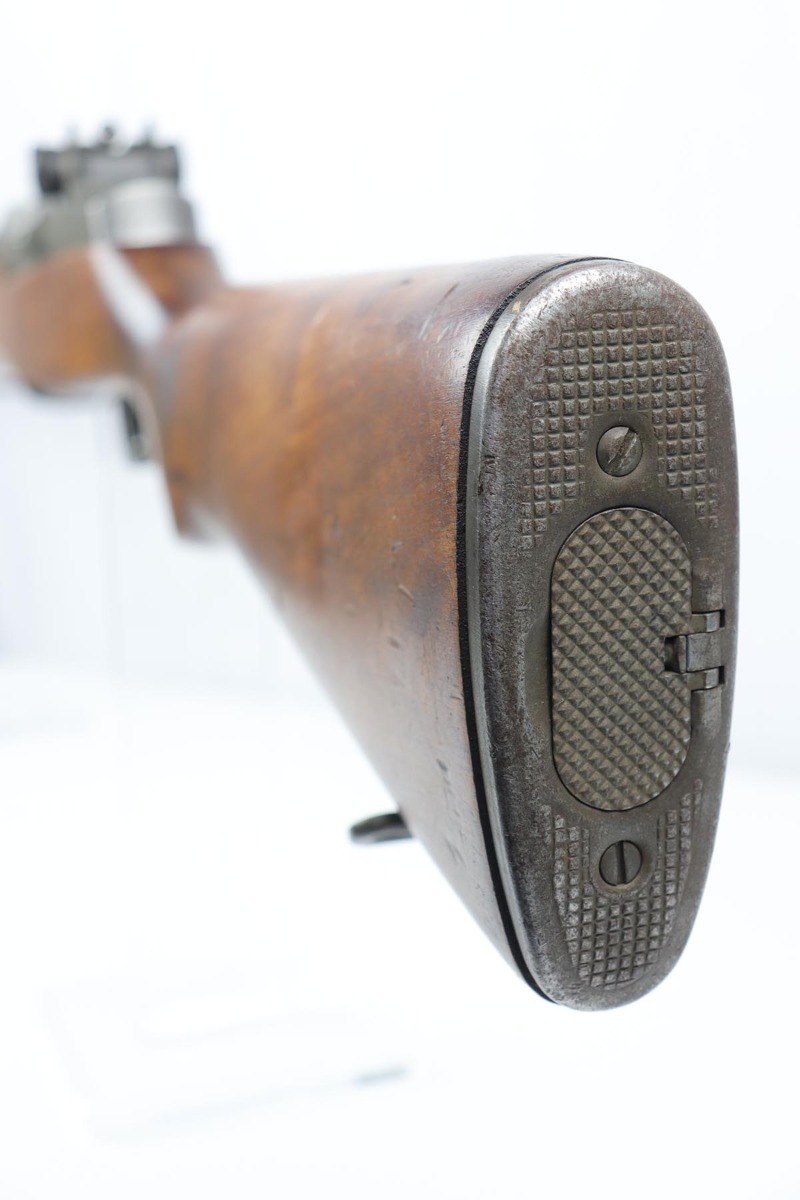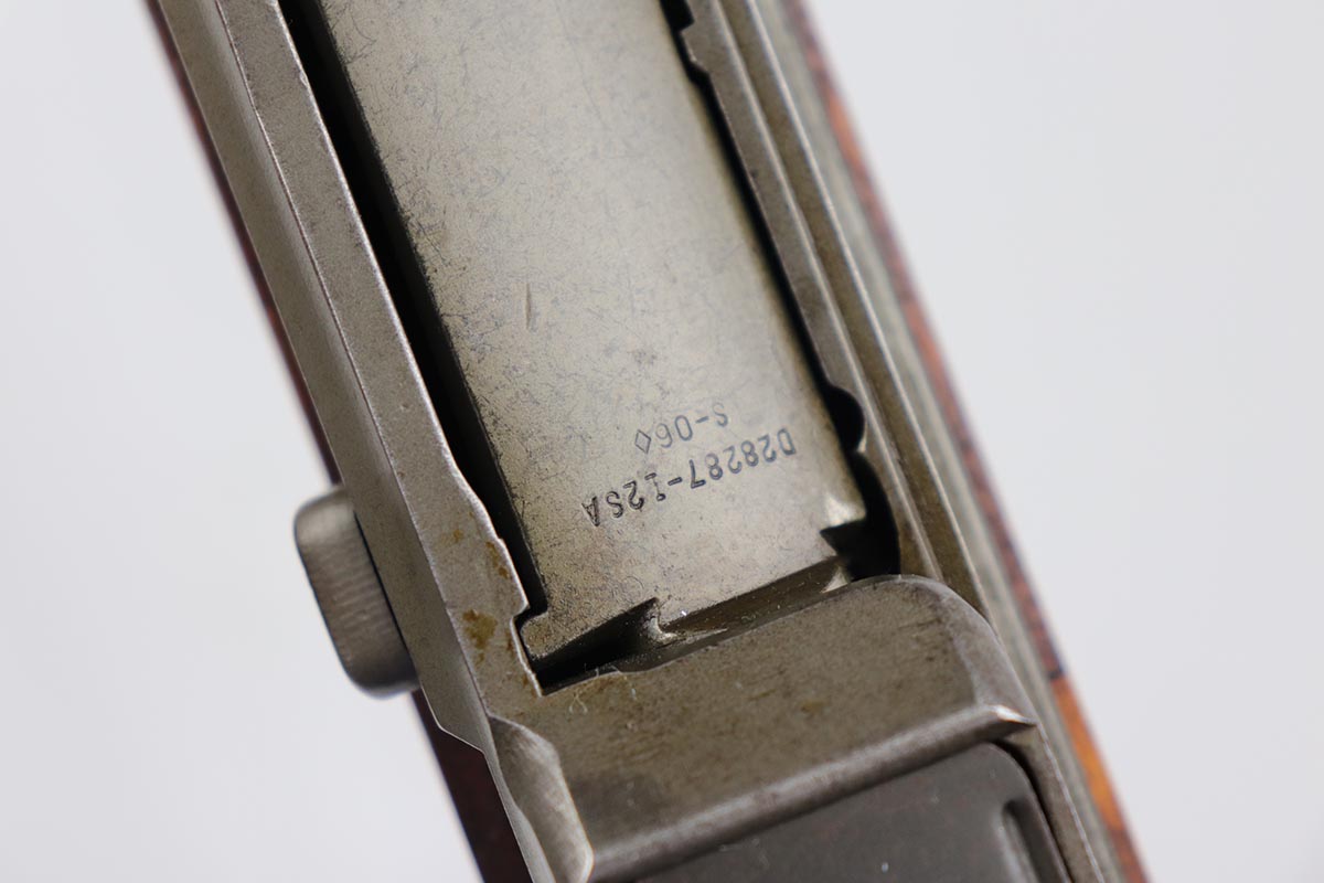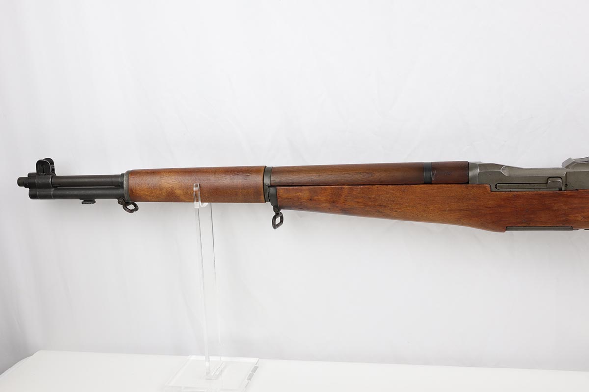 7/23/19 – This is a Springfield Armory M1 Garand from 1944. The barrel is dated October of 1949, and the receiver serial dates to February of 1944. This gun is an interwar Springfield Armory rework, using a beautiful tiger-striped Birch wood stock. It also has an International Harvester (IHC) op rod. It has a flush nut rear sight. Overall, the gun is in very good condition. The metal parts are in good condition and have most of their finish. However, there are small spots of minor discoloration on the receiver, floor plate, and trigger housing throughout. There are very minor handling marks on the barrel and gas trap cylinder, near the muzzle. The tiger-striped wood stock is in excellent condition, just some very minor surface marks here and there. It has a very crisp “P” marking below the trigger group. The front hand guard is a little loose. The bore is excellent – shiny with very strong rifling. The gun is fully functional and the action is smooth.