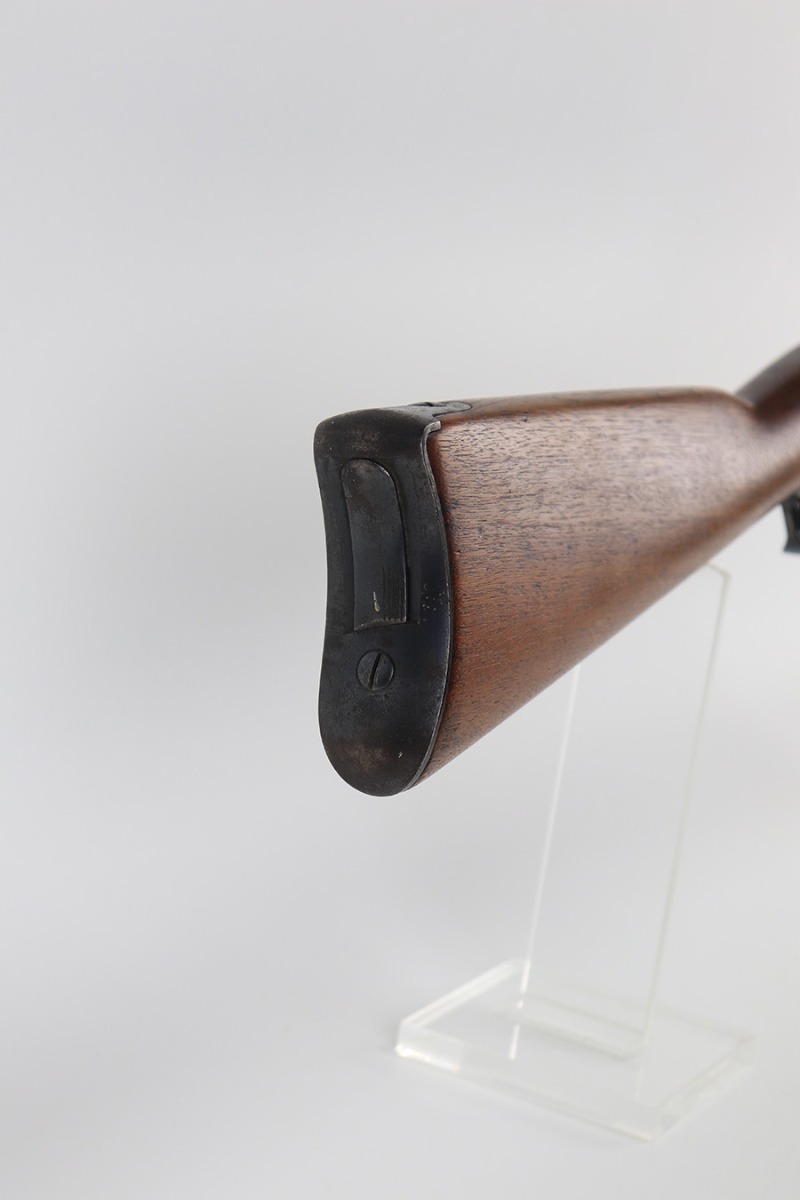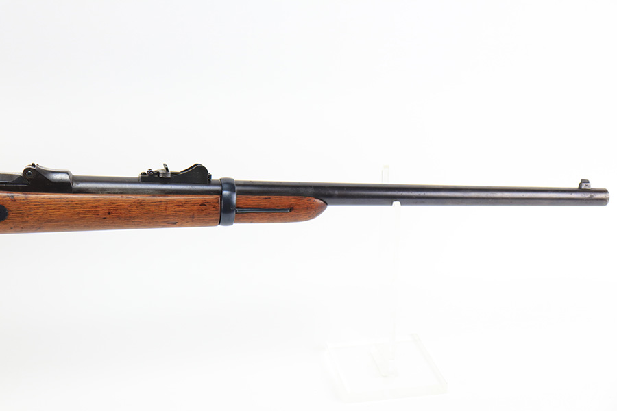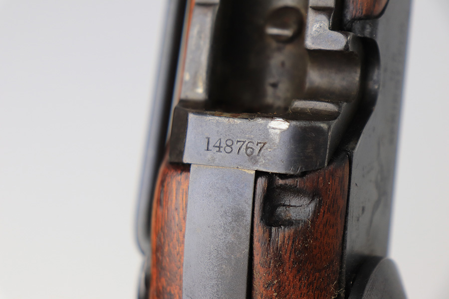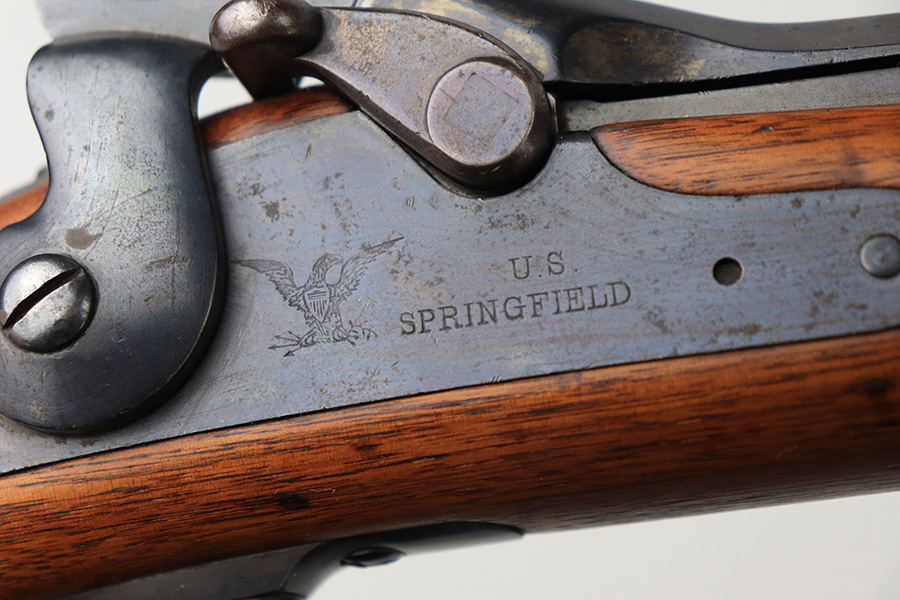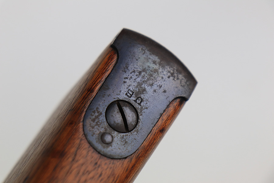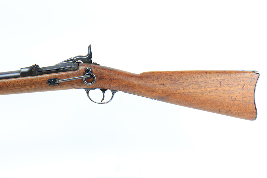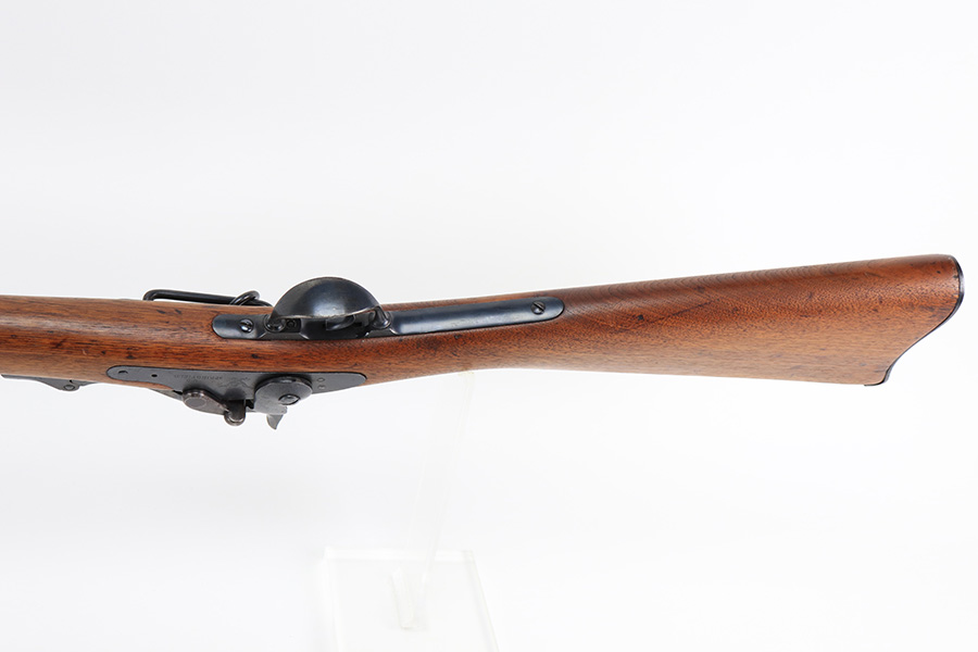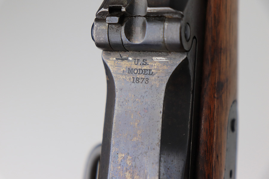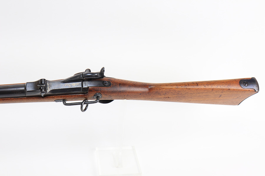 3/29/22 – This is an excellent example of a Springfield Model 1873 Cavalry Carbine issued to the US military in 1881. The Springfield Model 1873 was the Army’s standard issue rifle during the Indian Wars of the 1870s and 1880s. The rifle also saw service in the Spanish-American War and the Philippine Insurrection. Today, it is a favorite weapon of gun collectors. They then developed the carbine version of the 1873 rifle. The M1873 performed well in combat, and a cavalryman described it as a weapon that “would shoot and kick hard, carrying up to 500 yards very well.” While it was an effective weapon, the M1873 had a powerful recoil, and many soldiers who used it would claim that the rifle could knock down two men with each shot—the man it hit and the man who fired it. This one has the proper “US” markings on the lock and butt plate. It also has the proper “V”, “P”, and “Eagle Head” proofs on the barrel. No visible markings on the stock. Overall, the gun is in excellent condition. The metal parts have retained most of their bluing with minor wear around the muzzle and some light freckling along the barrel and on the trigger guard. Some light spotty discoloration around the breech and on the hammer. Excellent stock that was likely sanded. The bore has decent rifling, but there is spotty oxidation throughout and some areas of pitting.
