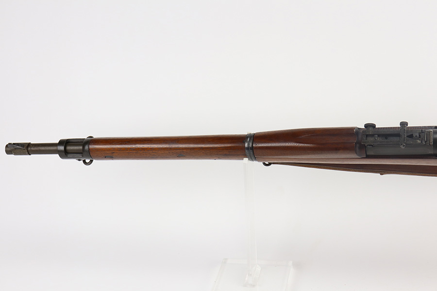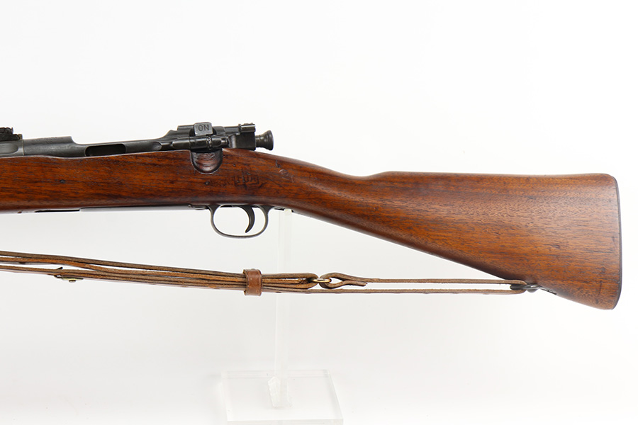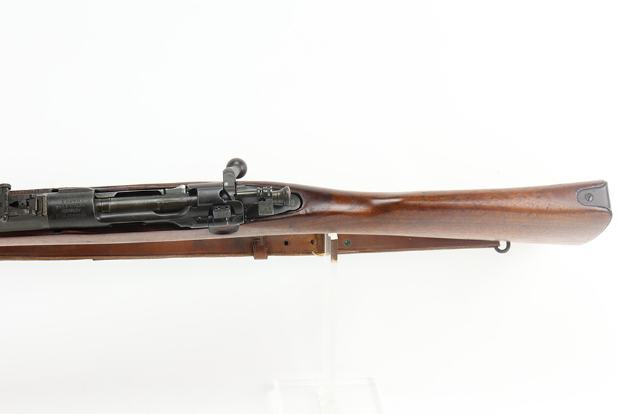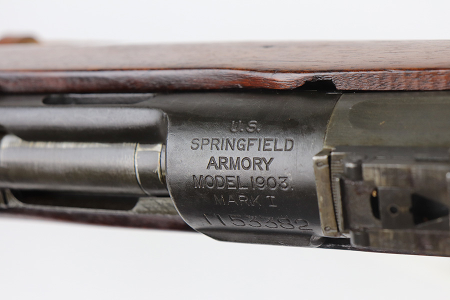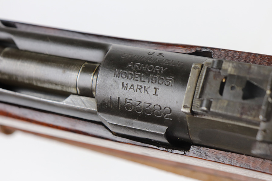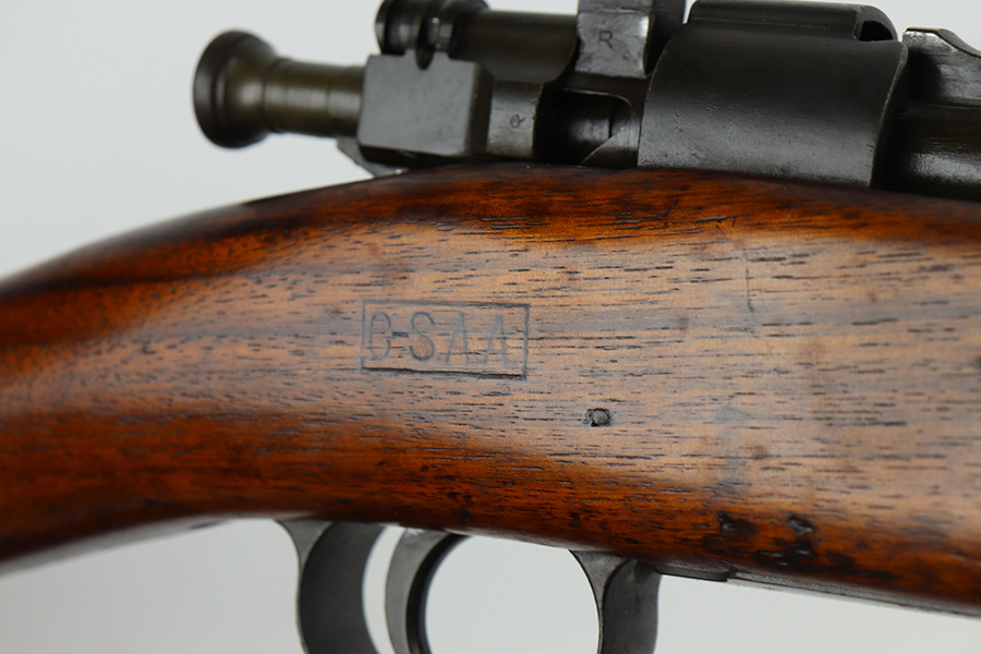 6/16/21 – This is an excellent example of a Springfield Model 1903 Mark I bolt action rifle. The receiver dates to 1919 and the barrel is dated July of 1944. The barrel is marked “HS” and has a flaming bomb proof. The receiver has a cutout to receive a Pedersen device. The stock is “P” proofed, has the proper “FJA” inspector proof, and has a “C-SAA” proof. This would indicate the gun was reworked at the San Antonio Arsenal and reissued in 1944. The gun is excellent condition, retaining most of its finish with minor scuffs around the muzzle. Excellent stock with minor scuffs and bruises. Comes with a period-correct sling. Minty bore.