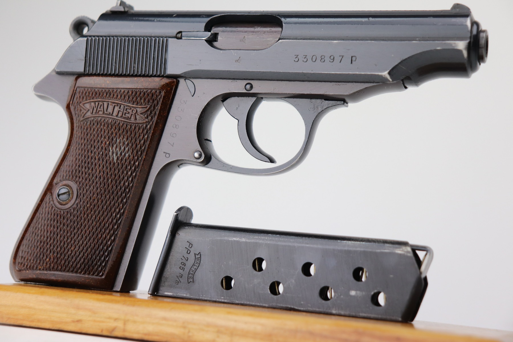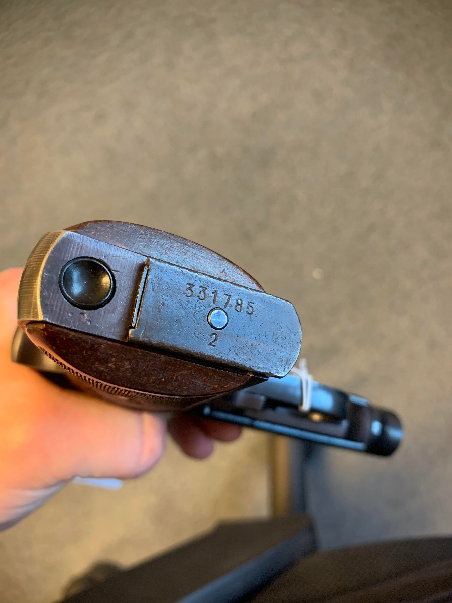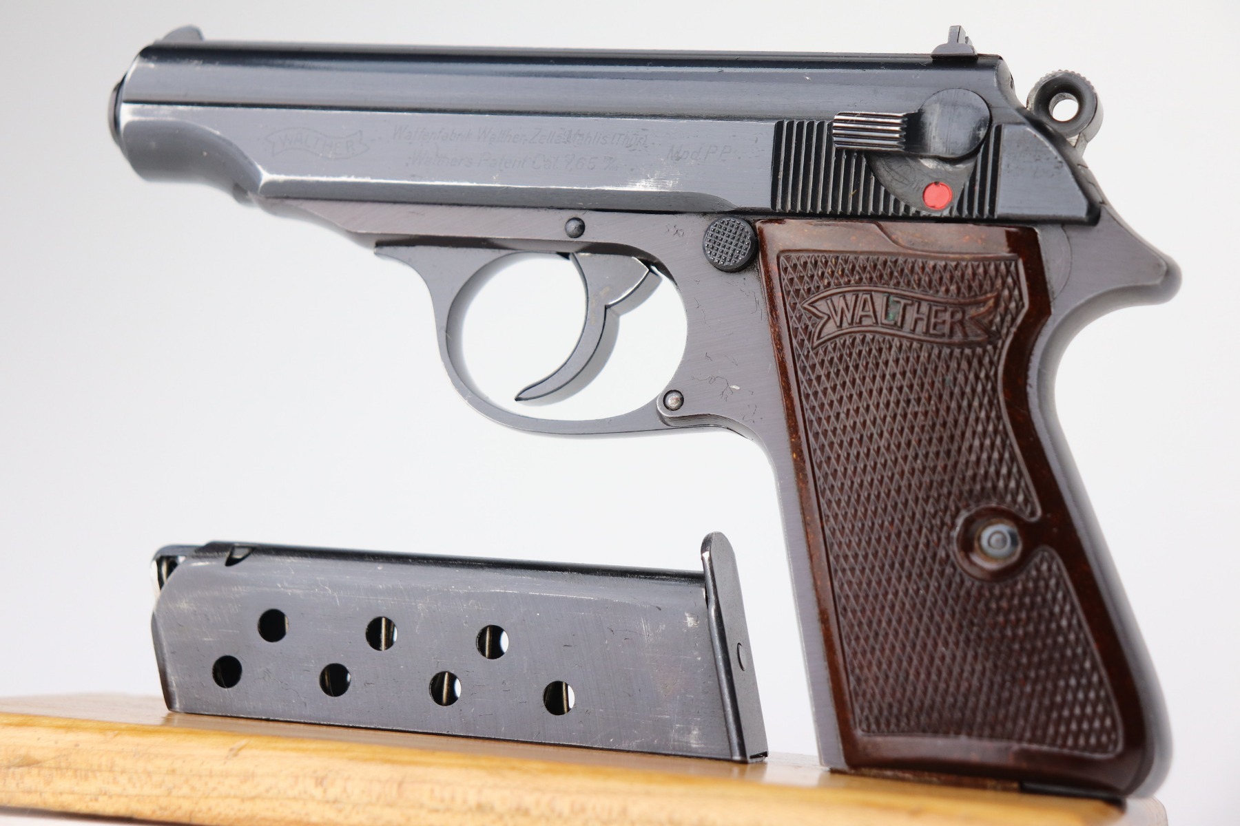3/1/21 – This is an excellent example of a Walther PP issued to the SS in 1944. The gun is matching and has the proper “Eagle N” proofs. It is in the correct serial range for an SS-issued PP. It comes with a numbered magazine that is mismatched but also in the correct serial range for an SS gun. The gun is excellent, retaining about 97% of its original finish. There is minor wear around the muzzle and some of the high edges of the slide. One small spot of wear on the left side of the slide. It comes with excellent rare red Walther grips. Excellent bore – shiny with strong rifling.