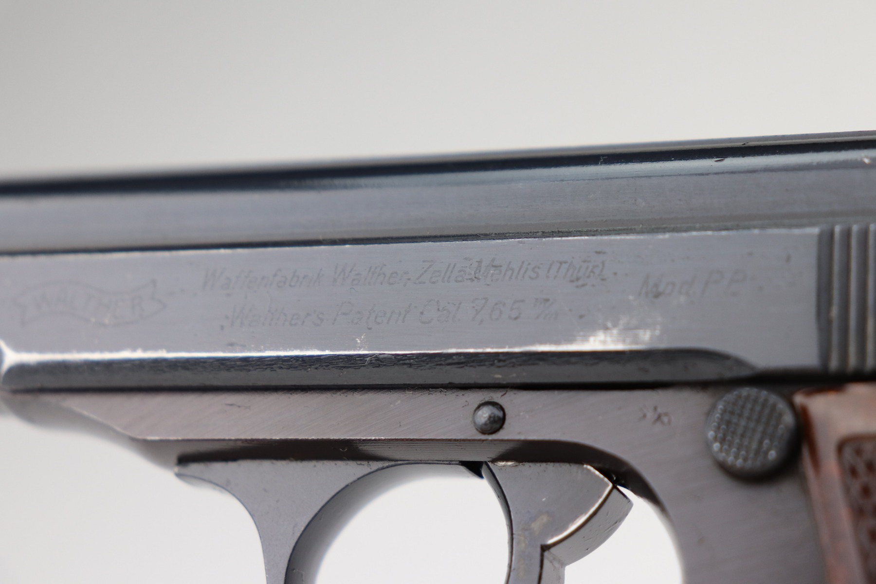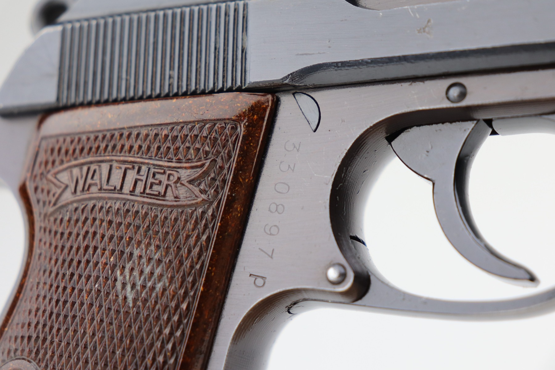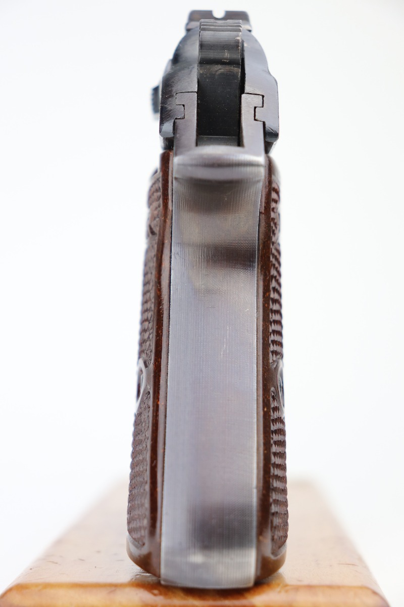 3/1/21 – This is an excellent example of a Walther PP issued to the SS in 1944. The gun is matching and has the proper “Eagle N” proofs. It is in the correct serial range for an SS-issued PP. It comes with a numbered magazine that is mismatched but also in the correct serial range for an SS gun. The gun is excellent, retaining about 97% of its original finish. There is minor wear around the muzzle and some of the high edges of the slide. One small spot of wear on the left side of the slide. It comes with excellent rare red Walther grips. Excellent bore – shiny with strong rifling.
