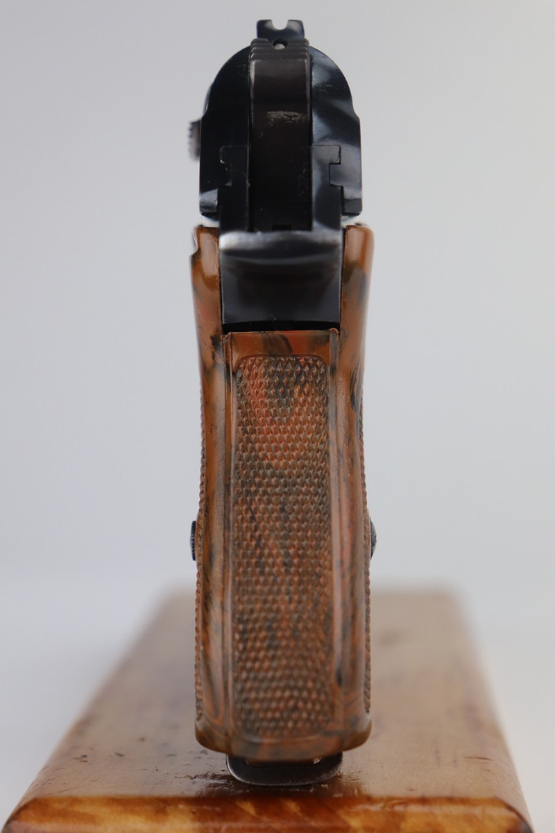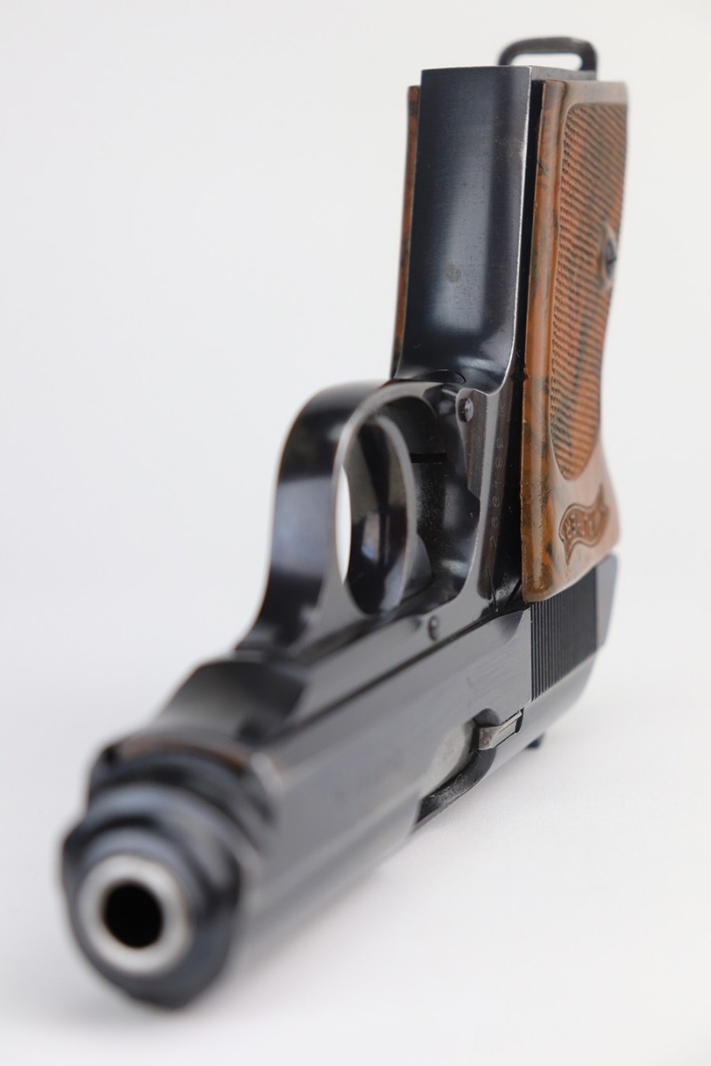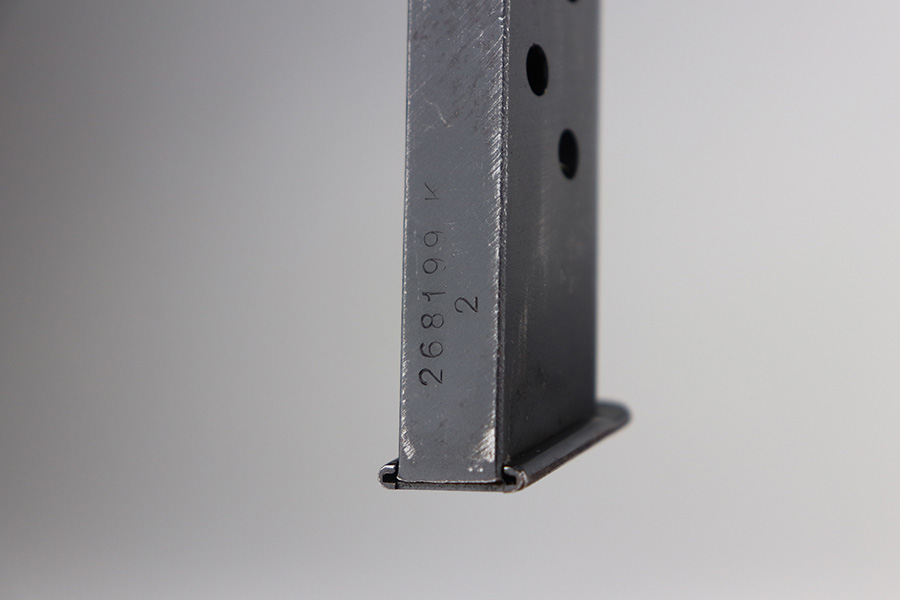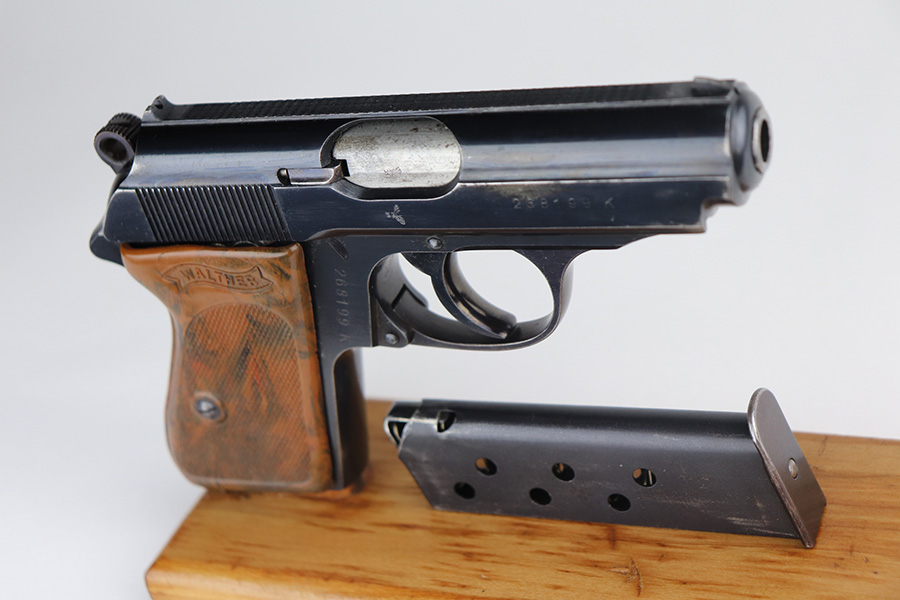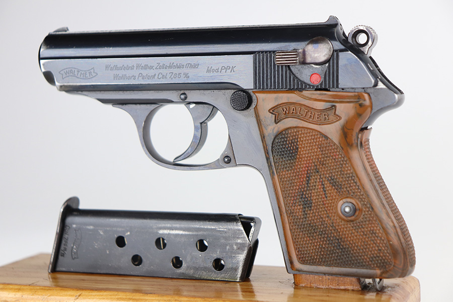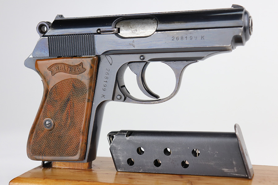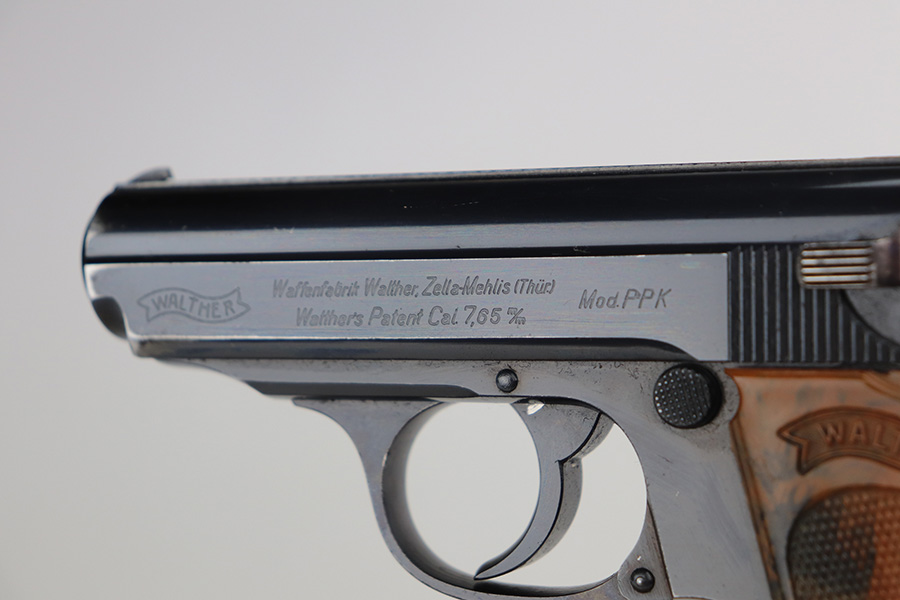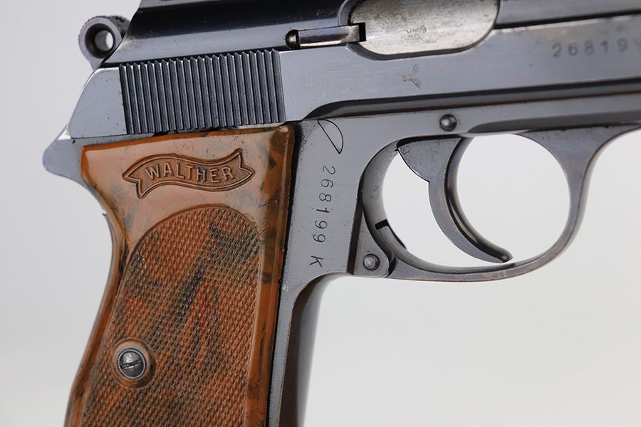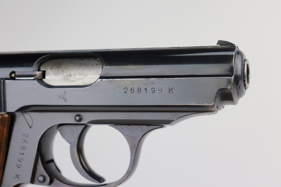 6/22/21 – This is an excellent example of an SS-contract Walther PPK manufactured in 1940. The gun is in the correct SS contract serial range, all matching, has the proper “Eagle N” proofs, and comes with one original matching spine-numbered magazine. It has retained about 96-97% of its original high polish finish. There is very minor wear on the high edges of the slide and around the muzzle. One area of wear on the right side of the slide. A small spot of wear and very minor freckling on the front strap. Comes with an excellent brown grip. The bore is near mint.