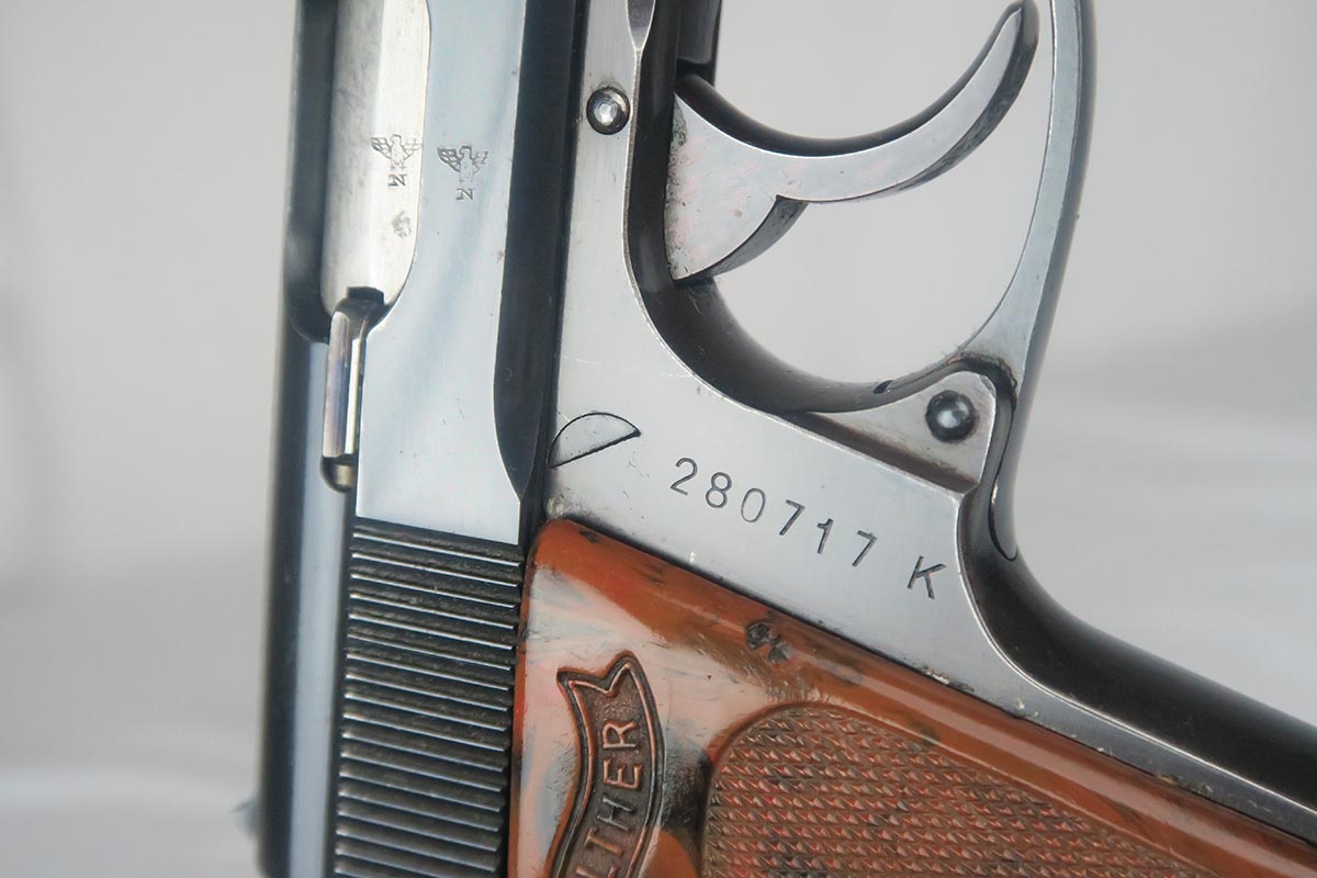 1/31/18 – This is an excellent example of an SS Walther PPK with one original matching magazine. This is a variation 4 pistol with K suffix and serial on slide and frame. The high-polish blue rates at 98% with muzzle wear on each side of the slide. 60 degree safety shows some fire blue still. Grip is excellent aside from a stress crack in the spine. Wartime magazine. Excellent bore.