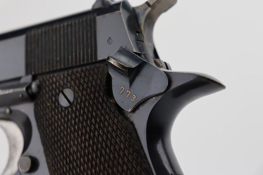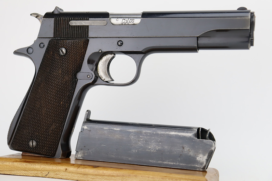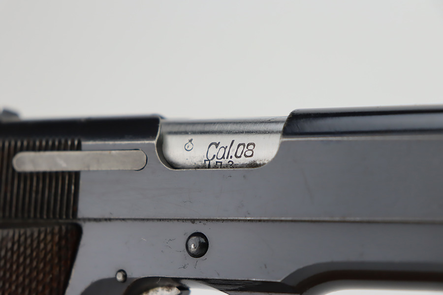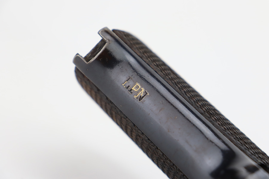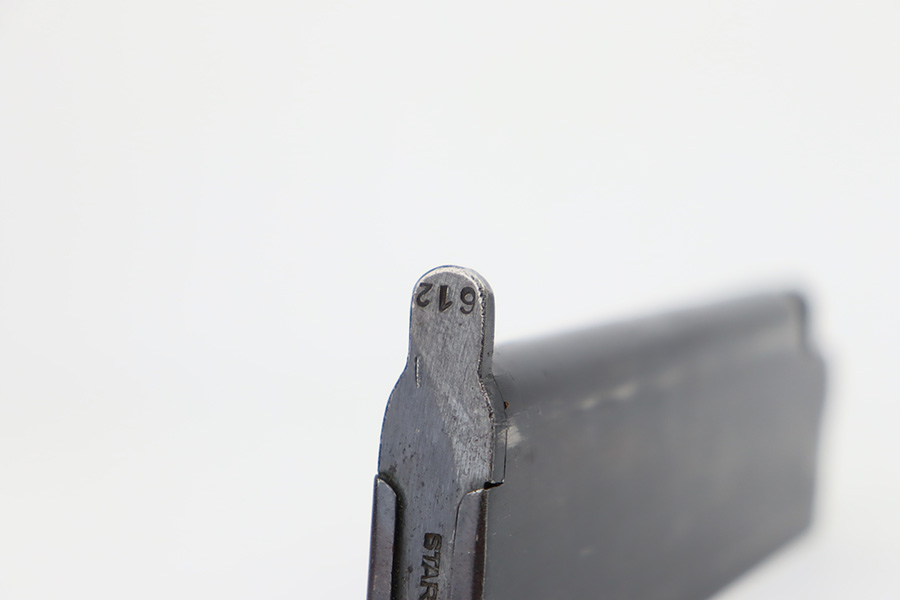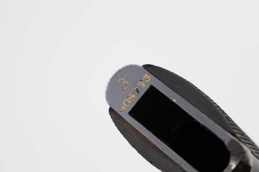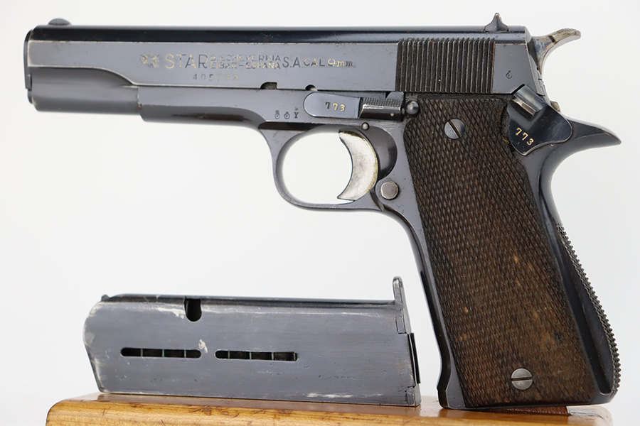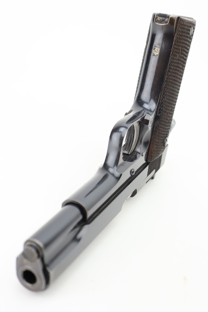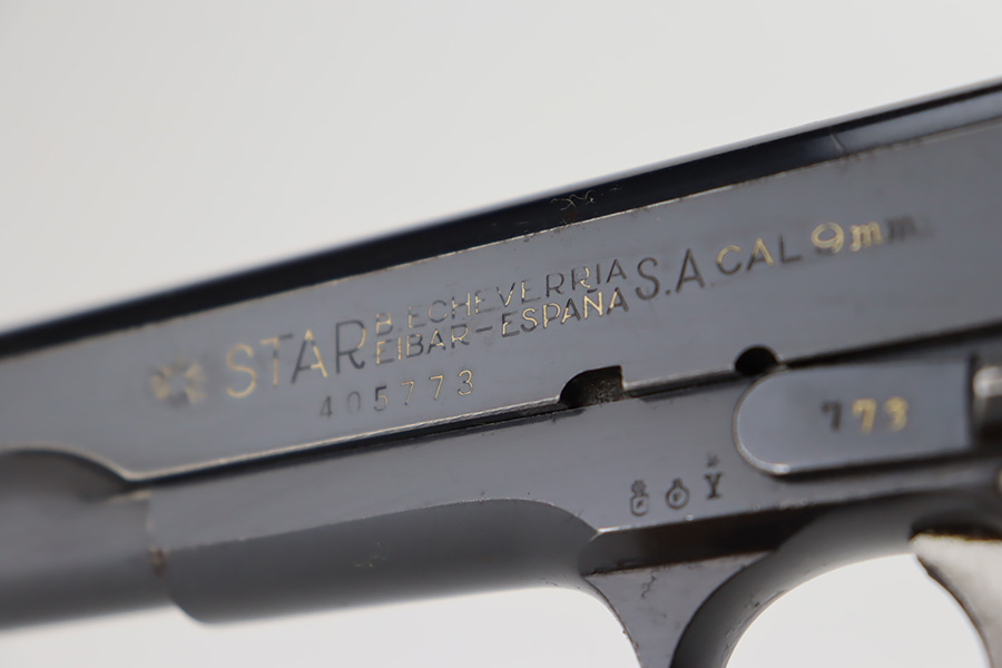 10/9/23 – This is an excellent example of a Star Model B. It is all matching and has an “LPN” marking on the front strap, indicating it was issued to the West German police force. The Star “Y” date code dates it to 1953. It has retained about 97% of its original high polish finish. Just very minor wear around the muzzle and hints of wear on the high edges. A few tiny dots of light oxidation here and there, and some tiny handling marks on the front strap. Comes with nice period-correct wood grips and one correct magazine that is numbered but not matching. Mint bore.
