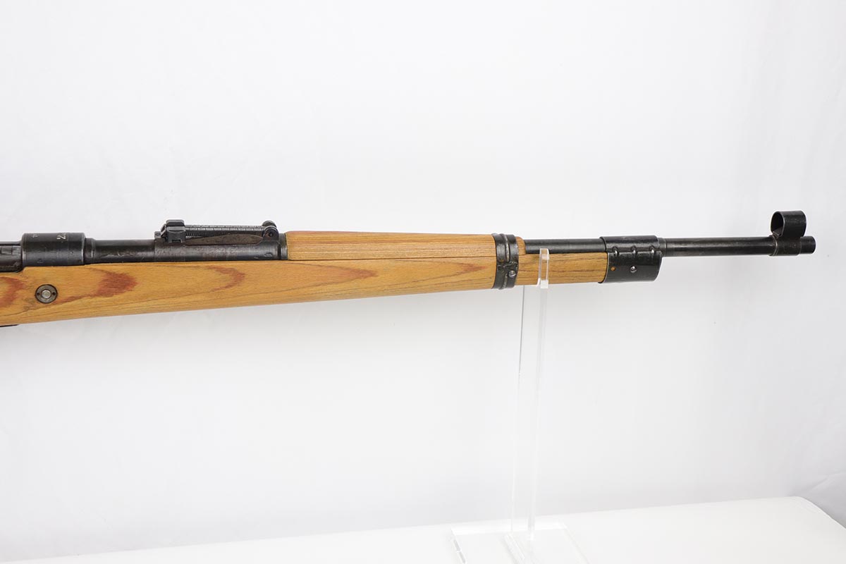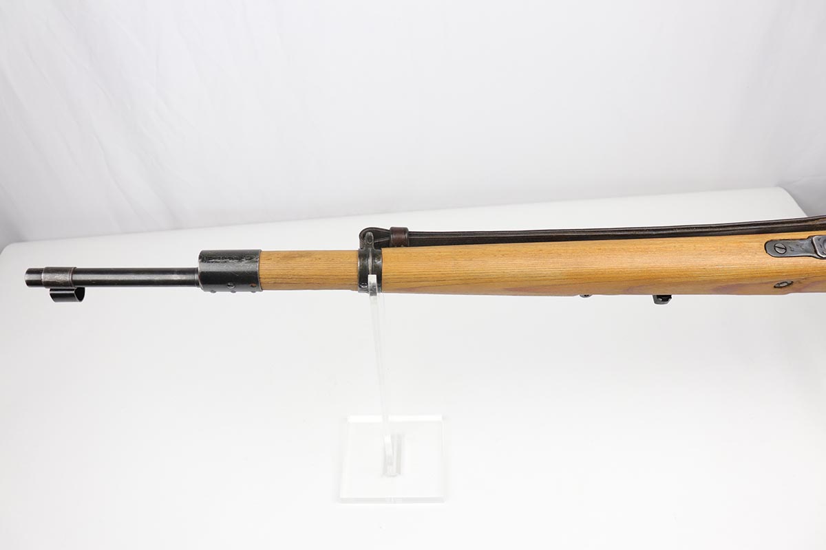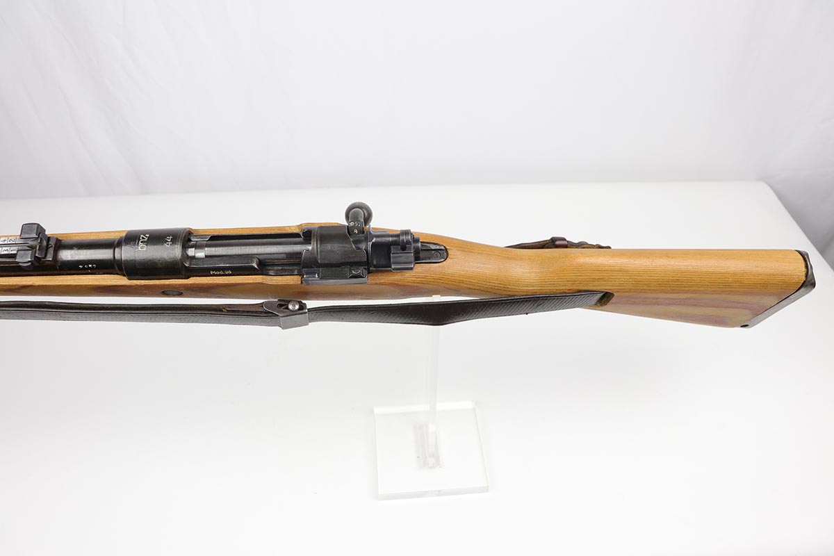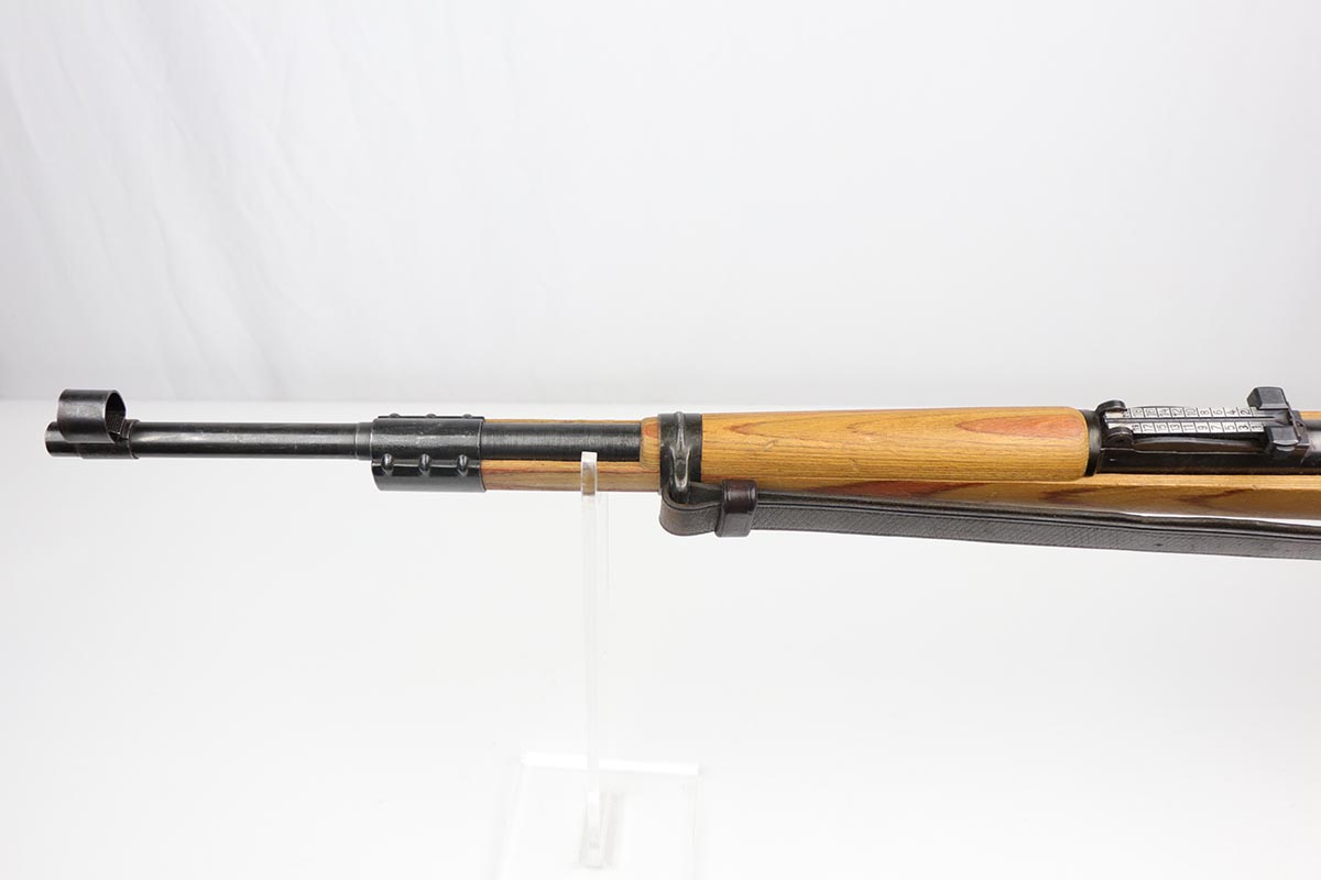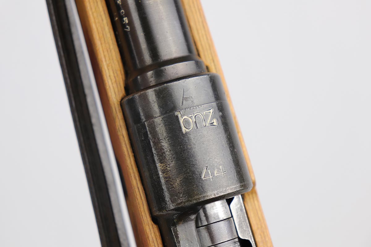 2/16/24 – This is an excellent and original Steyr produced K98 Kriegsmodell, marked with large letter ‘bnz 44’ on the receiver. It has typical late-war features for a Kriegsmodell such as no cleaning rod slot, no bayonet lug and no disassembly disc. Only numbered parts are the receiver and the bolt handle, which match. It’s common for these late examples to have many unnumbered parts. The metal is in good shape with about 90% blue remaining, as there’s minor thinning on all major surfaces. Stock is in fantastic condition with H proof for Heer Army and waffenamt. Correct ‘byf’ floorplate and ‘lxr’ marked magazine follower. Minty bore and excellent, original sling. The buttplate isn’t a perfect fit but this also can be commonly observed on these rifles.