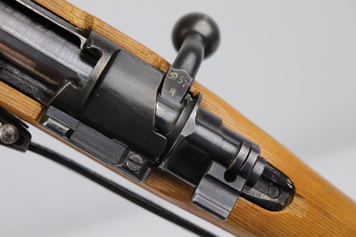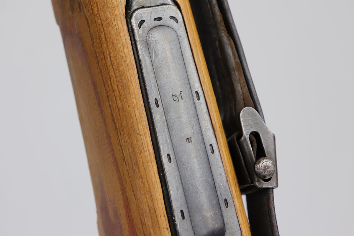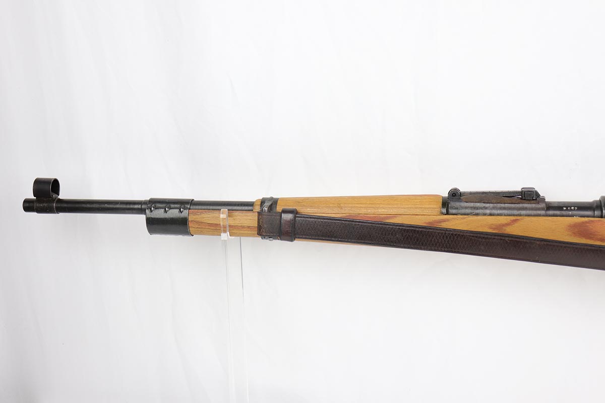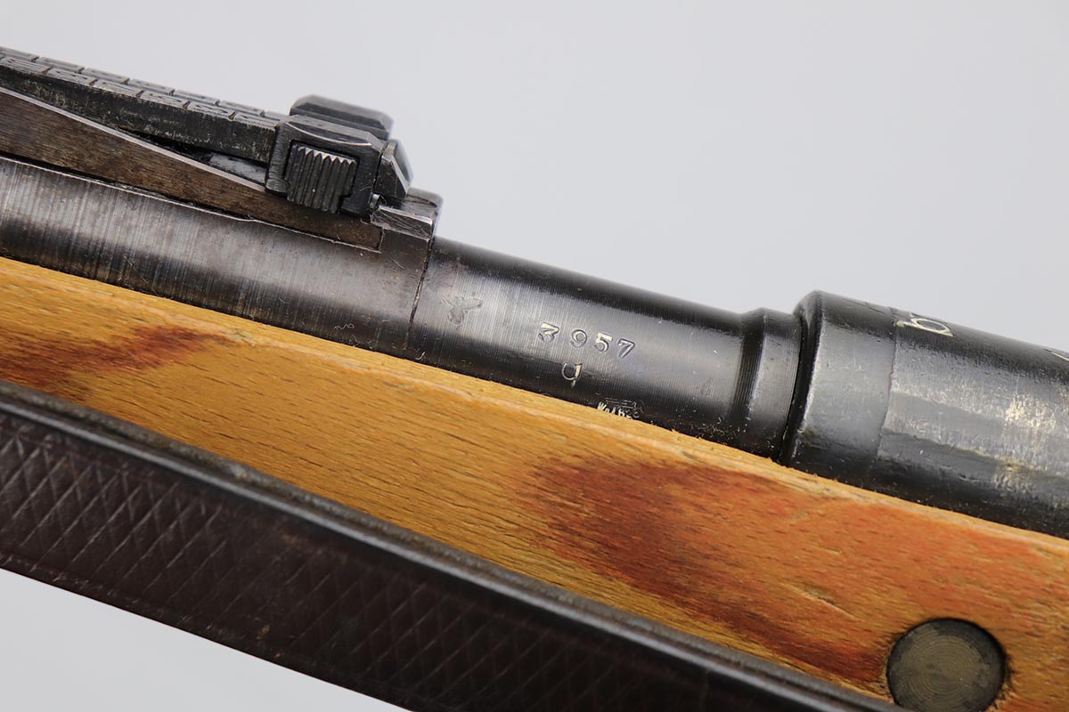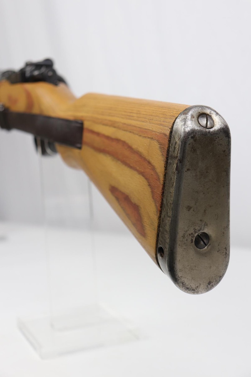 2/16/24 – This is an excellent and original Steyr produced K98 Kriegsmodell, marked with large letter ‘bnz 44’ on the receiver. It has typical late-war features for a Kriegsmodell such as no cleaning rod slot, no bayonet lug and no disassembly disc. Only numbered parts are the receiver and the bolt handle, which match. It’s common for these late examples to have many unnumbered parts. The metal is in good shape with about 90% blue remaining, as there’s minor thinning on all major surfaces. Stock is in fantastic condition with H proof for Heer Army and waffenamt. Correct ‘byf’ floorplate and ‘lxr’ marked magazine follower. Minty bore and excellent, original sling. The buttplate isn’t a perfect fit but this also can be commonly observed on these rifles.