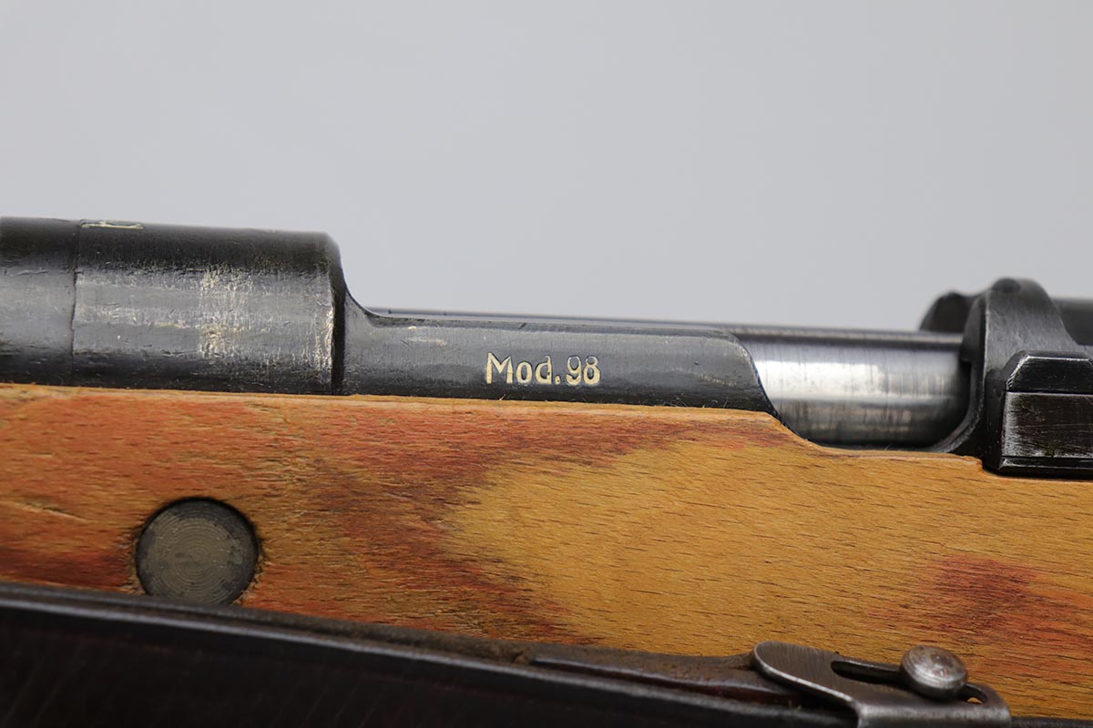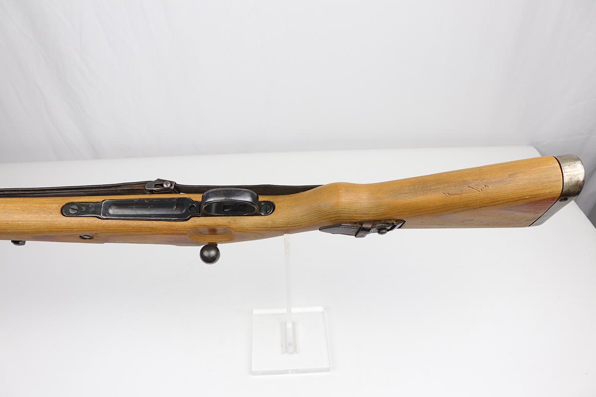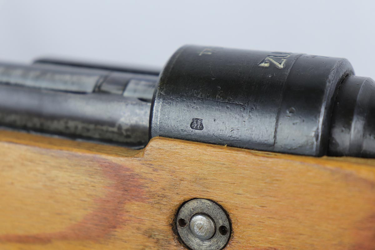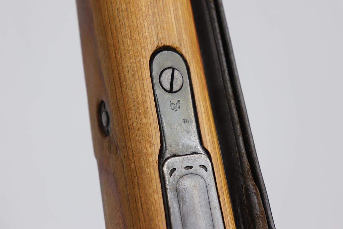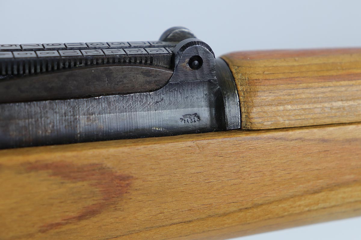 2/16/24 – This is an excellent and original Steyr produced K98 Kriegsmodell, marked with large letter ‘bnz 44’ on the receiver. It has typical late-war features for a Kriegsmodell such as no cleaning rod slot, no bayonet lug and no disassembly disc. Only numbered parts are the receiver and the bolt handle, which match. It’s common for these late examples to have many unnumbered parts. The metal is in good shape with about 90% blue remaining, as there’s minor thinning on all major surfaces. Stock is in fantastic condition with H proof for Heer Army and waffenamt. Correct ‘byf’ floorplate and ‘lxr’ marked magazine follower. Minty bore and excellent, original sling. The buttplate isn’t a perfect fit but this also can be commonly observed on these rifles.