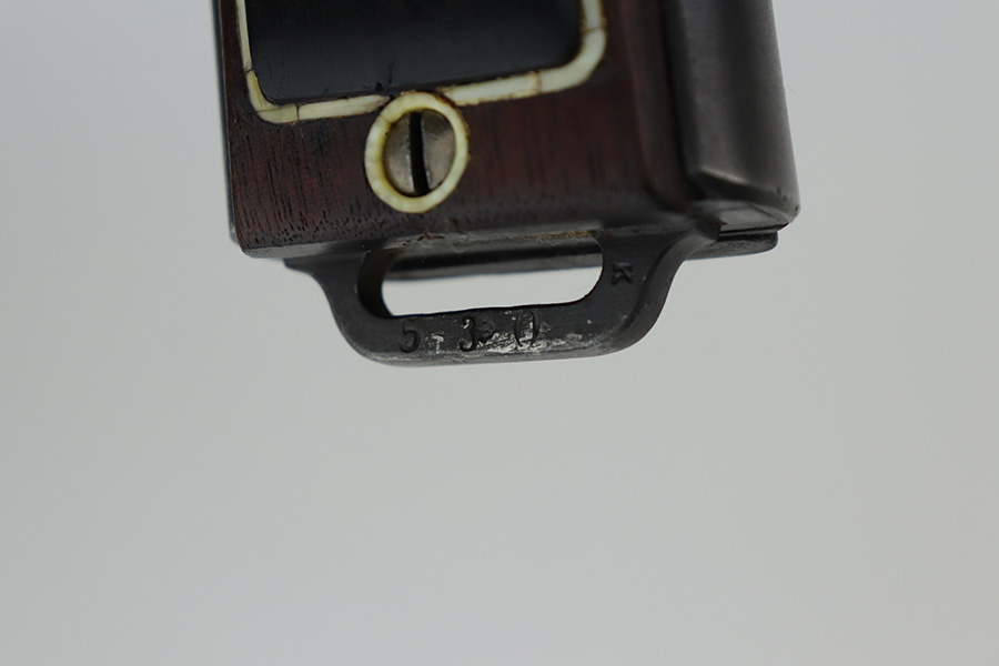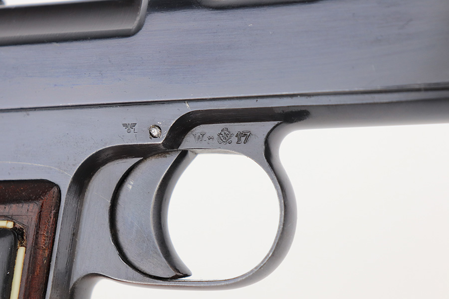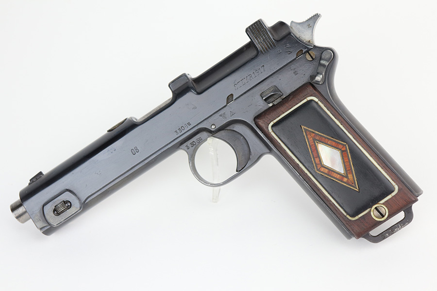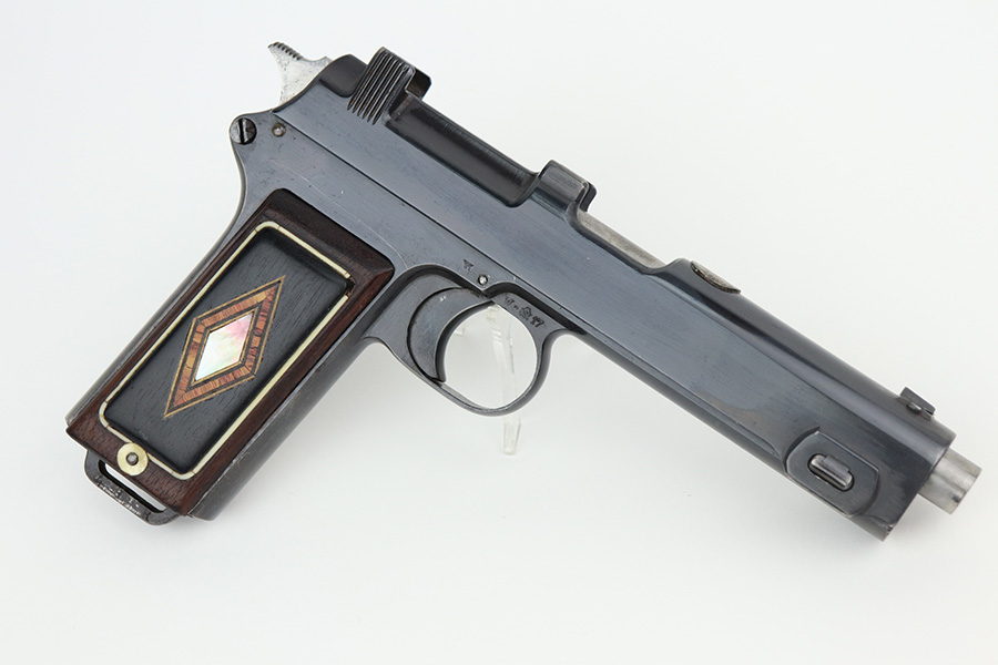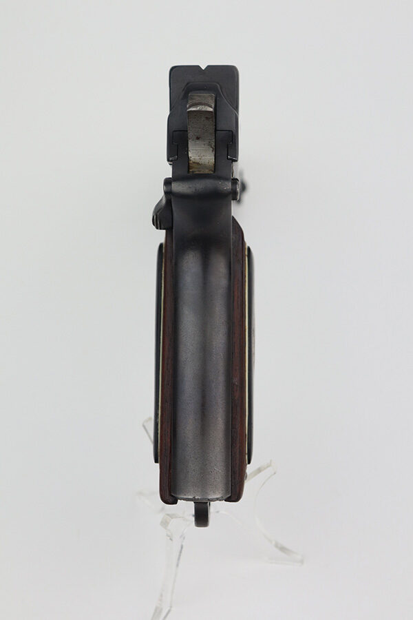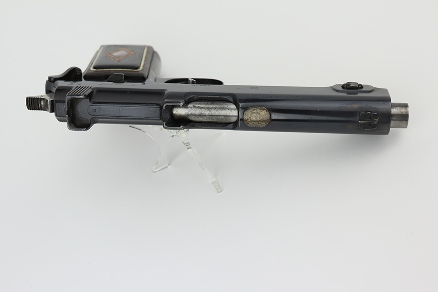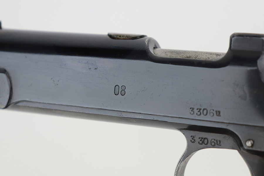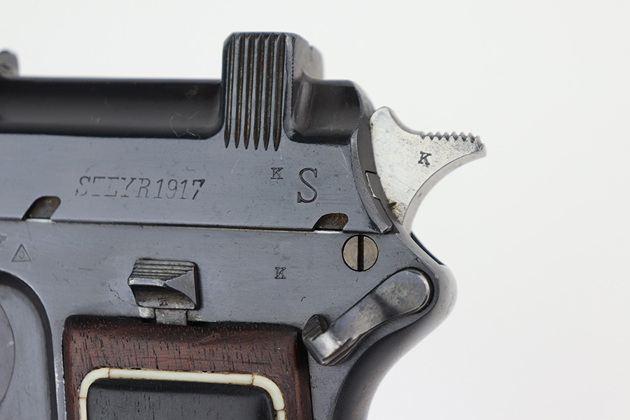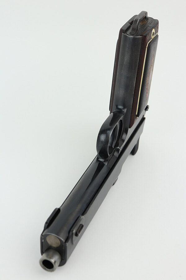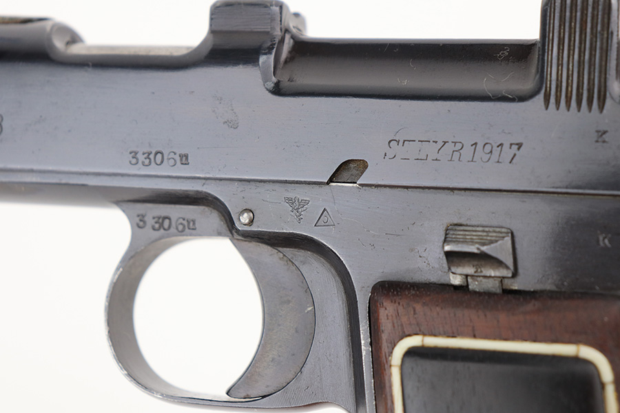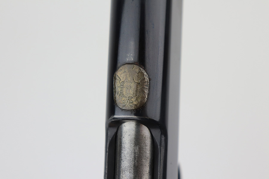 8/12/21 – This is an excellent example of a Steyr Model 1912 issued to the Nazi police force in the 1940’s. It is all matching, has a period-correct “Eagle N” firing proof, and has a Nazi police “Eagle L” proof on the right side of the frame. It has an “08” marking on the left side of the slide, indicating it was re-chambered in 9mm. Austrian proof on the right side of the trigger guard. This particular example also has period-correct embellished grips and an embellishment on the top of the slide. It looks like a drop of solder that was stamped with the Austrian Eagle. It has retained about 97% of its finish. There is very minor thinning and minor pin-pricking on the straps. A few scratches on the right side of the frame. An area of discoloration on the slide around the solder. Excellent bore – shiny with strong rifling.