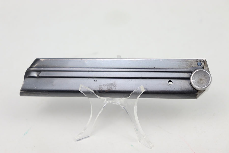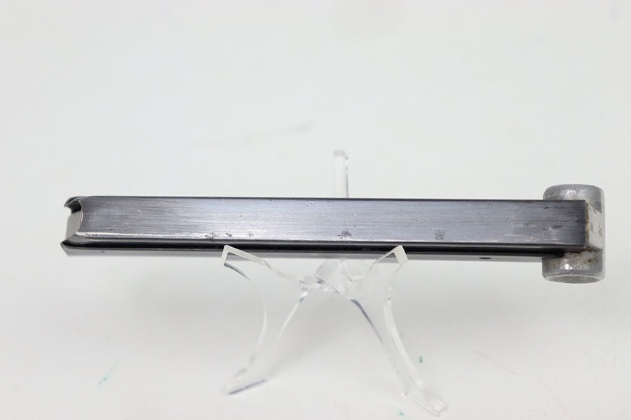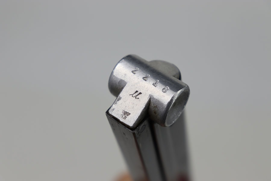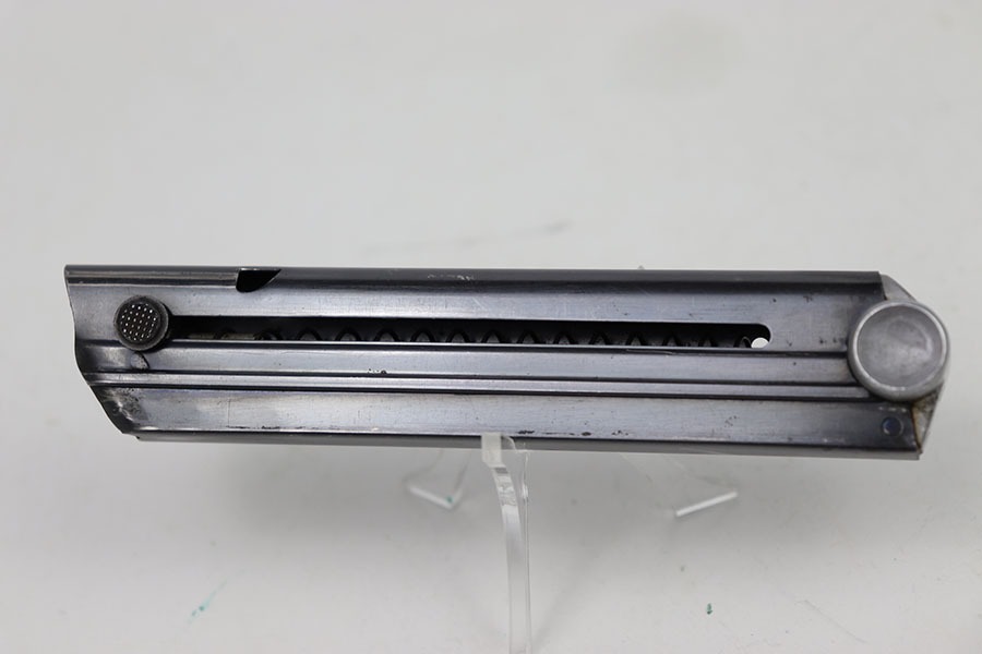 10/12/24 – This is an excellent example of a Stick Wing eagle 63 Luger magazine. The body of the magazine maintains most of it’s original high gloss blued finish with only minor spots of wear. The baseplate of the magazine is stamped with the serial number, “2218u”, with the stick wing eagle 63 marking below. This magazine has a strong and functional spring.