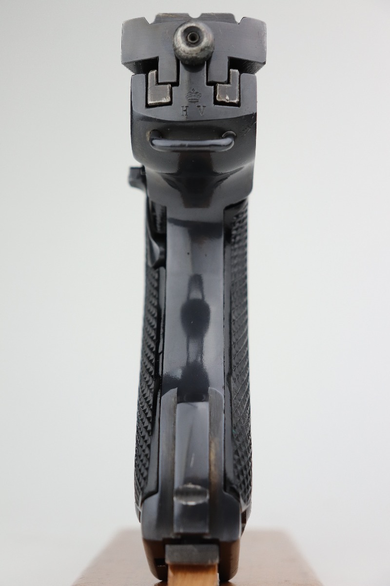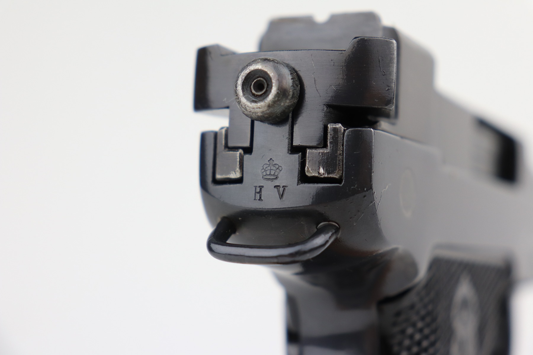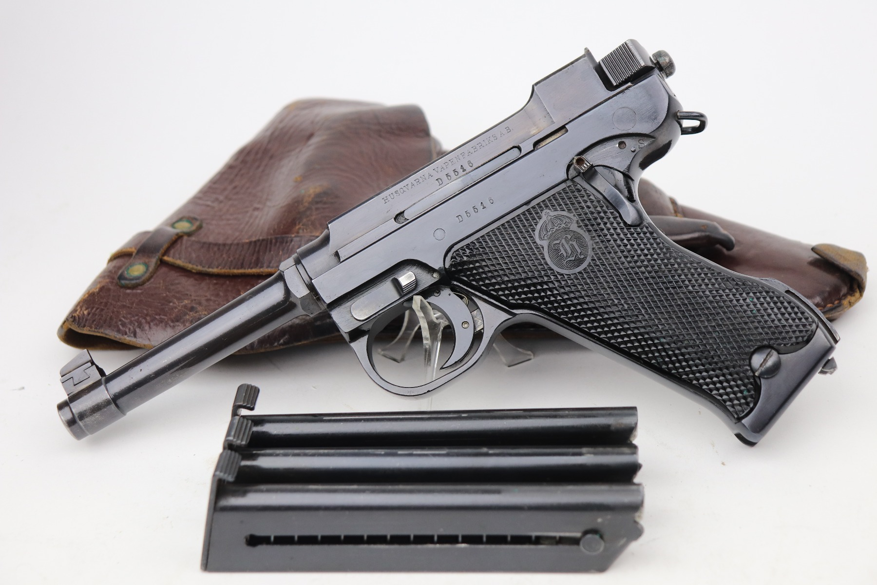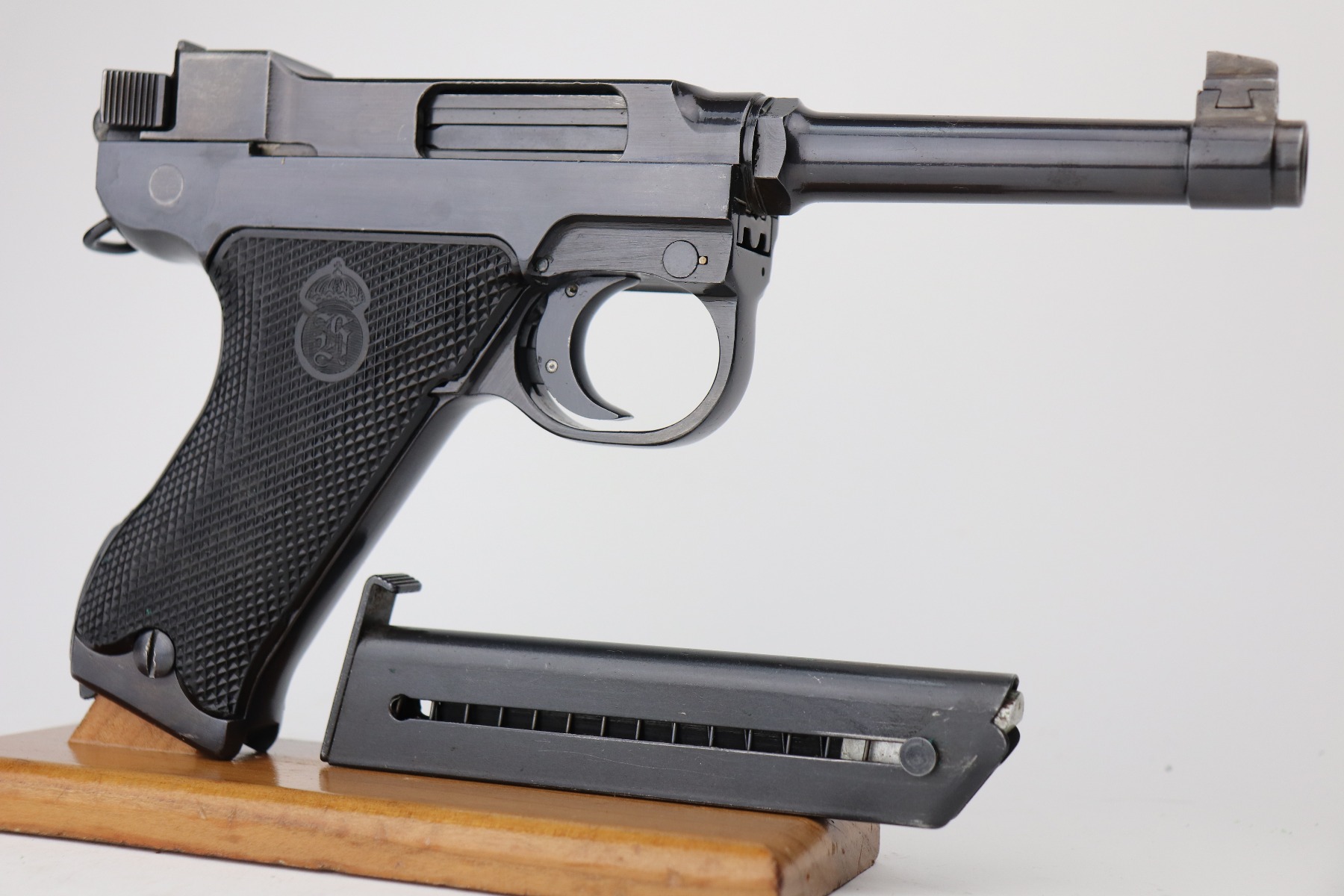 3/29/21 – This is a Husqvarna M40 pistol rig with holster, three magazines, cleaning rod and loading tool. This is a Swedish made copy of the Lahtl L-35, and this particular pistol was part of the Danish military contract that ran from 1944-1947. The Swedish army realized there would be a shortage of pistols in the event of large scale military mobilization in Europe. Originally adopting the Walther P38 in 1939, Germany’s entry into World War II stopped the export of P38s to Sweden. To compensate, Sweden adopted the Lahti pistol but was unable to import L-35-type guns because of Finland’s conflicts with the USSR. Production was licensed to Svenska Automatvapen AB but the immediate collapse of the company passed the contract to Husqvarna Vapenfabriks Aktiebolag. The first m/40s were delivered to the Swedish military by 1942 with slight differences from the Finnish L-35 Lahtis. The grips of the m/40 have the Husqvarna “crown H” motif engraved and the front sight was slightly larger. The barrel is also slightly longer on the m/40 than the Finnish Lahti with the m/40’s trigger guard being heavier, and the pistol does not have the loaded chamber indicator and lock-retaining spring of the Finnish Lahti. The finish on this one rates about 98%. There is minor wear around the muzzle and one spot at the back of the right side of the slide. Excellent grips. Excellent bore – shiny with strong rifling and very minor frosting in the grooves.