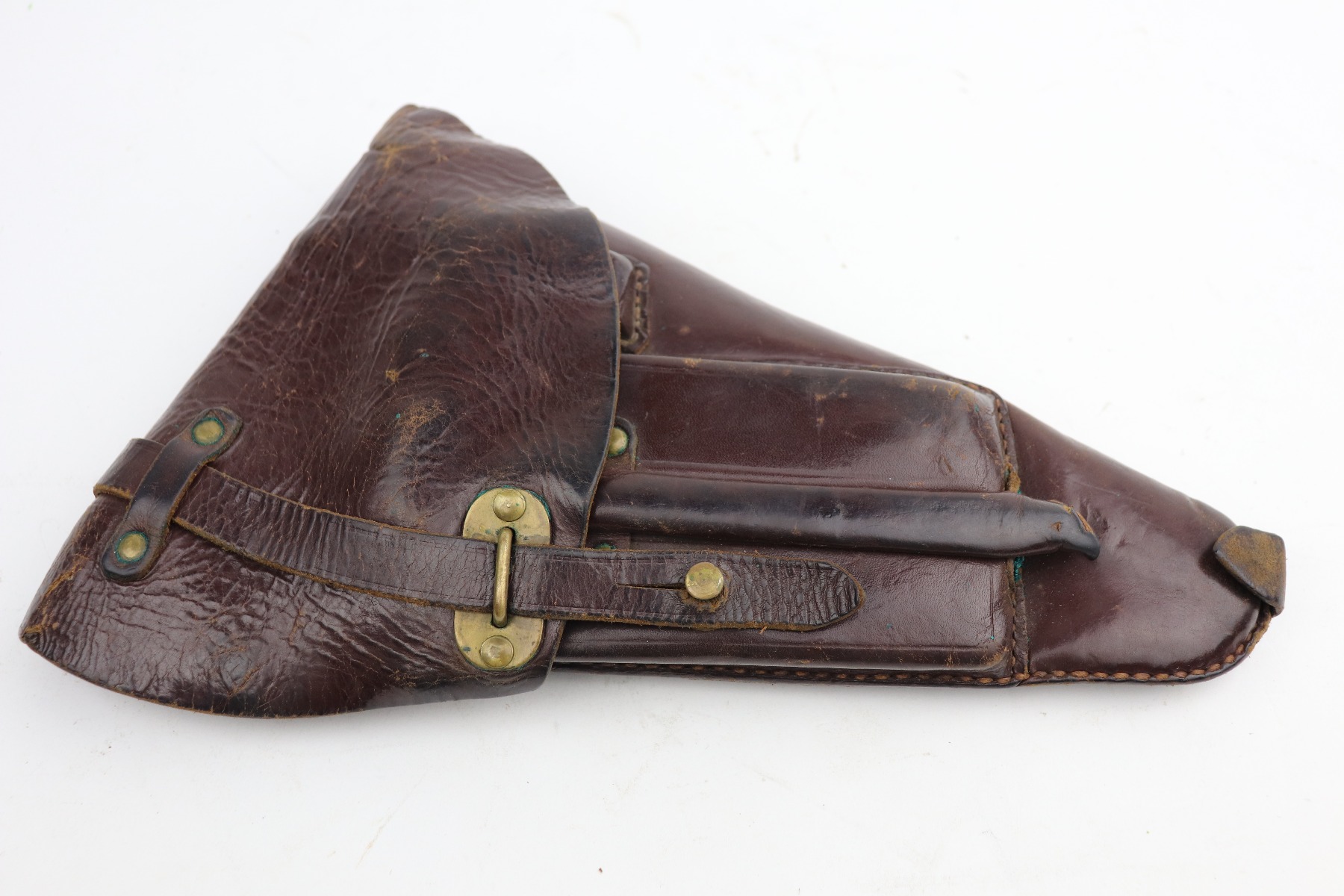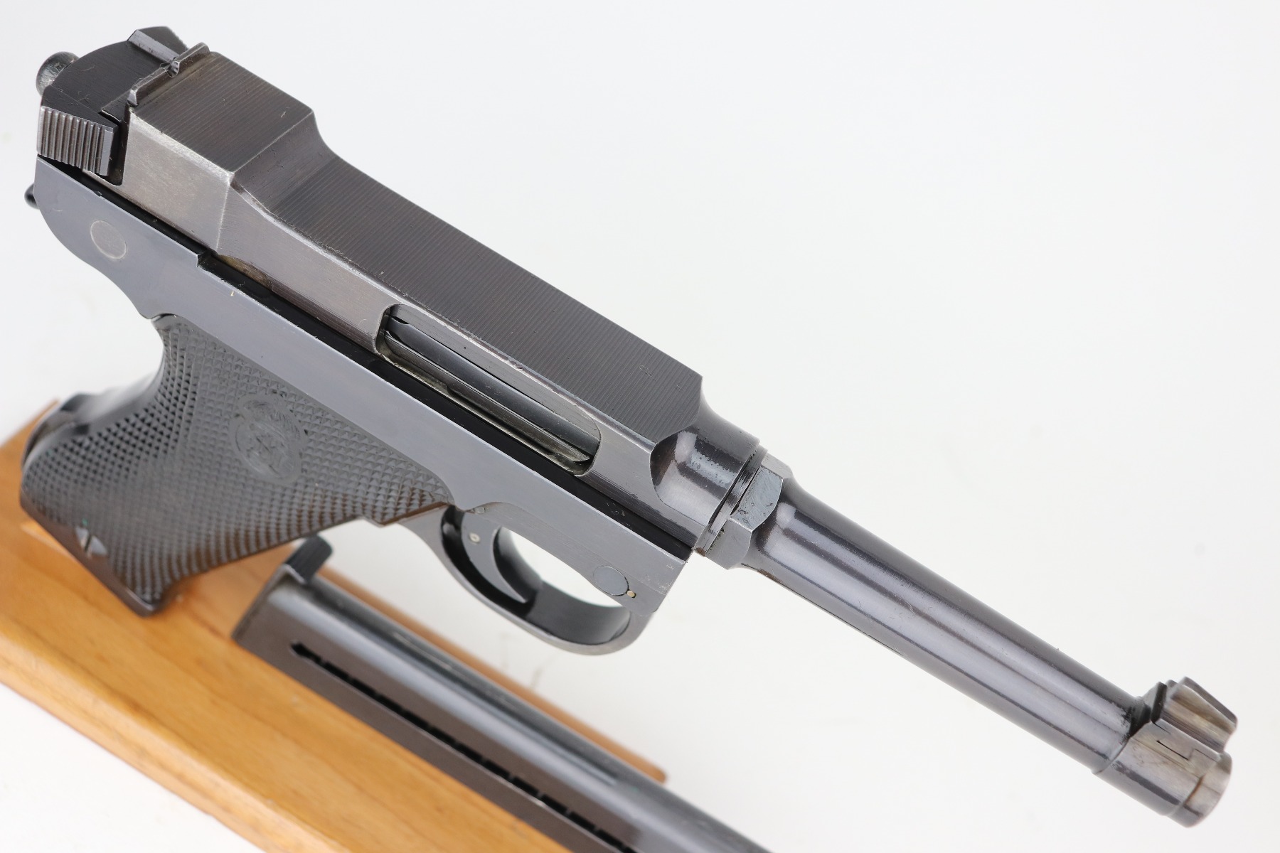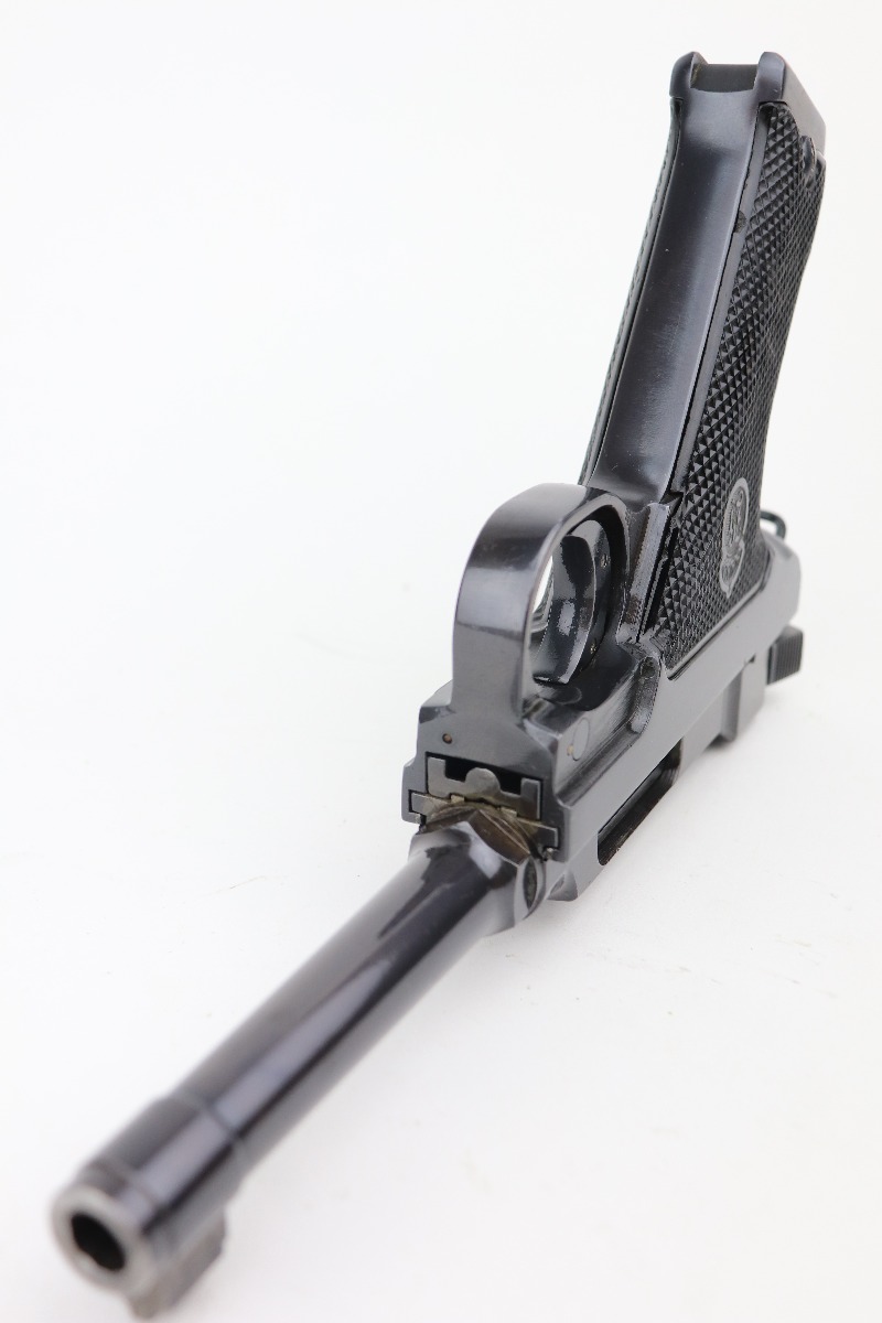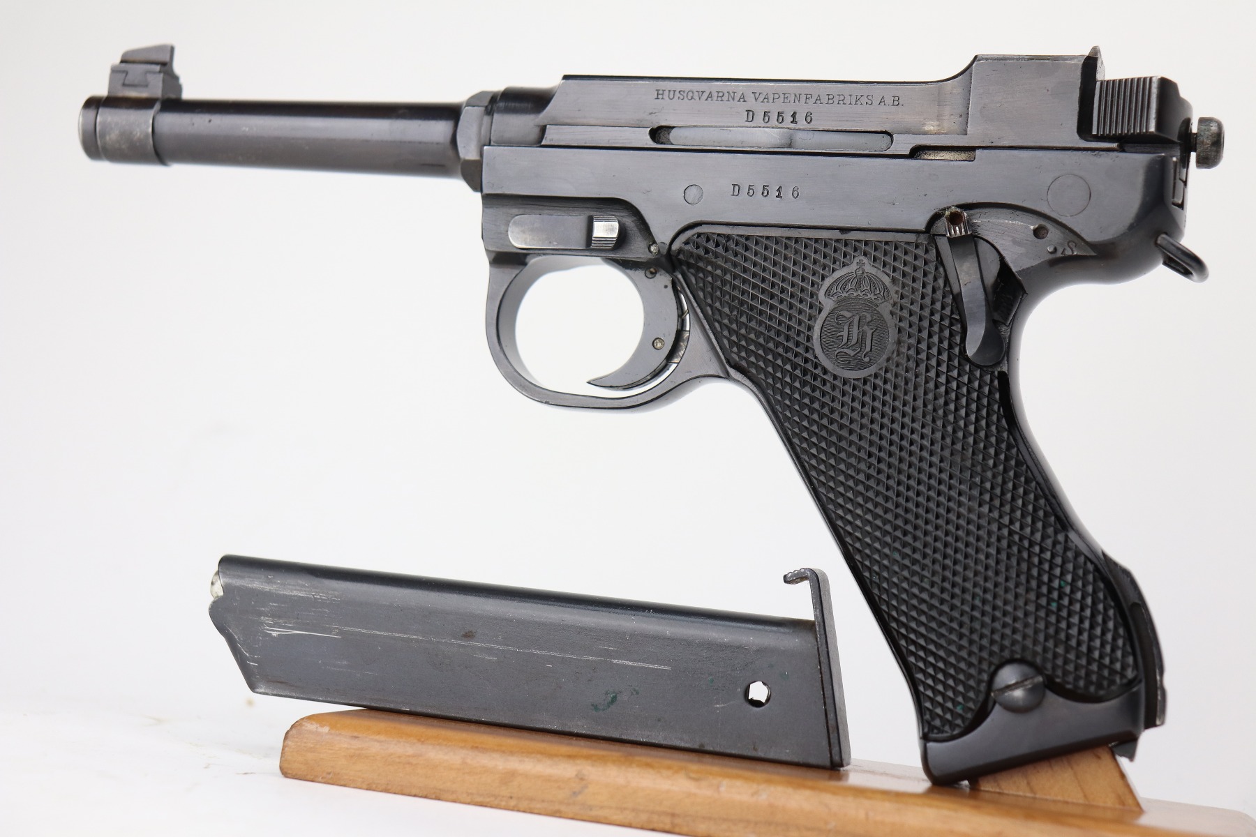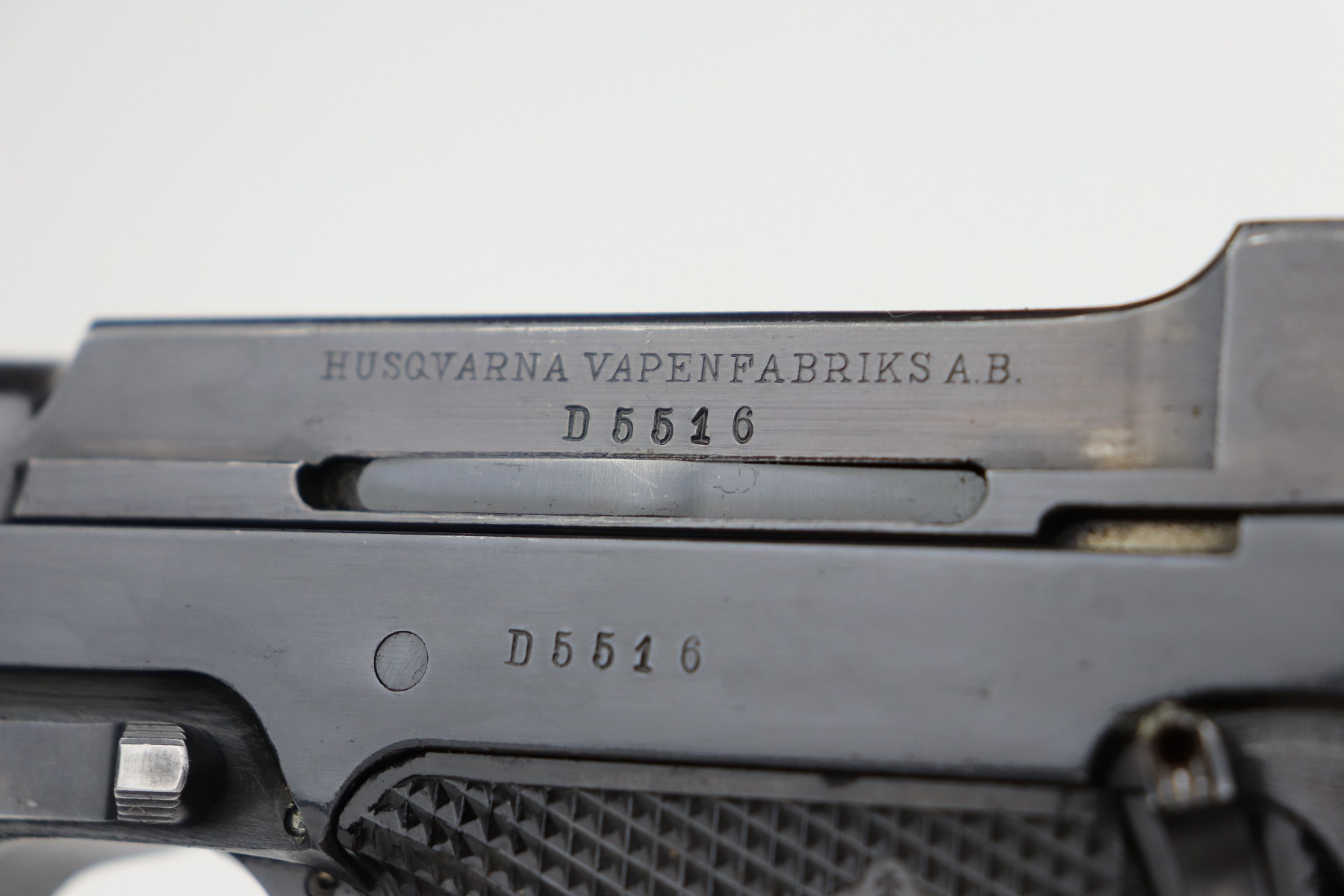 3/29/21 – This is a Husqvarna M40 pistol rig with holster, three magazines, cleaning rod and loading tool. This is a Swedish made copy of the Lahtl L-35, and this particular pistol was part of the Danish military contract that ran from 1944-1947. The Swedish army realized there would be a shortage of pistols in the event of large scale military mobilization in Europe. Originally adopting the Walther P38 in 1939, Germany’s entry into World War II stopped the export of P38s to Sweden. To compensate, Sweden adopted the Lahti pistol but was unable to import L-35-type guns because of Finland’s conflicts with the USSR. Production was licensed to Svenska Automatvapen AB but the immediate collapse of the company passed the contract to Husqvarna Vapenfabriks Aktiebolag. The first m/40s were delivered to the Swedish military by 1942 with slight differences from the Finnish L-35 Lahtis. The grips of the m/40 have the Husqvarna “crown H” motif engraved and the front sight was slightly larger. The barrel is also slightly longer on the m/40 than the Finnish Lahti with the m/40’s trigger guard being heavier, and the pistol does not have the loaded chamber indicator and lock-retaining spring of the Finnish Lahti. The finish on this one rates about 98%. There is minor wear around the muzzle and one spot at the back of the right side of the slide. Excellent grips. Excellent bore – shiny with strong rifling and very minor frosting in the grooves.
