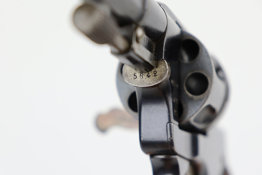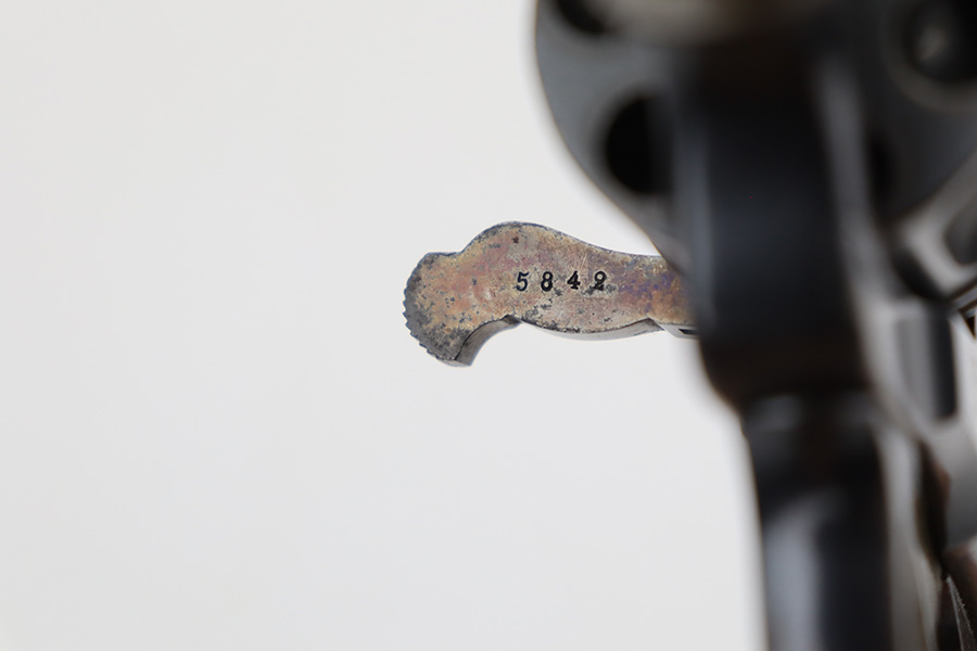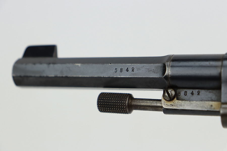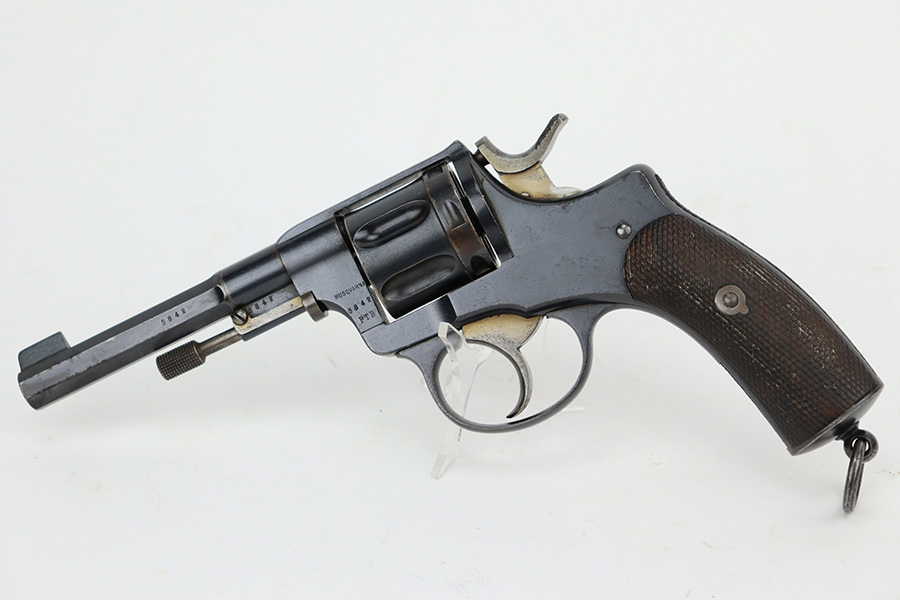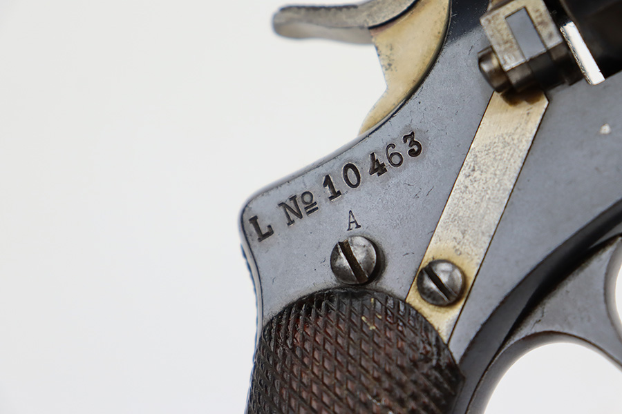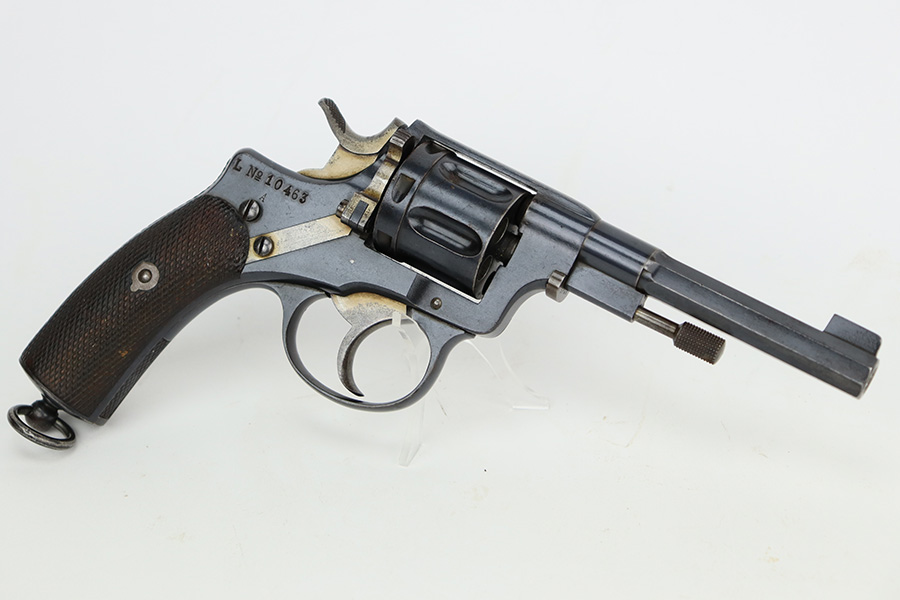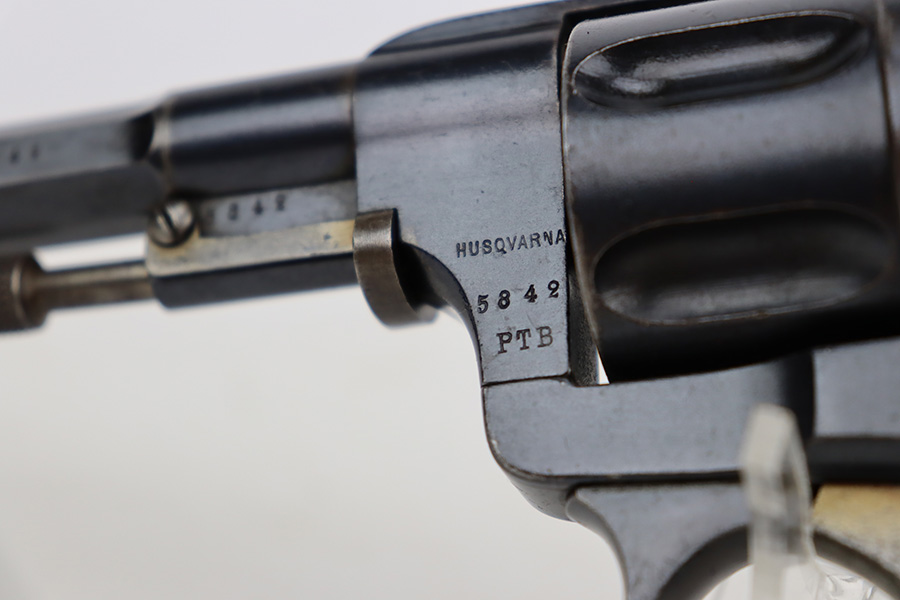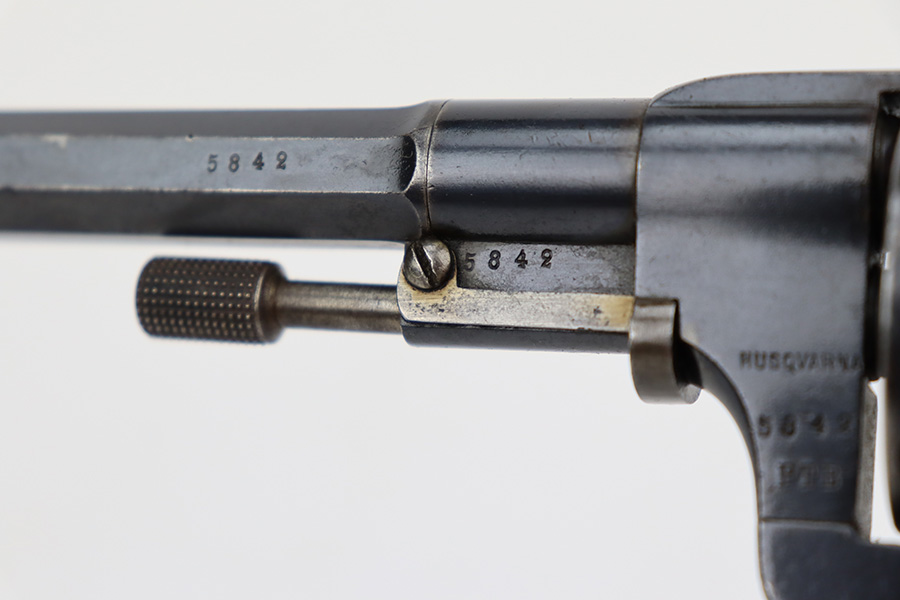 6/26/23 – This is an excellent example of a scarce double action revolver that was chosen by the Swedish army as an official sidearm. Manufactured by Husqvarna, the revolver has a 6 shot Nagant design. The barrel is half round and half octagon and it is fitted with checkered walnut grips with a lanyard ring on the butt. The back strap has a recessed checkered piece of walnut inset and the lower portion of the front strap. The left side of the cylinder ahead of the frame is marked “HUSQVARNA / PTB” and the right rear of the frame is marked “L No 10463 / A”. PTB were the inspectors initials, and the ‘L’ stands for “Landstormen” who were like a militia: ex-regular army soldiers over the age of 30 assigned to a Landstormen district and armed by the regular army regiment to which they were assigned. This one is all matching and has minor wear and freckling around the muzzle. Some additional thinning and patina on the cylinder. Good mechanics.