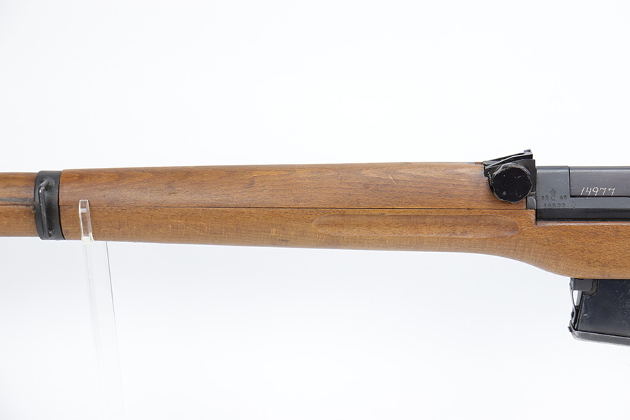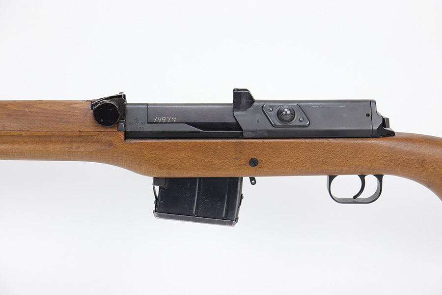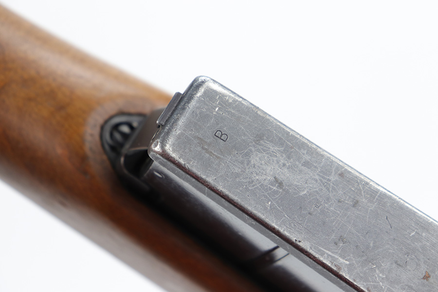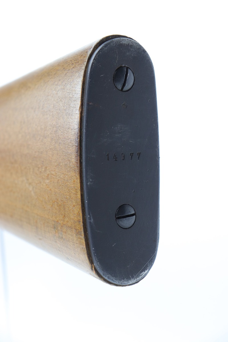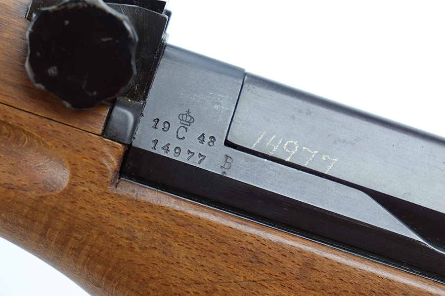 6/13/23 – This is an excellent, original Swedish AG 42 rifle. These were produced by AB C.J. Ljungmans Verkstäder company beginning in 1942 and roughly 30,000 were made. This rifle was made in 1943 and has matching numbered parts on receiver, buttplate and bolt. Right side of receiver is marked ‘S.S’, which denotes inspection by Sten W. Stenmo. There is what appears to be a unit marking on the front sight. The rifle is in excellent condition, with some light spotty wear along the barrel and a few light scuffs on the receiver. Minty stock has the disc intact and Swedish crown proofs on the wrist. Smooth operation and comes with an original cleaning rod. Mint bore. Import mark on the underside of barrel.