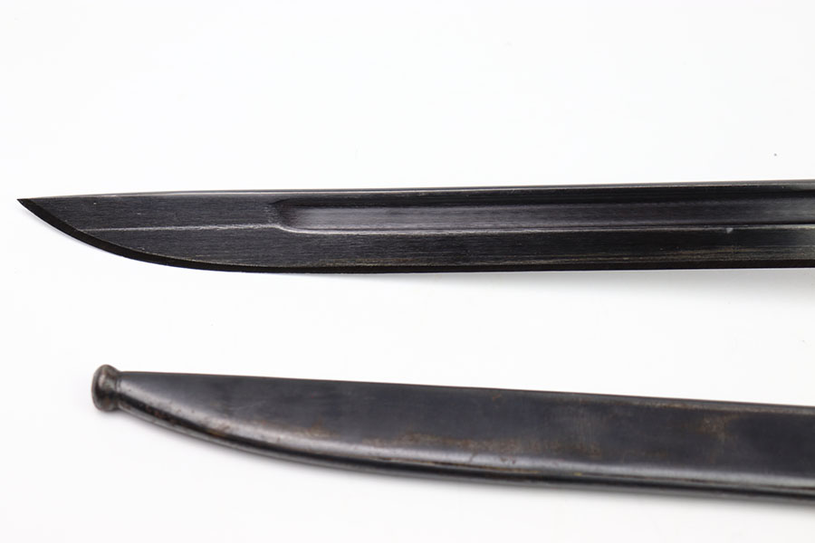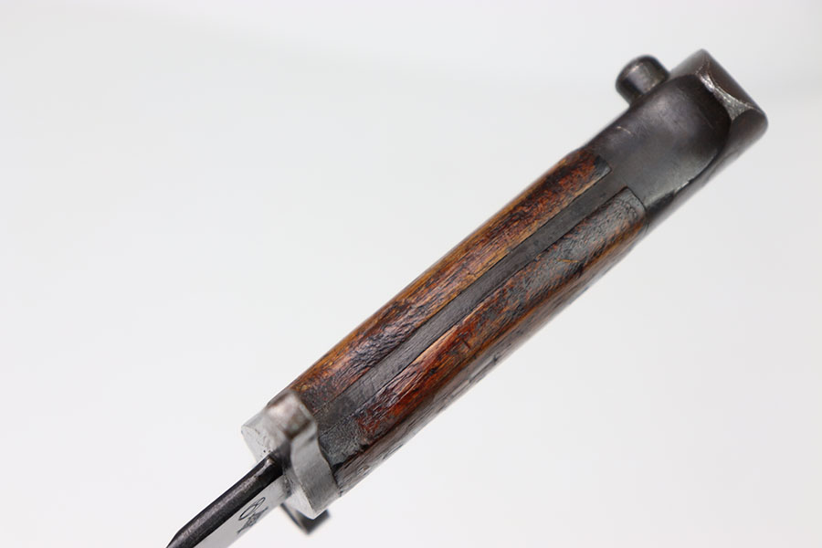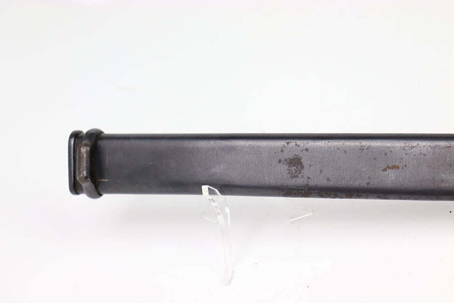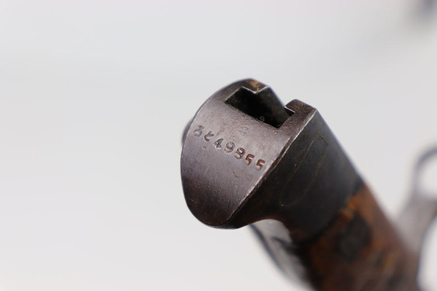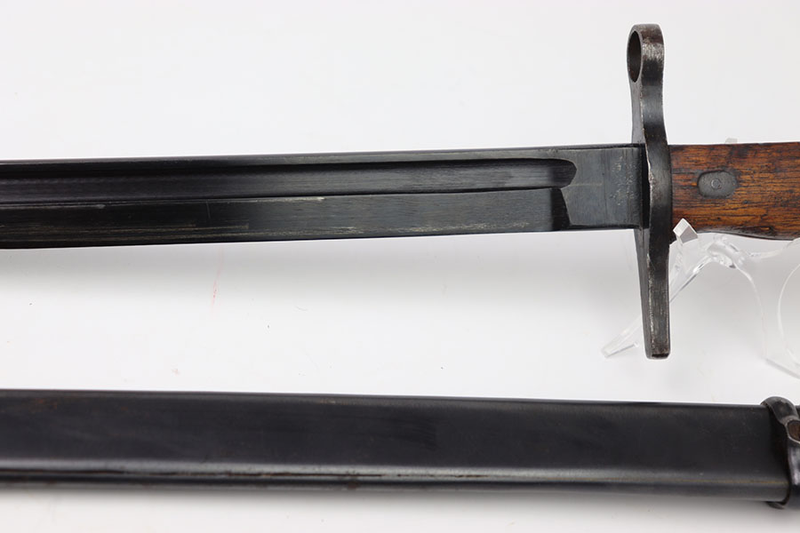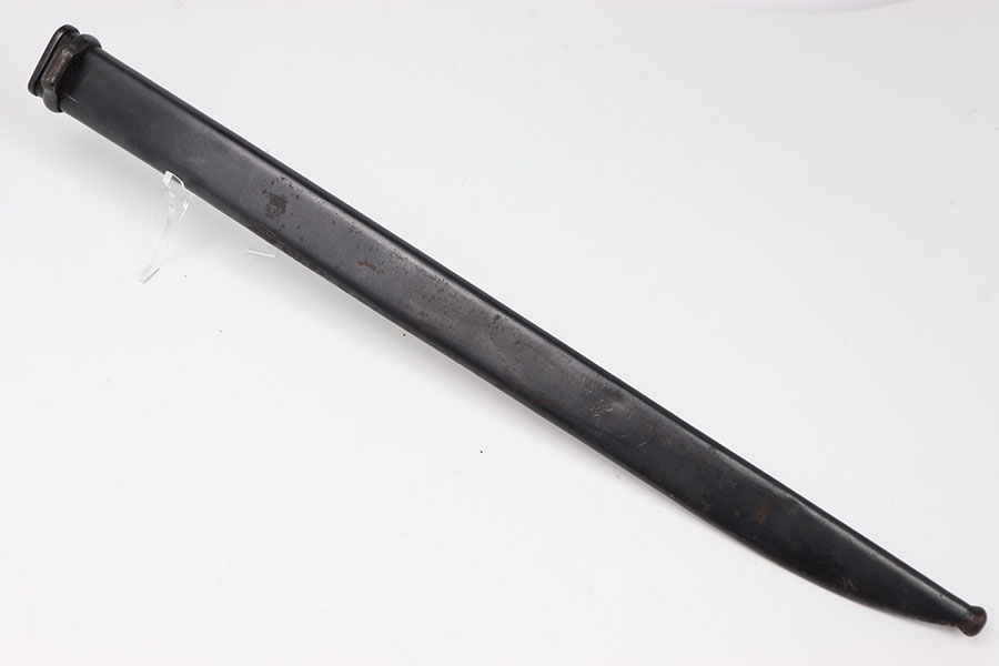 3/13/24 – This is a WW2 original Type 30 Arisaka rifle bayonet by Toyota Automatic Loom Works. The bayonet is cited in Labar’s book as LB-143 Variation D. Maker stamped on the base of the blade, which is in near minty condition with minor edge wear. Most of its original bluing remains. Features a cross guard and bird’s head pommel with excellent finish throughout, some minimal scratches. Contoured wood grips are excellent with screws and washers. Comes with a metal cone-tipped scabbard. The scabbard has some minor spots of patina and pinpricking. There is one deeper scratch that runs the length of the scabbard on the side that the edge of the blade goes on, this can be seen in the photos but overall great condition.