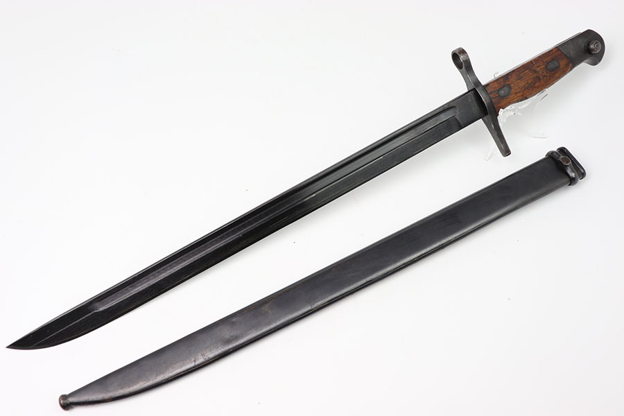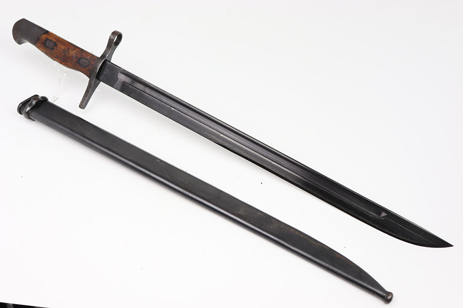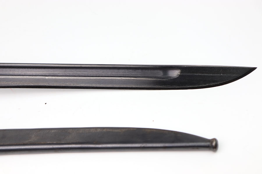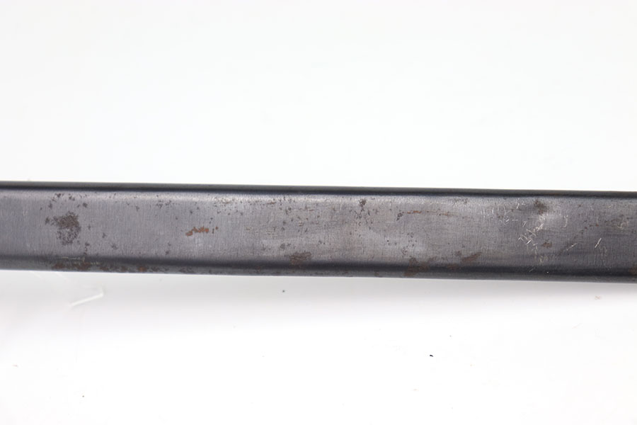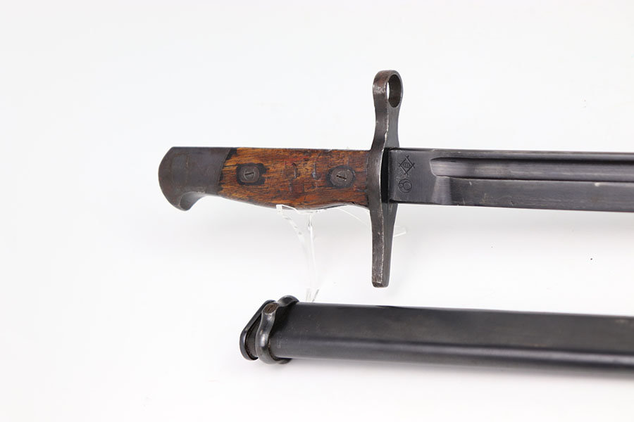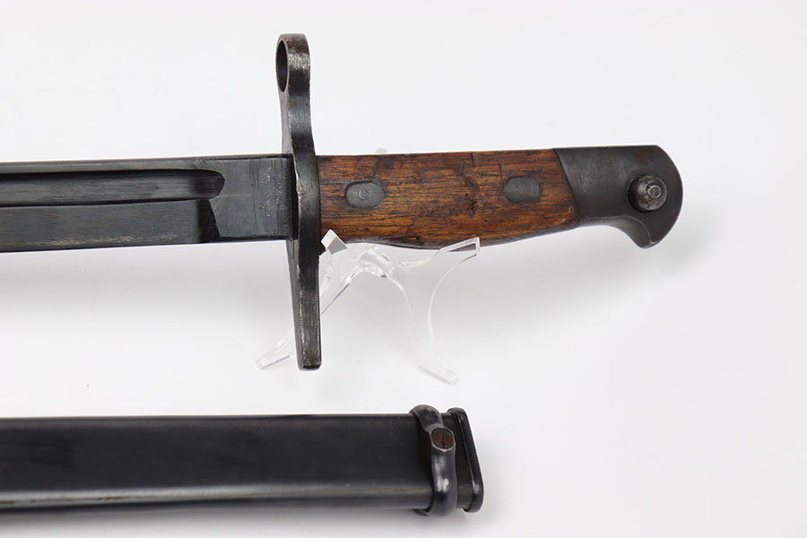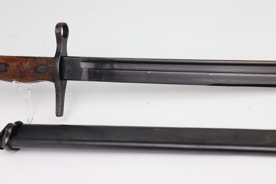 3/13/24 – This is a WW2 original Type 30 Arisaka rifle bayonet by Toyota Automatic Loom Works. The bayonet is cited in Labar’s book as LB-143 Variation D. Maker stamped on the base of the blade, which is in near minty condition with minor edge wear. Most of its original bluing remains. Features a cross guard and bird’s head pommel with excellent finish throughout, some minimal scratches. Contoured wood grips are excellent with screws and washers. Comes with a metal cone-tipped scabbard. The scabbard has some minor spots of patina and pinpricking. There is one deeper scratch that runs the length of the scabbard on the side that the edge of the blade goes on, this can be seen in the photos but overall great condition.