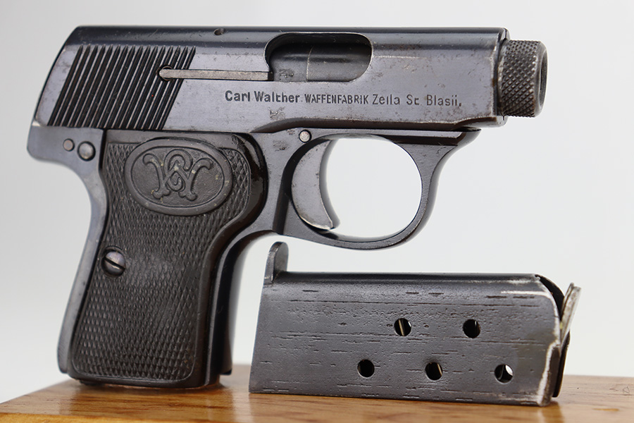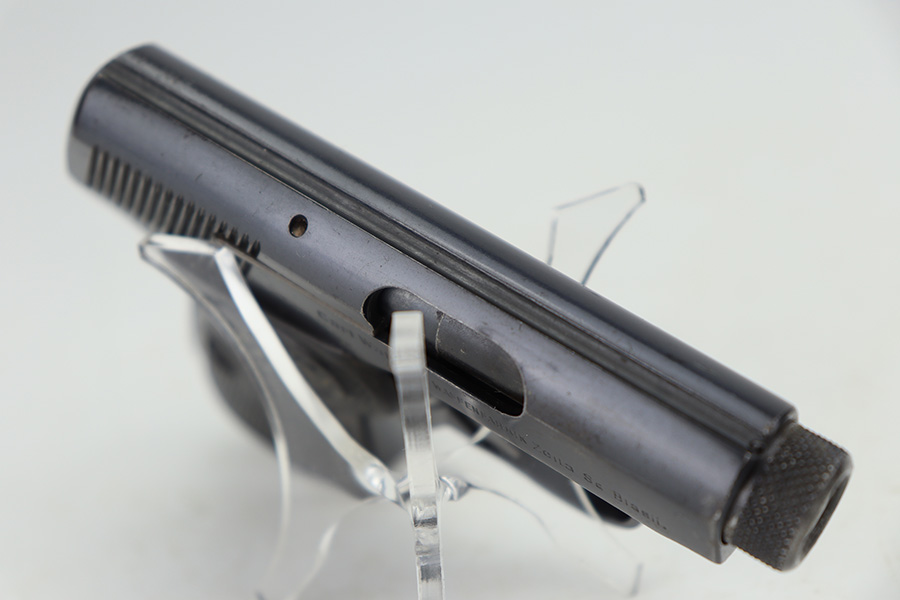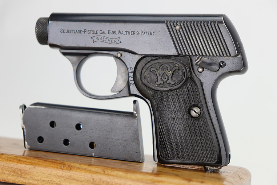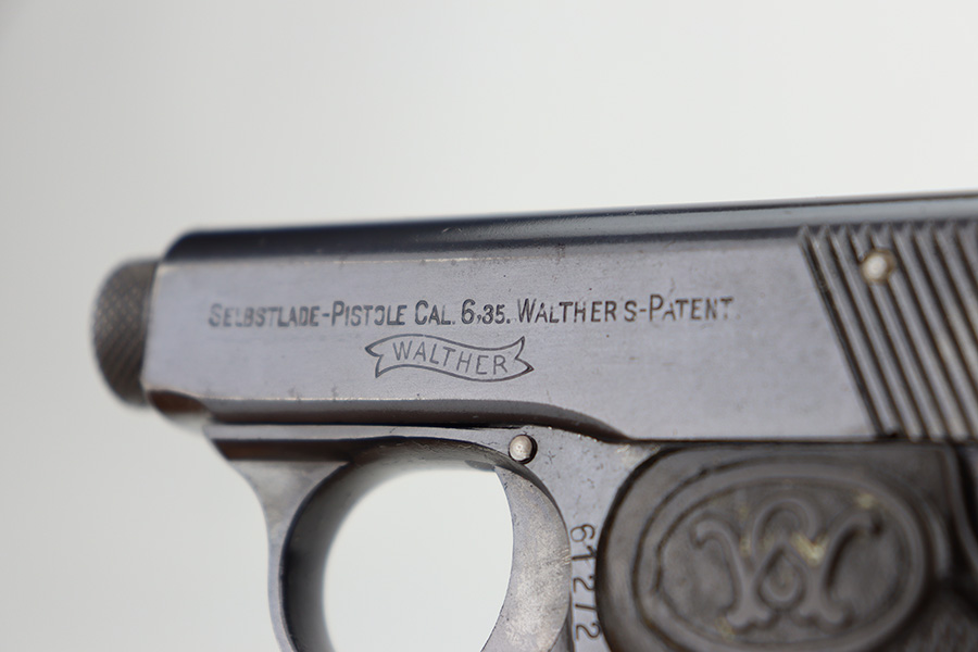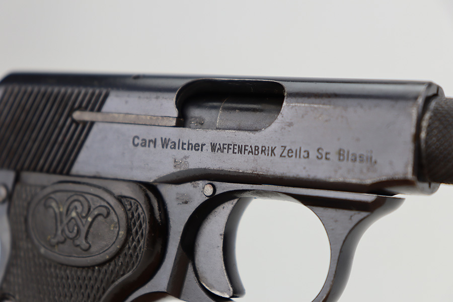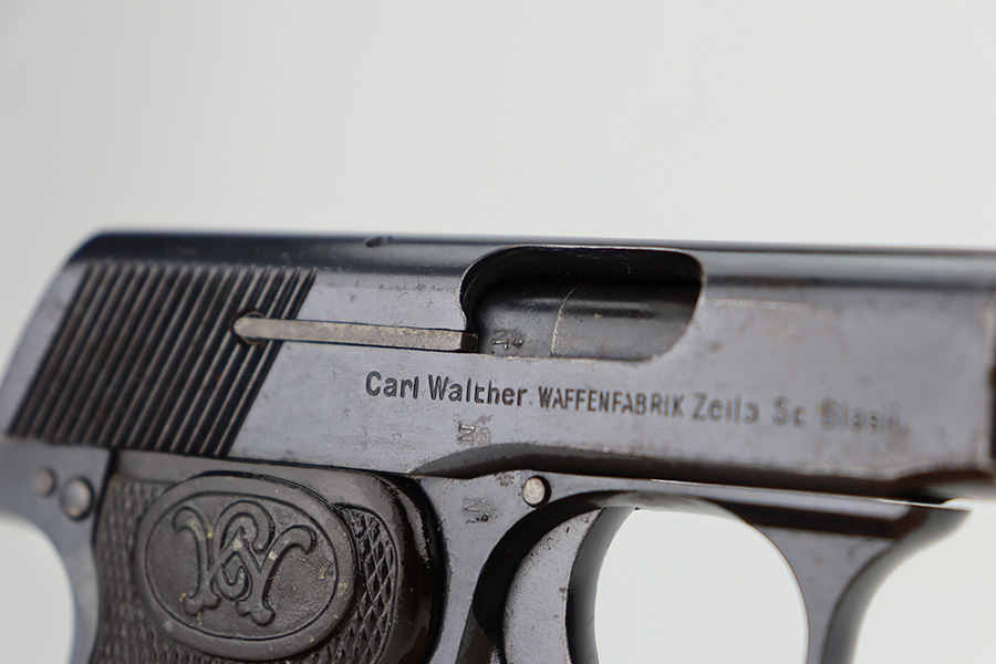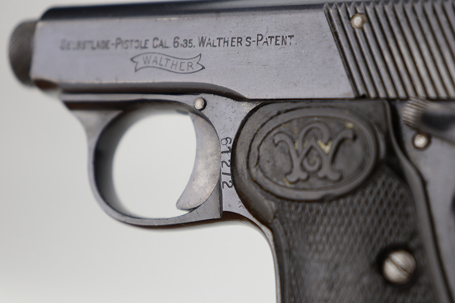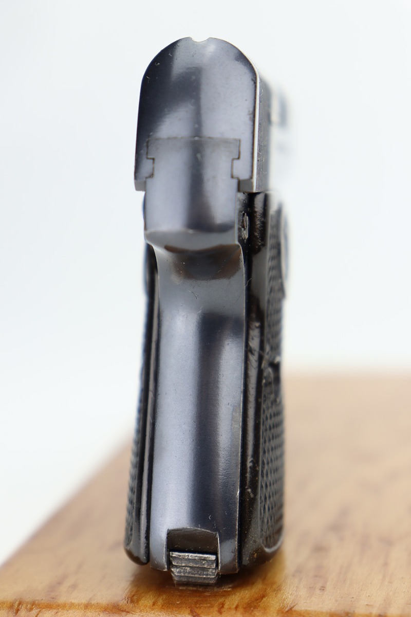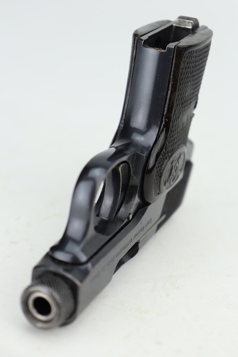 1/12/24 – This is an excellent example of a scarce, transitional Walther Model 2/5 from about 1915. It is in the correct serial range for this variation and is identified as having characteristics of both models, as the Model 2 transitioned to the Model 5. Its original finish rates about 97% with very minor high edge wear and some very light freckling on the right side of the slide. Fitted with very nice period-correct grips and comes with one proper magazine. Mint bore.