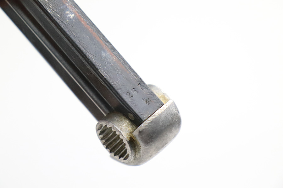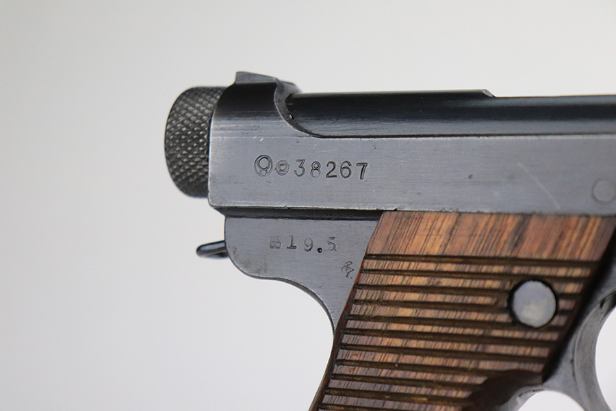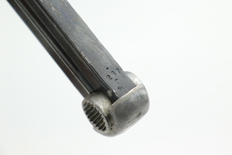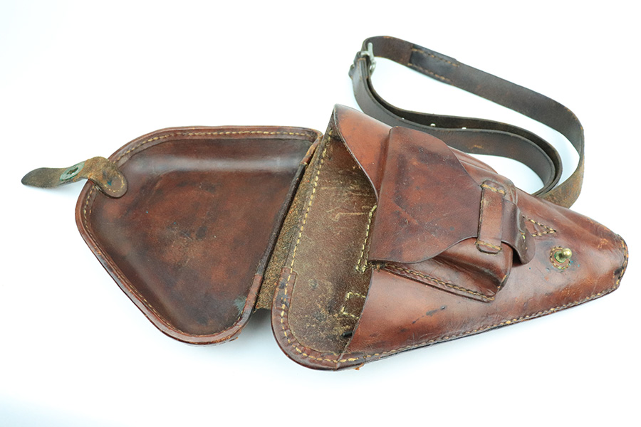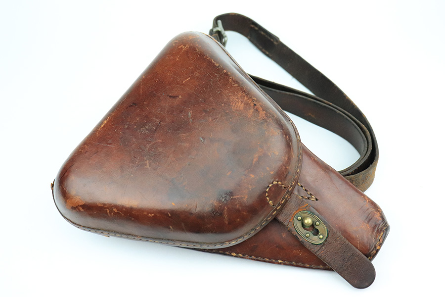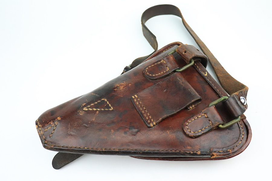 7/14/22 – This is a complete Type 14 Nambu rig in excellent, original condition with early style holster, two matching magazines, cleaning rod and spare firing pin. The pistol is all matching and correct, including the grips, with about 98% blue remaining. There is only minor edge holster wear, mostly towards the back of the slide on either side. Mint bore, and sharp grips. The holster is in very good condition with the earlier style leather, and includes the original shoulder strap. There is minor cracking at the edges of the flap hinge, and Kanji marked internally.