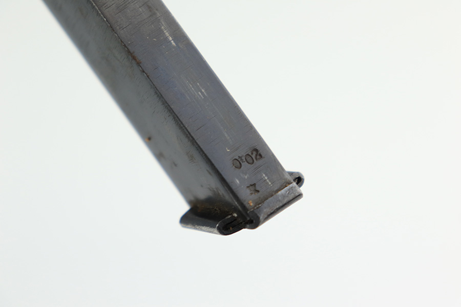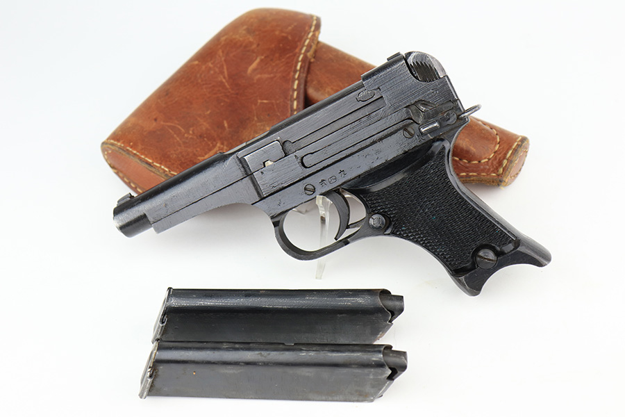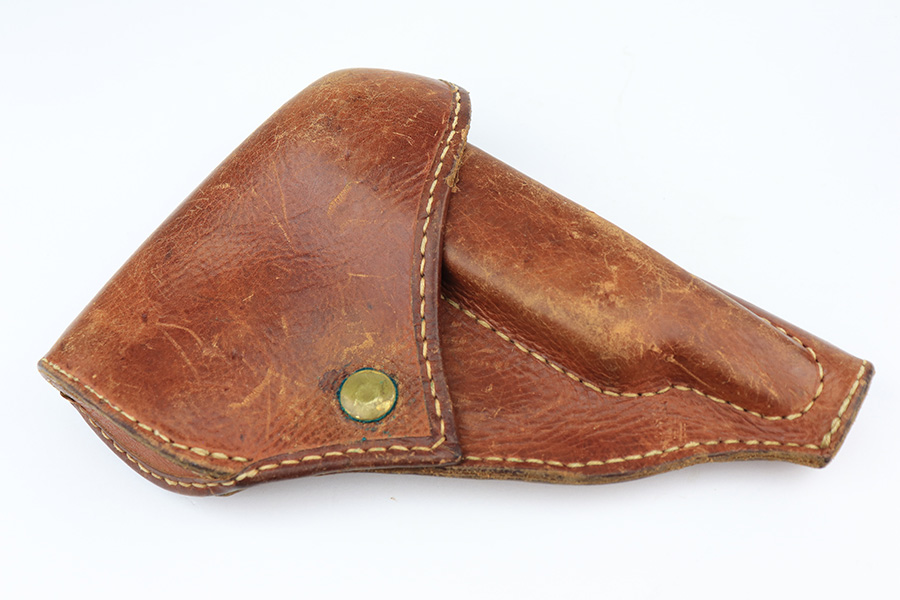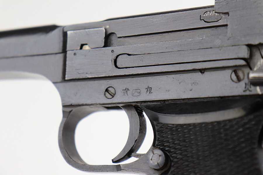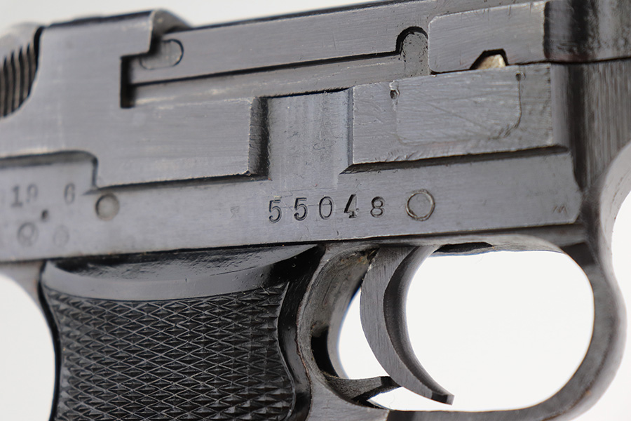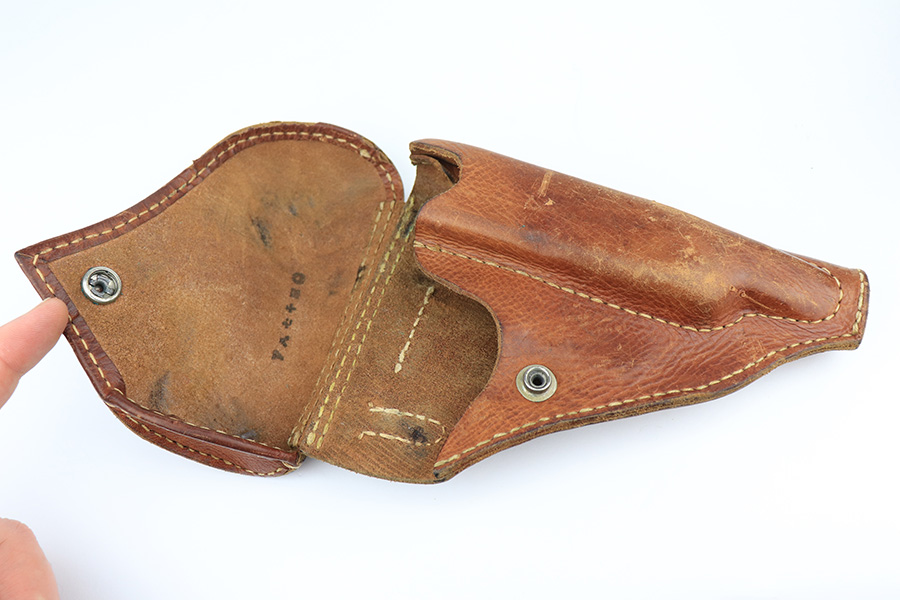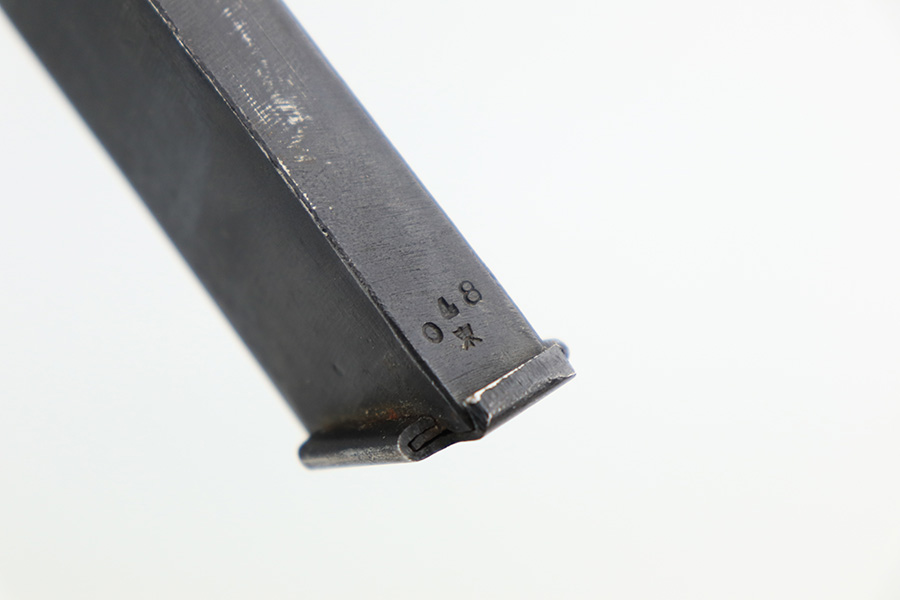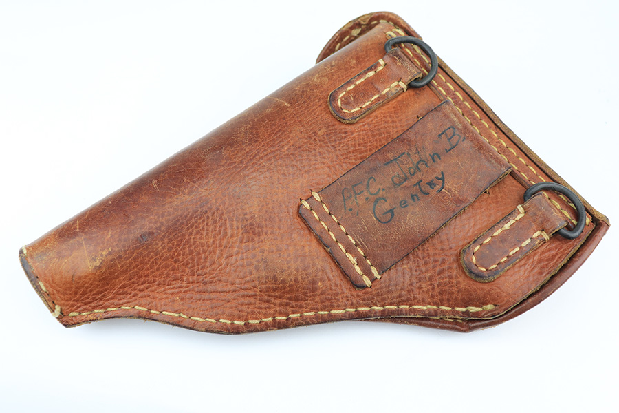 4/18/22 – This is an excellent Japanese Type 94 Nambu with holster, spare magazine and one of the original, matching magazines. The pistol has about 97% of the original blue remaining, with most of the wear on the underside of the frame (above the trigger guard). Minty bore and excellent grips. One magazine is matching numbered to the pistol, the other is a period original spare with mismatched serial. The rig is completed by a very nice holster with sharp Kanji inside. The holster loop has the name P.F.C. John B. Gentry written on it, it’s possible more info can be found out about this GI.
