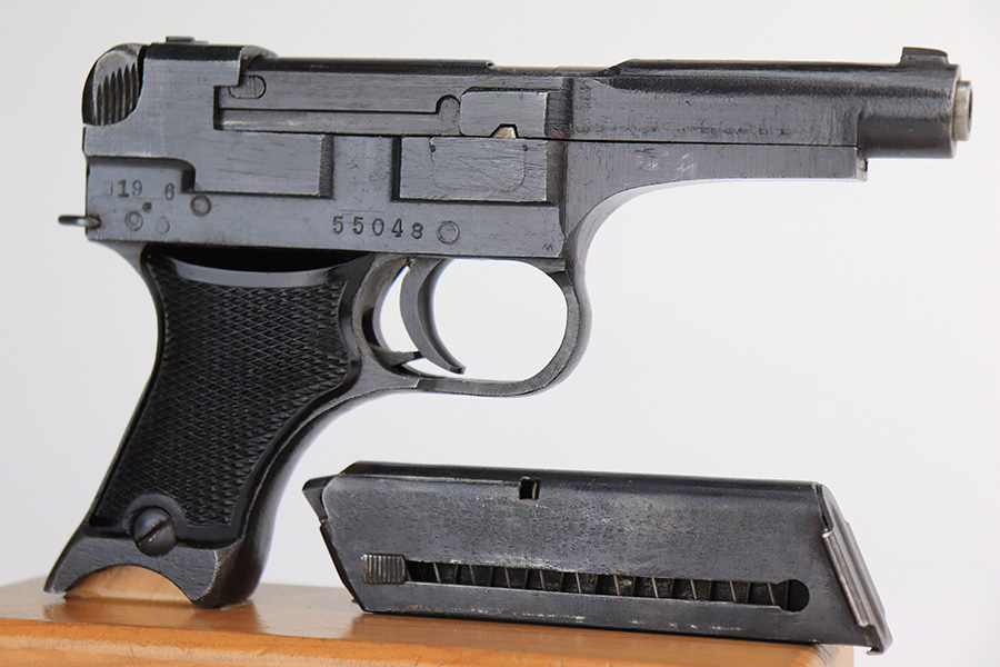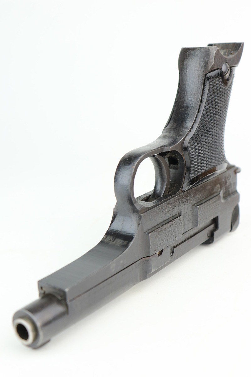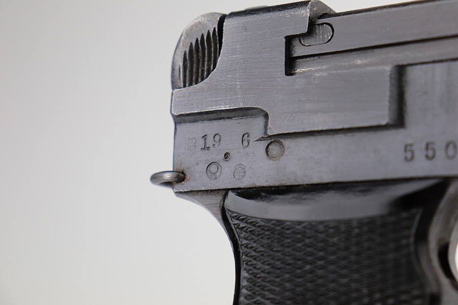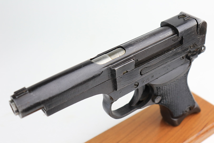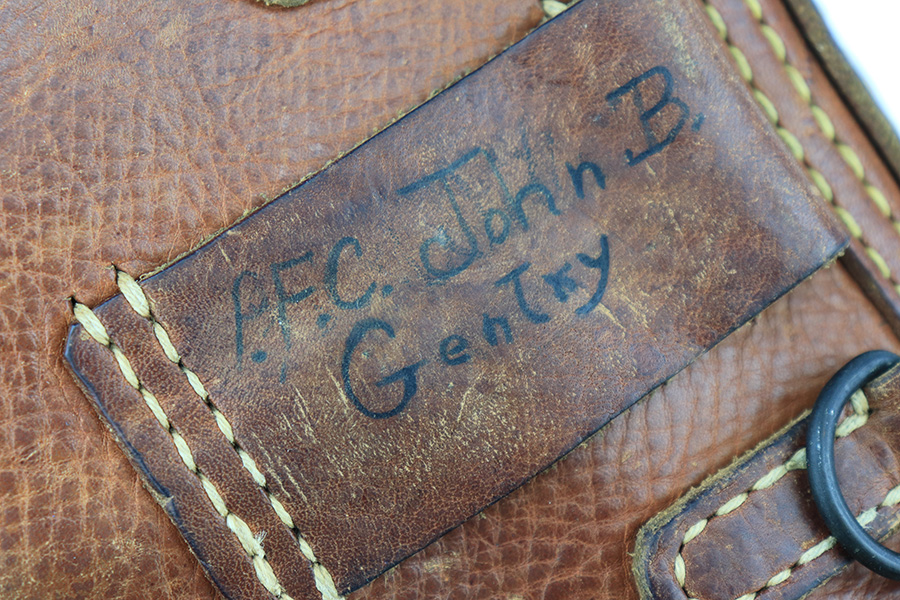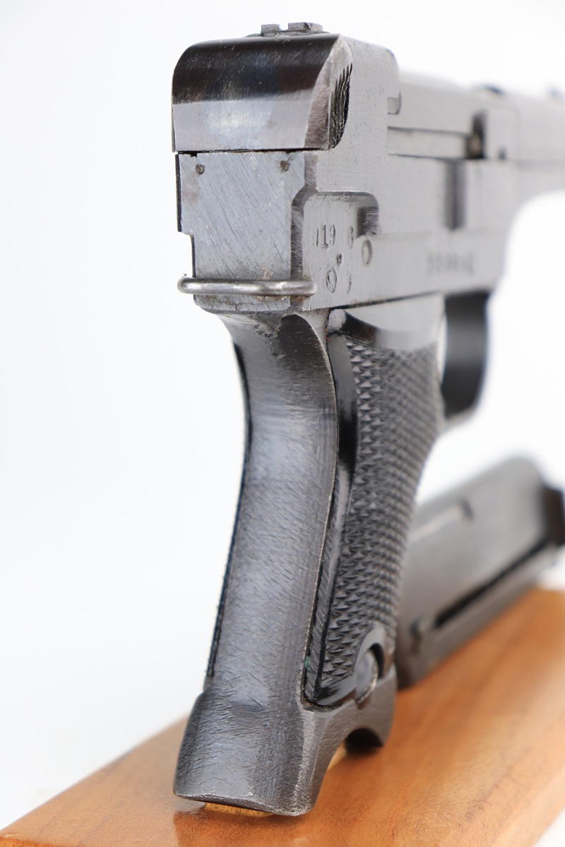 4/18/22 – This is an excellent Japanese Type 94 Nambu with holster, spare magazine and one of the original, matching magazines. The pistol has about 97% of the original blue remaining, with most of the wear on the underside of the frame (above the trigger guard). Minty bore and excellent grips. One magazine is matching numbered to the pistol, the other is a period original spare with mismatched serial. The rig is completed by a very nice holster with sharp Kanji inside. The holster loop has the name P.F.C. John B. Gentry written on it, it’s possible more info can be found out about this GI.