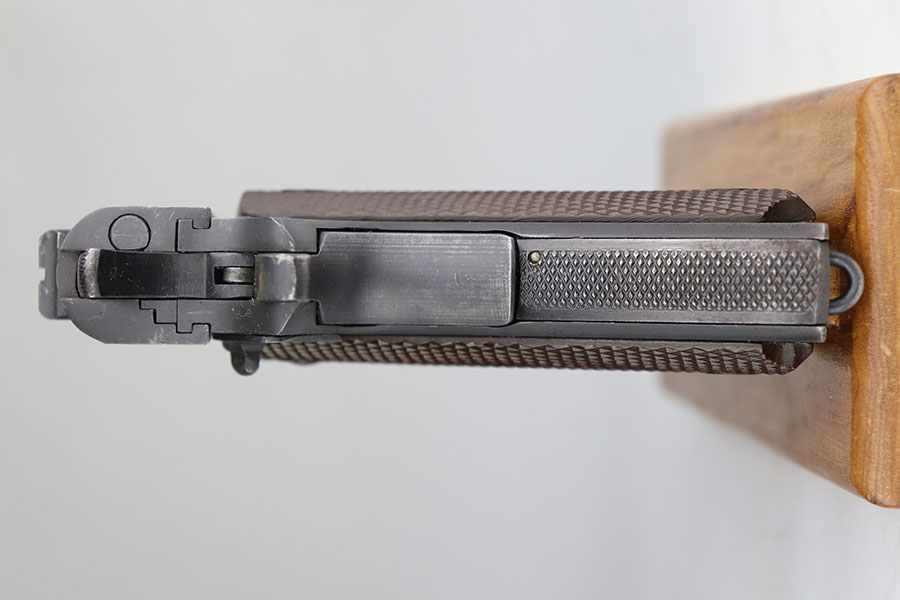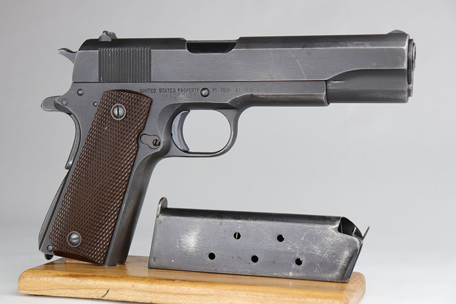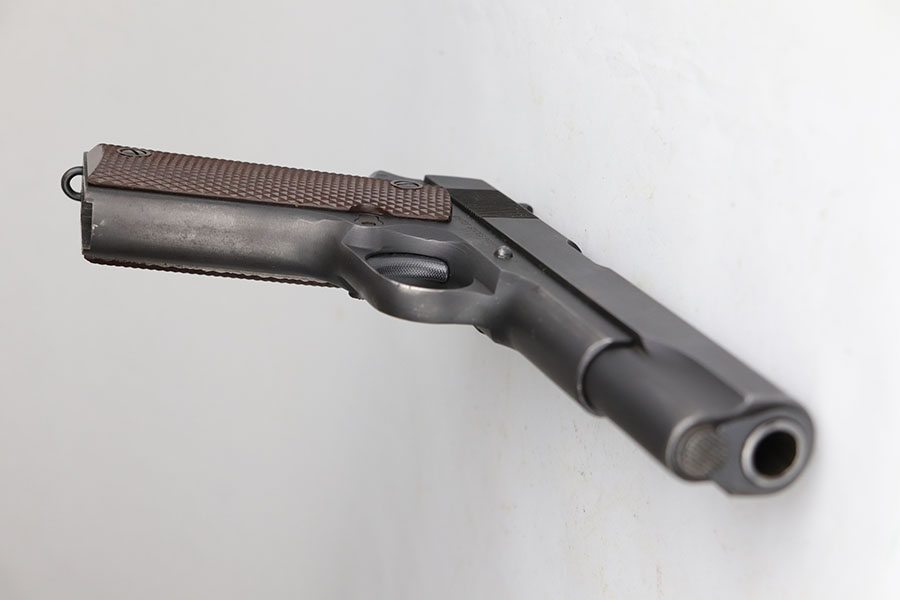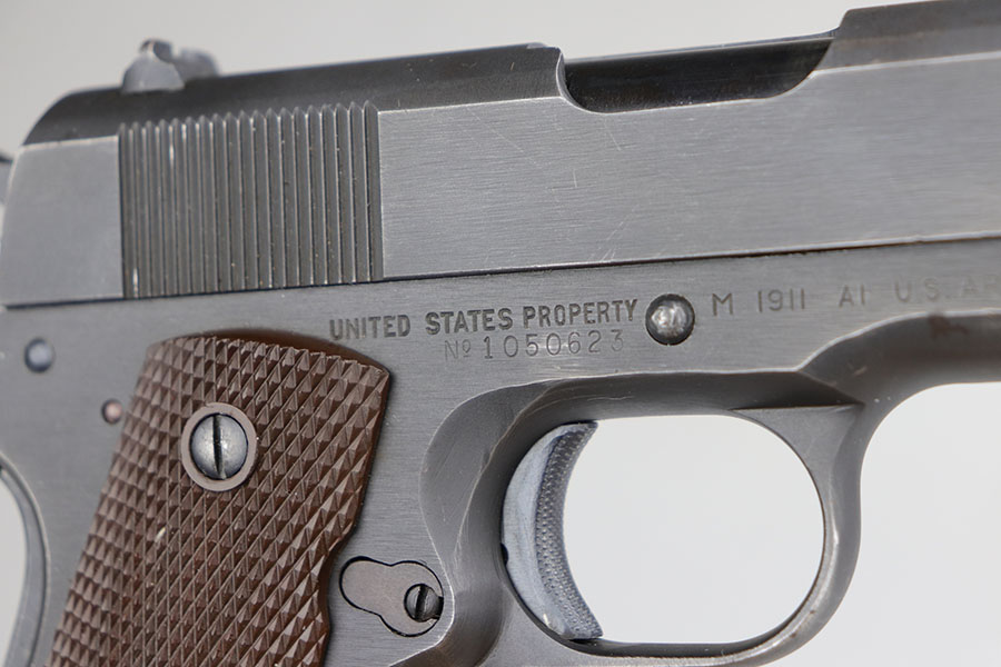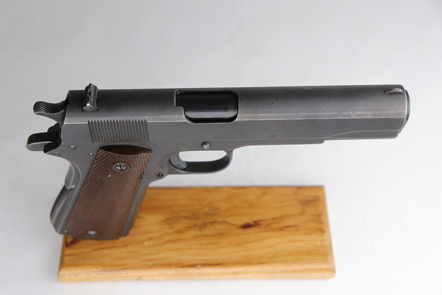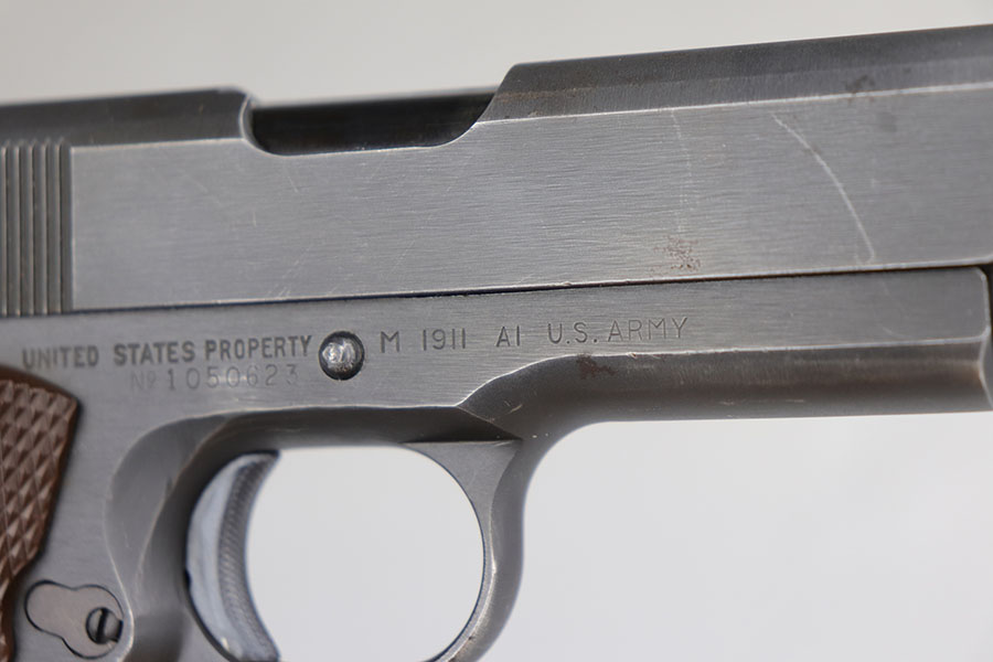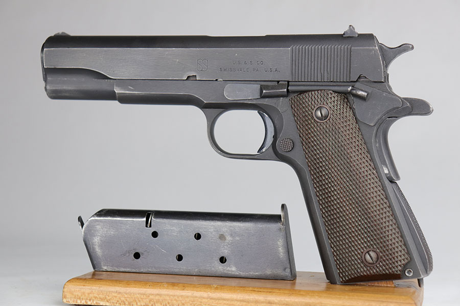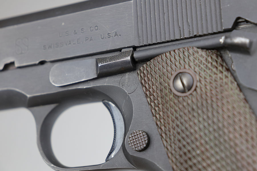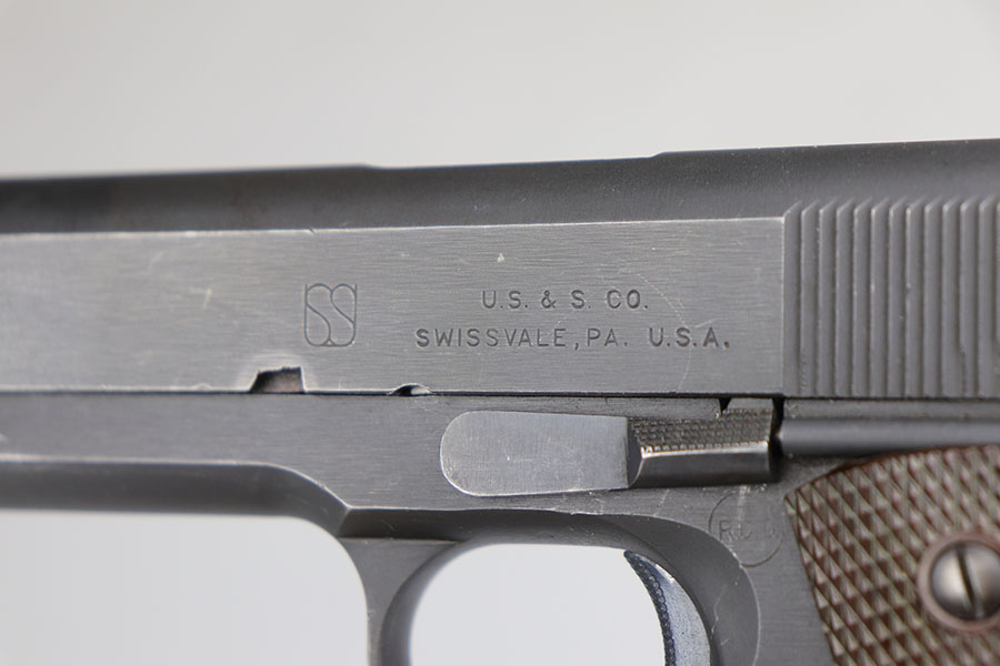 The Union Switch & Signal company of Swissvale Pennsylvania, primarily made railroad signaling equipment but received a contract on May 5, 1942 for the manufacture of M1911A1 pistols. The first pistols were accepted by Ordnance inspectors in January 1943, but the company received word that their contract would be canceled. Within a month U.S.&S. had signed a contract to supply carbine parts. On March 8, 1943 the company was officially notified that their contract had been cut back from 200,000 pistols to 30,000 pistols. However on June 26th, when the contract was nearly complete, and many of the workers had been transferred to Carbine operations, the company received a letter of intent to purchase an additional 25,000 pistols. The last of the pistols was shipped on November 27, 1943. 55,000 Union Switch and Signal pistols were delivered serial numbered from 1041405 to 1096404. U.S.&S. pistols are the second rarest of the M1911A1s (55,000 produced), only the Singer is rarer (500 produced). None of the Union Switch & Signal 1911A1s have the crossed cannons ordnance stamp. We are told these were issued to the Army Air Corps during the war.