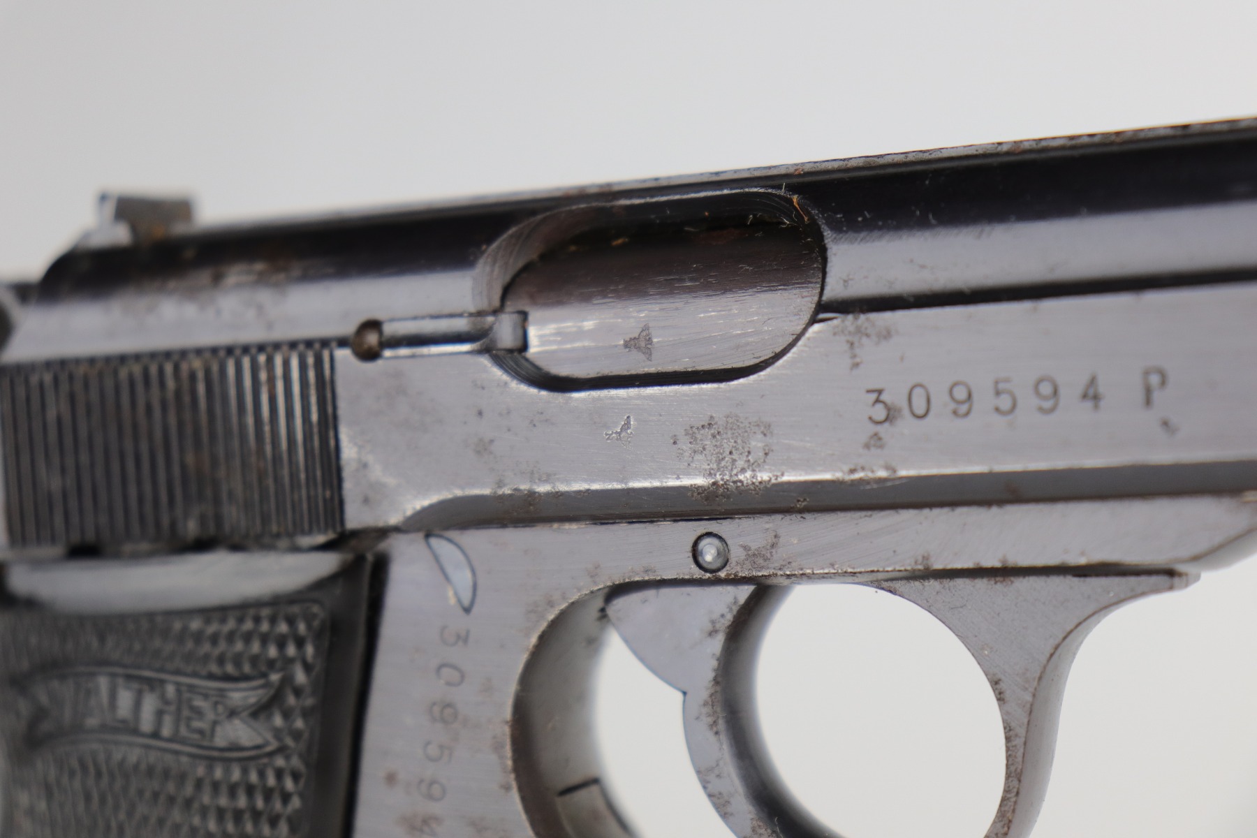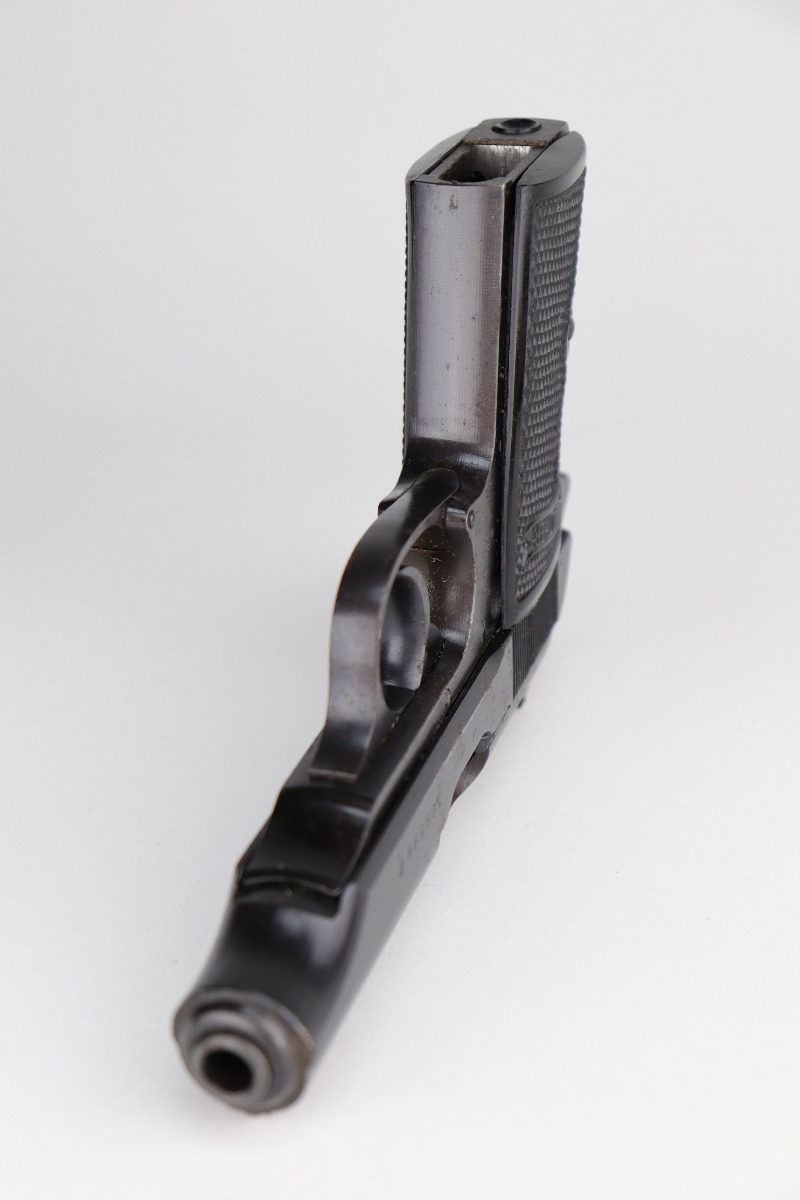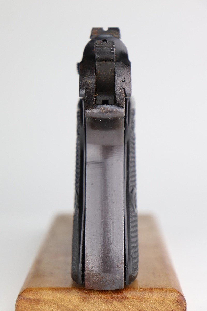 11/25/20 – This is an excellent example of a Walther PP issued to the Nazi military in 1943-44. It is all matching and has the proper “Waffen 359” Nazi military acceptance proofs. The gun is in excellent condition, retaining around 97% of its original bluing. While there isn’t much actual finish loss, there are areas of spotty oxidation and minor pitting throughout – most noticeable on the right side of the gun. There is an area of rust at the base of the back strap. Comes with excellent grips and a period-correct wartime magazine. The bore is mint.