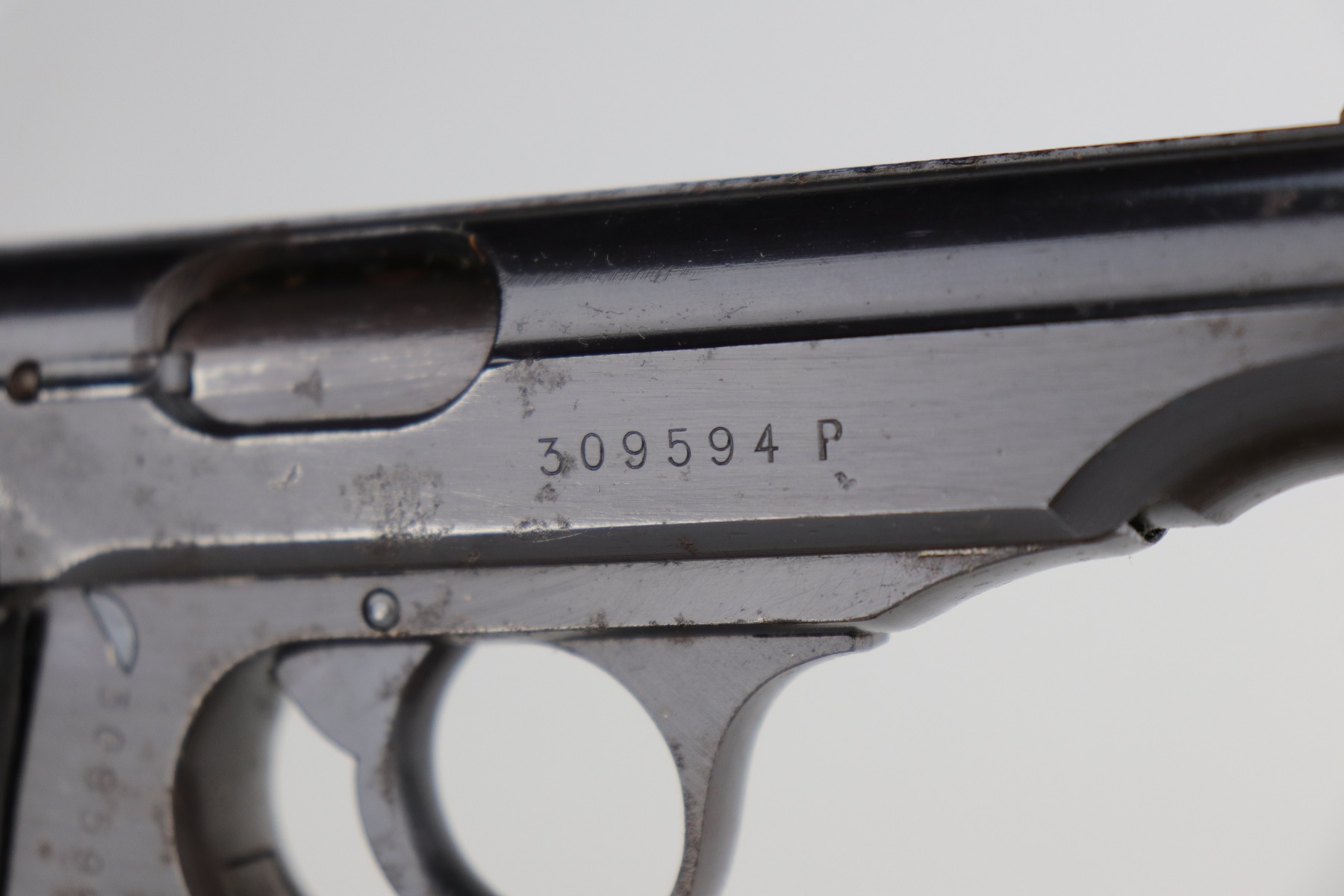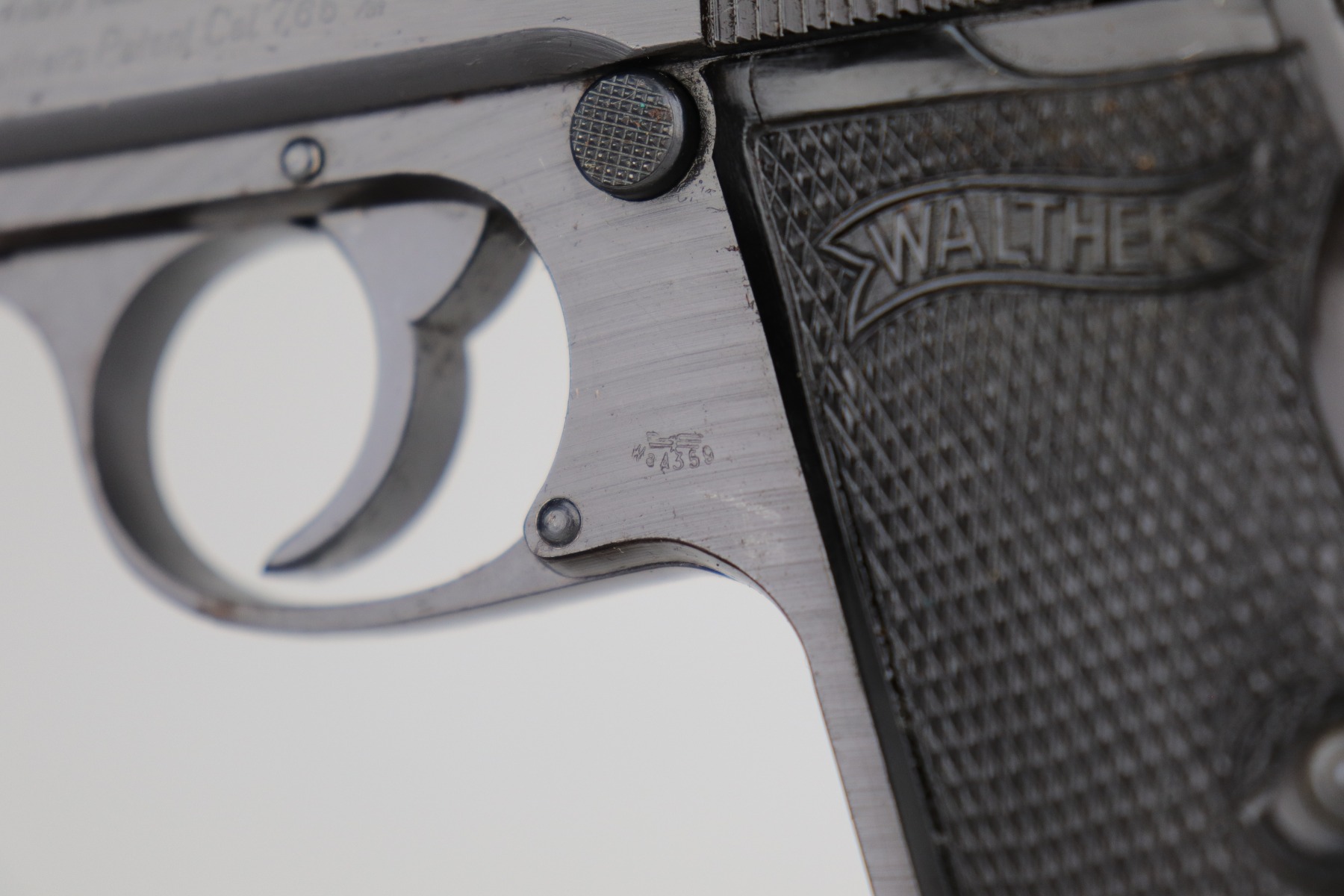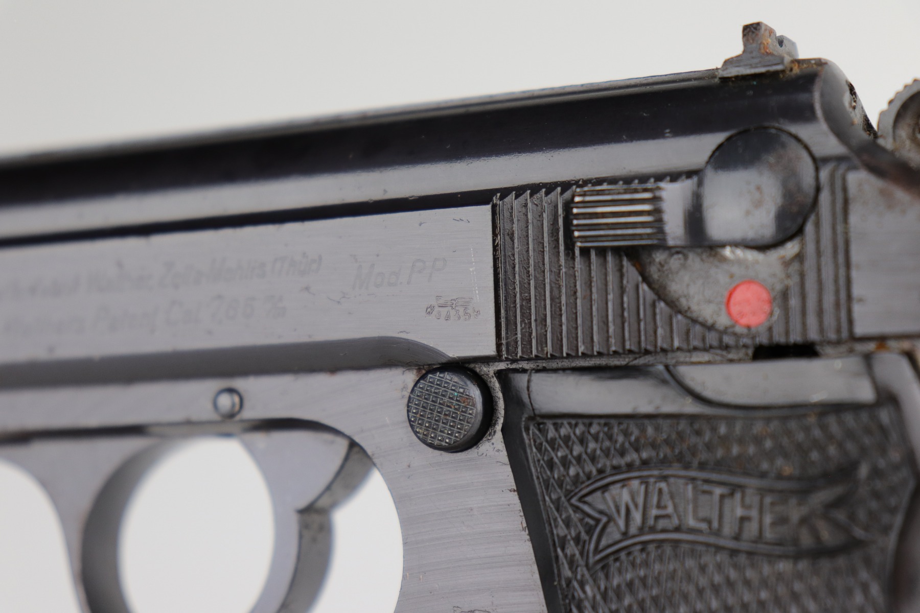 11/25/20 – This is an excellent example of a Walther PP issued to the Nazi military in 1943-44. It is all matching and has the proper “Waffen 359” Nazi military acceptance proofs. The gun is in excellent condition, retaining around 97% of its original bluing. While there isn’t much actual finish loss, there are areas of spotty oxidation and minor pitting throughout – most noticeable on the right side of the gun. There is an area of rust at the base of the back strap. Comes with excellent grips and a period-correct wartime magazine. The bore is mint.