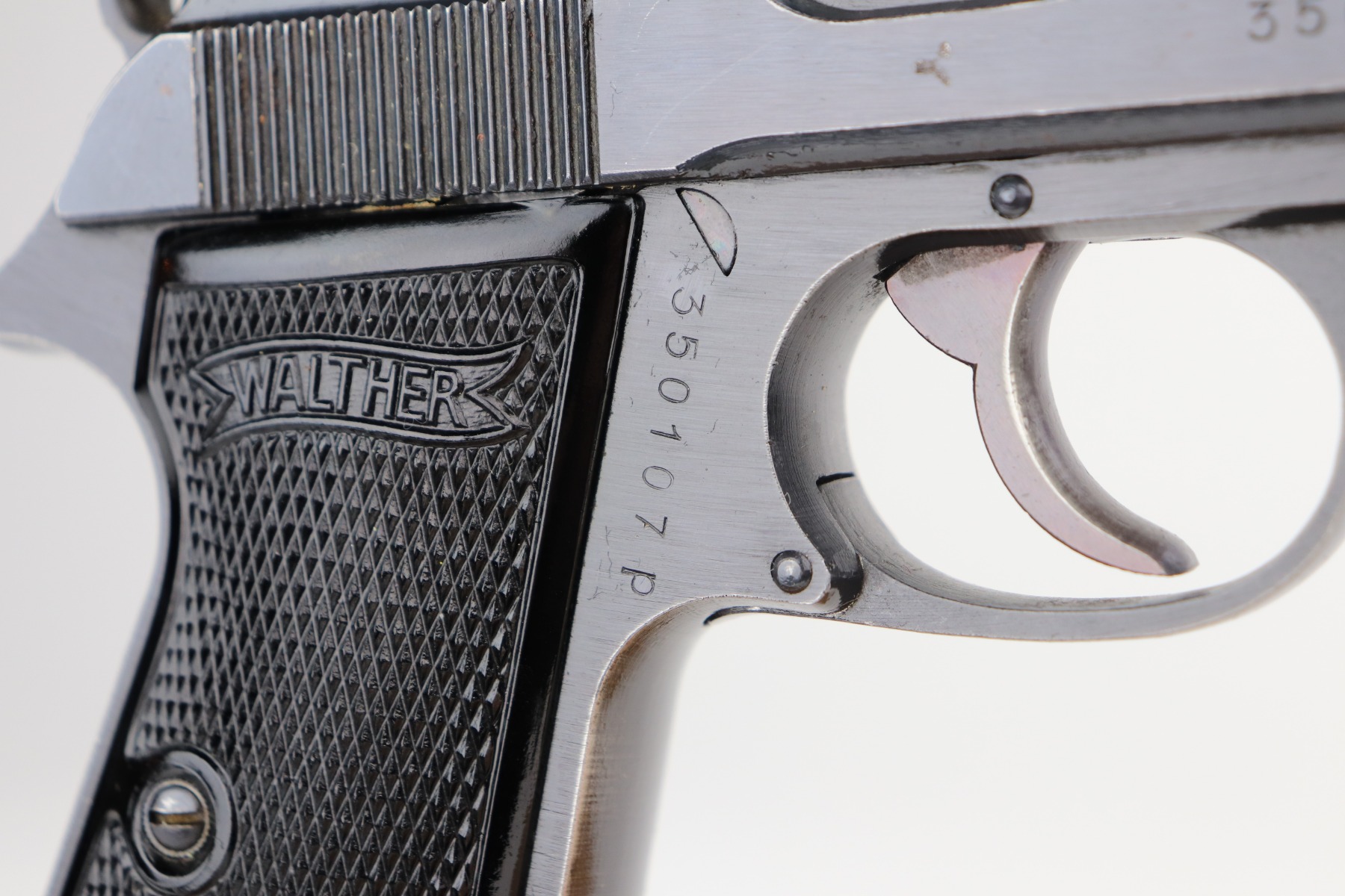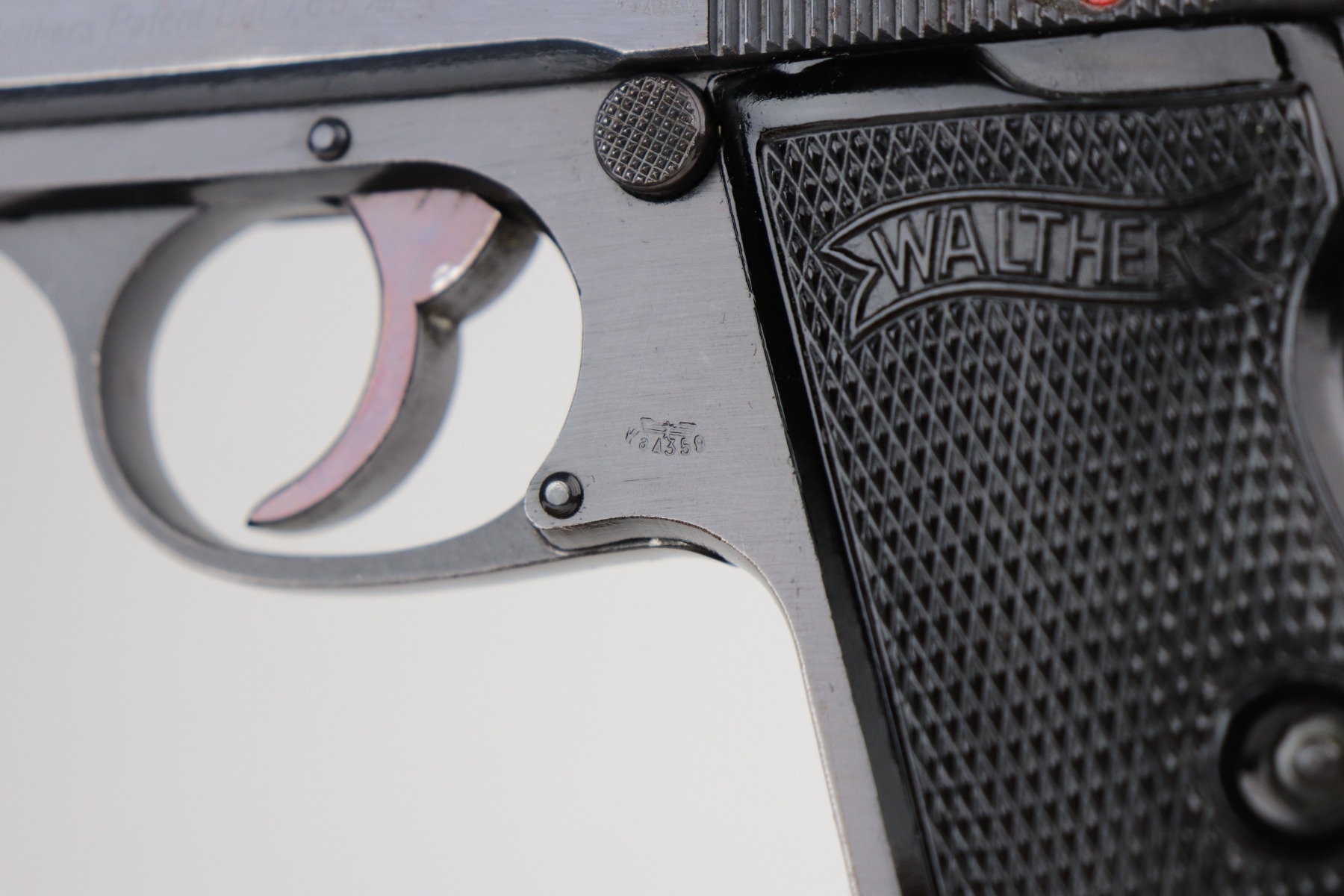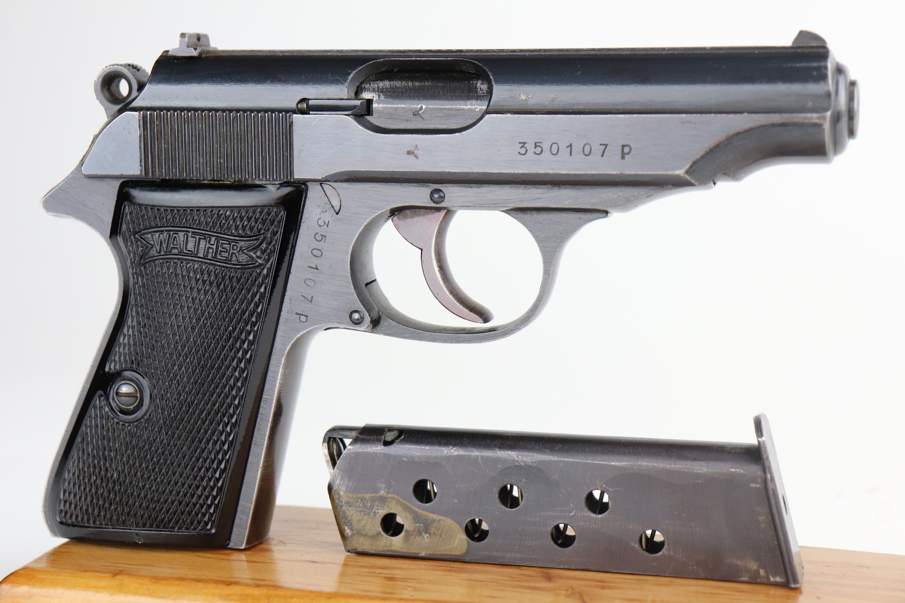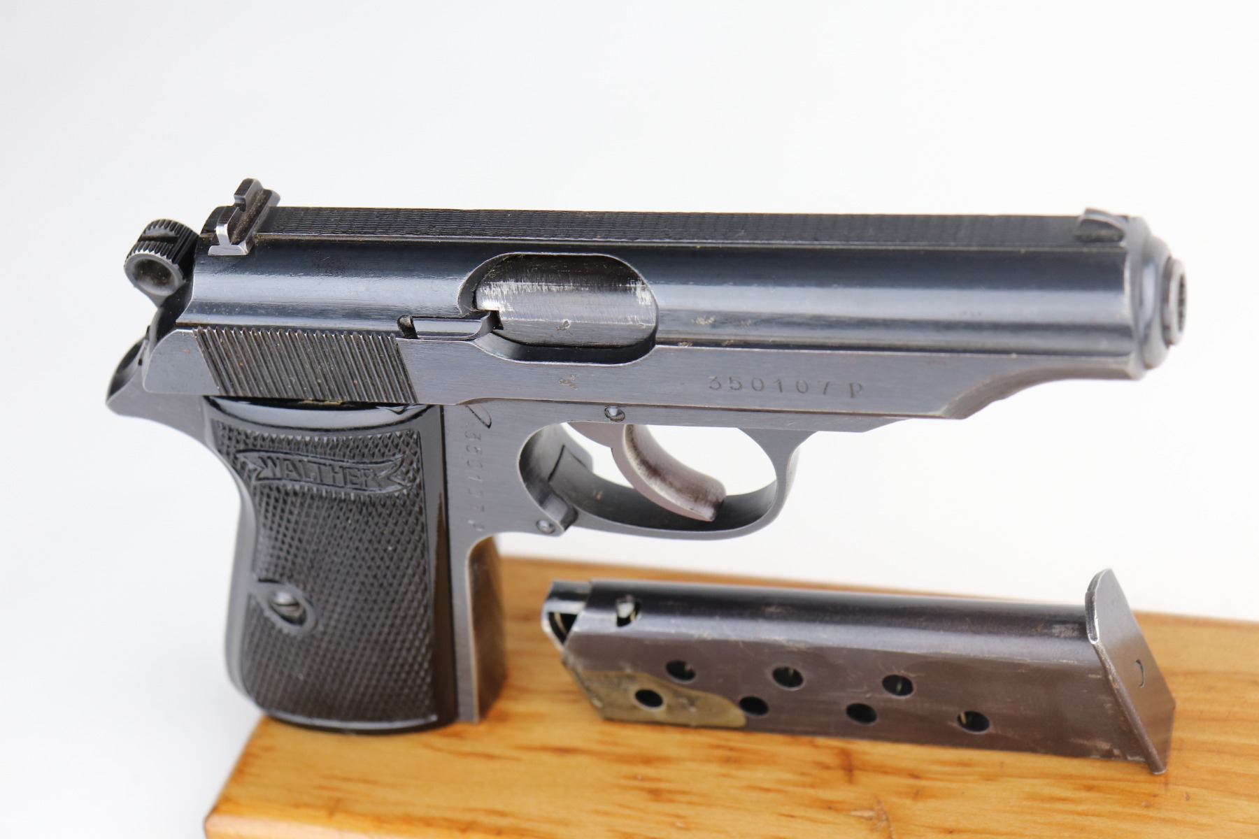6/8/21 – This is an excellent example of a Walther PP issued to the Nazi military in 1944. The gun is all matching and has the proper “Waffen 359” military proofs. It has retained about 97% of its original bluing. There is very minor thinning on the straps and minor wear around the muzzle and base of the back strap. One small ding on the right side of the slide. Comes with excellent grips and a proper wartime magazine. Mint bore.