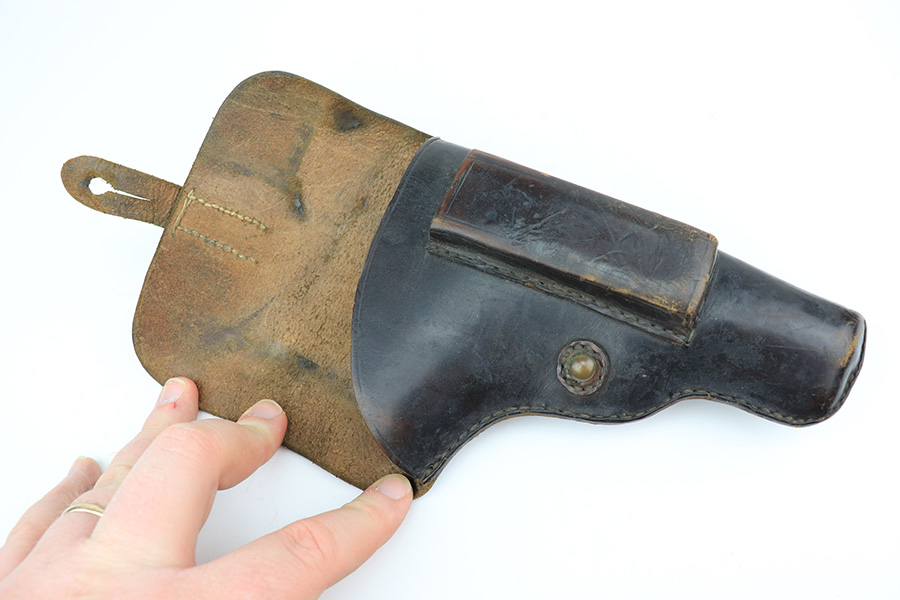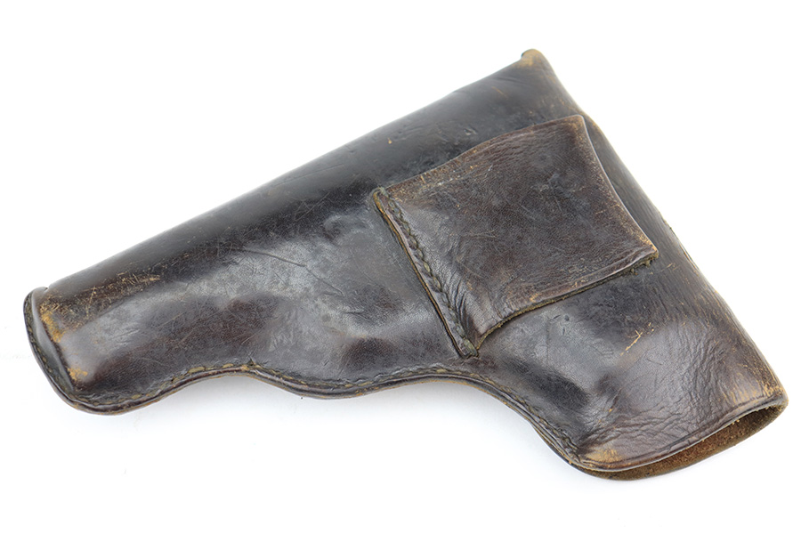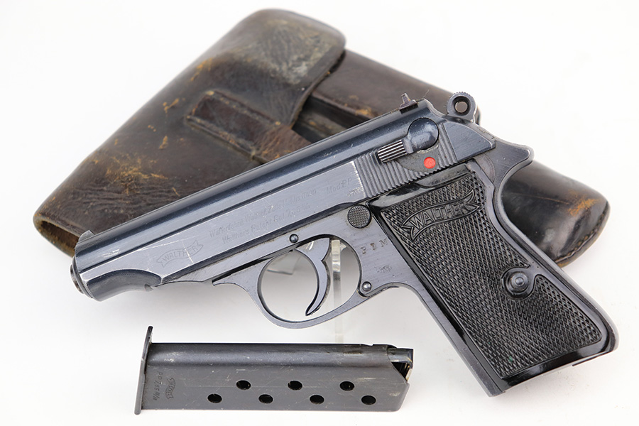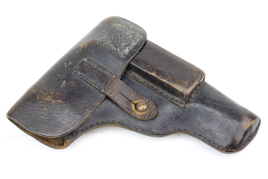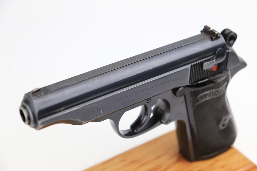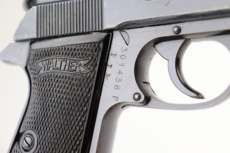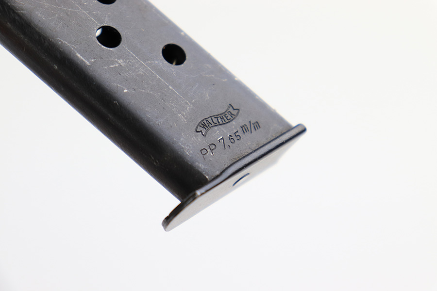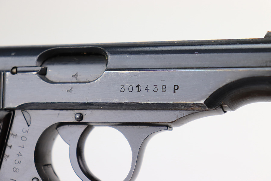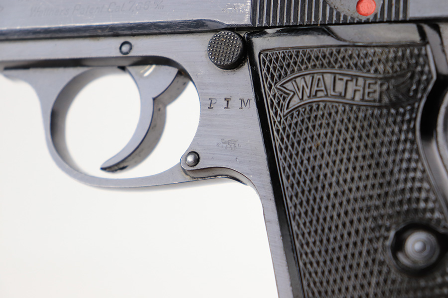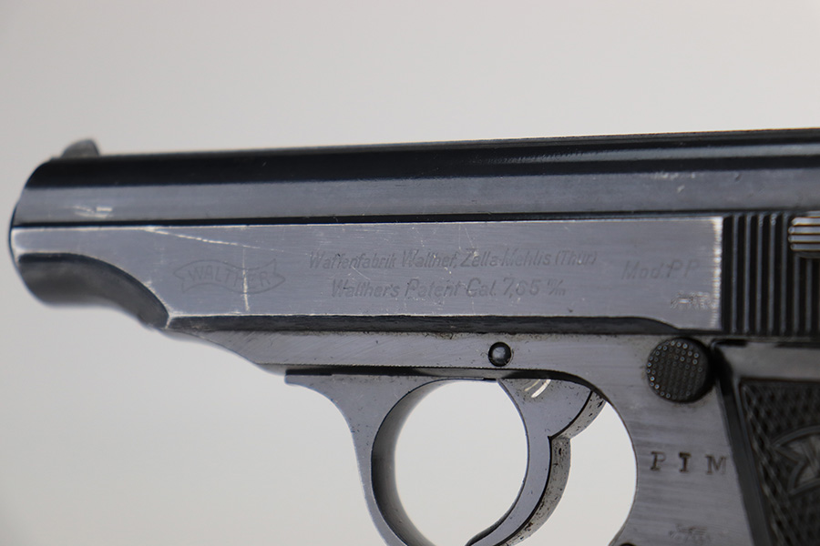 3/24/22 – This is an excellent example of a Walther PP issued to the Nazi military in 1943. The gun is all matching and has the proper “Waffen 359” Nazi military acceptance proofs on the slide and frame. The letters “P.I.M.” have been stamped into both sides of the frame, likely the initials of the person who owned this gun. There is a factory over-stamp of one of the numbers in the serial on the slide. The gun comes as a rig with a generic un-marked commercial holster and one proper wartime magazine. The gun has retained about 97-98% of its original finish. While there is very little actual finish loss, there are small scratches and handling marks along both sides of the slide. Most noticeable on the left side. Comes with excellent period-correct black bakelite grips. Stone-mint bore.