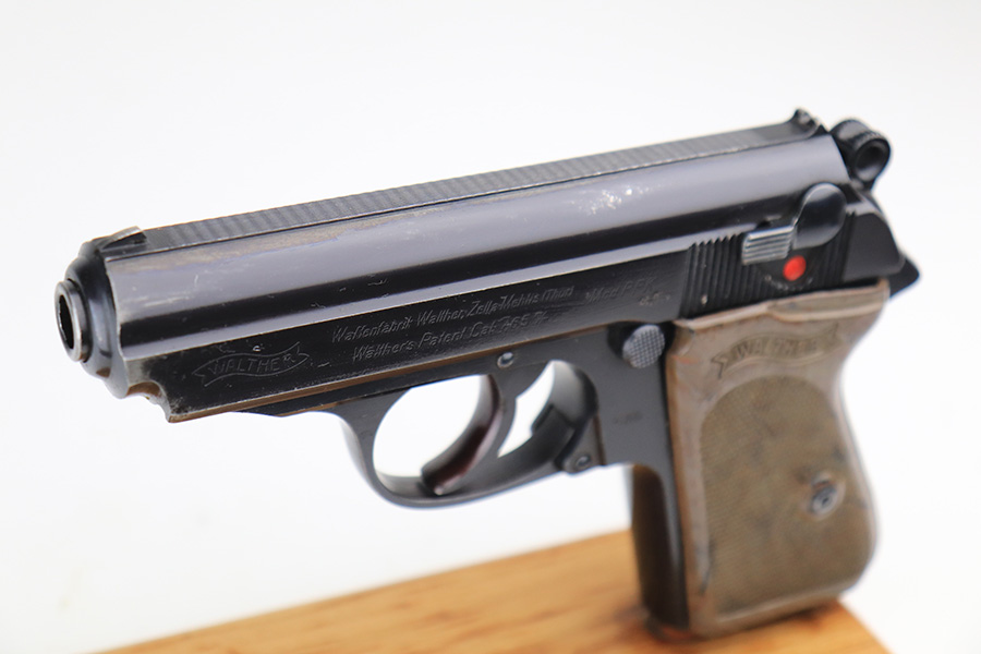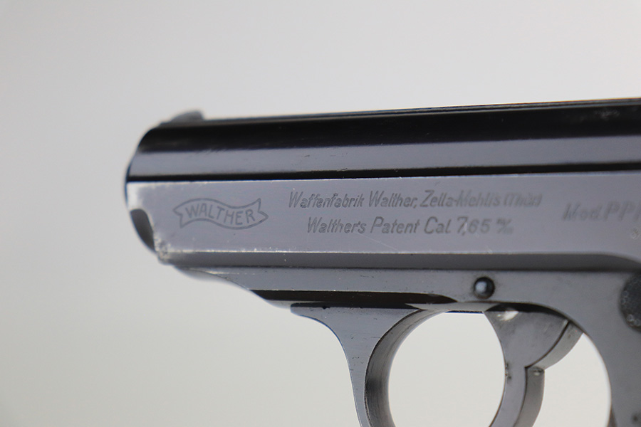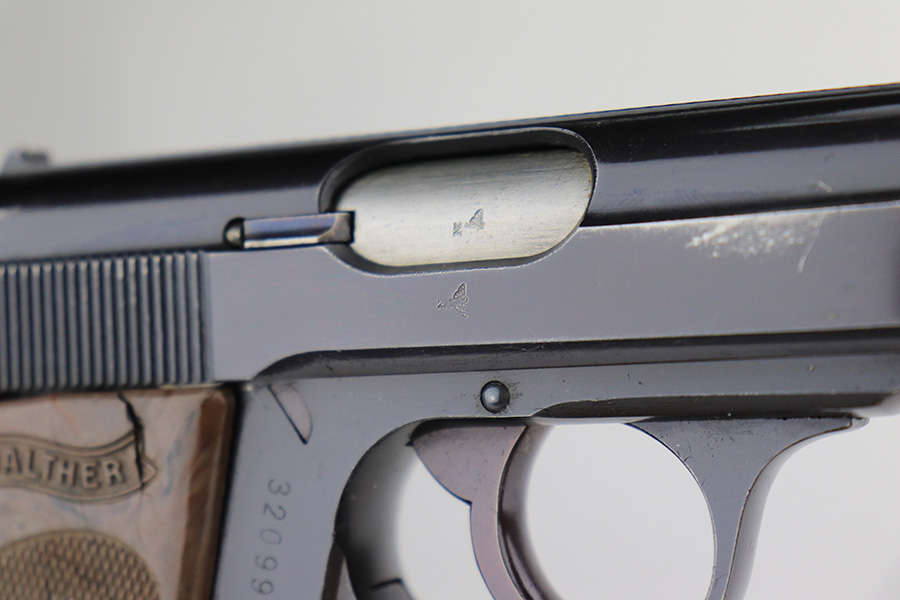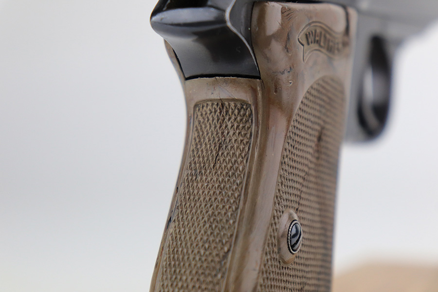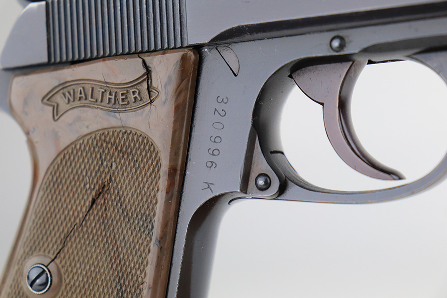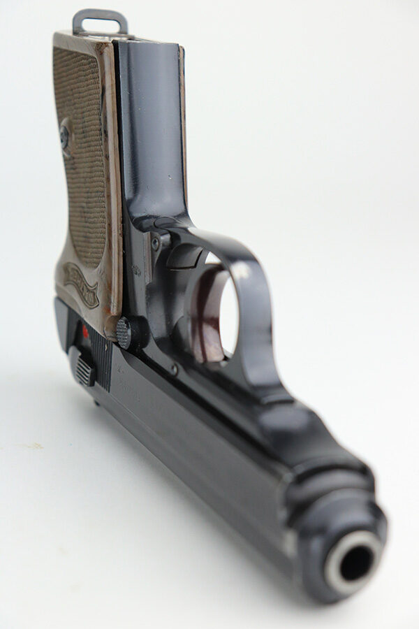 1/6/22 – This is an excellent example of a Watlher PPK issued to the Nazi military in 1941. It is all matching and has the proper “Waffen 359” Nazi military acceptance proofs on the left side of the slide and frame. It has retained about 95-96% of its original high polish finish. There is minor muzzle wear and a few small areas of wear on the right side of the slide. The gun comes with a really nice grey-colored grip and a post-war finger extension magazine. There are a couple of noticeable cracks on the right side of the grip and a small crack on the left side around the screw hole. The bore is near-mint.