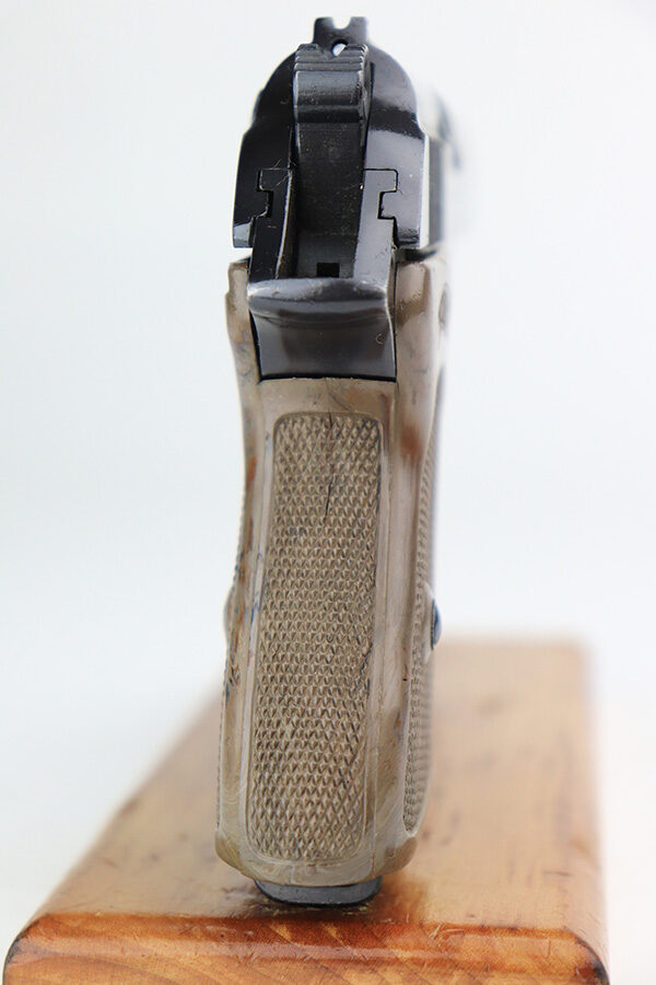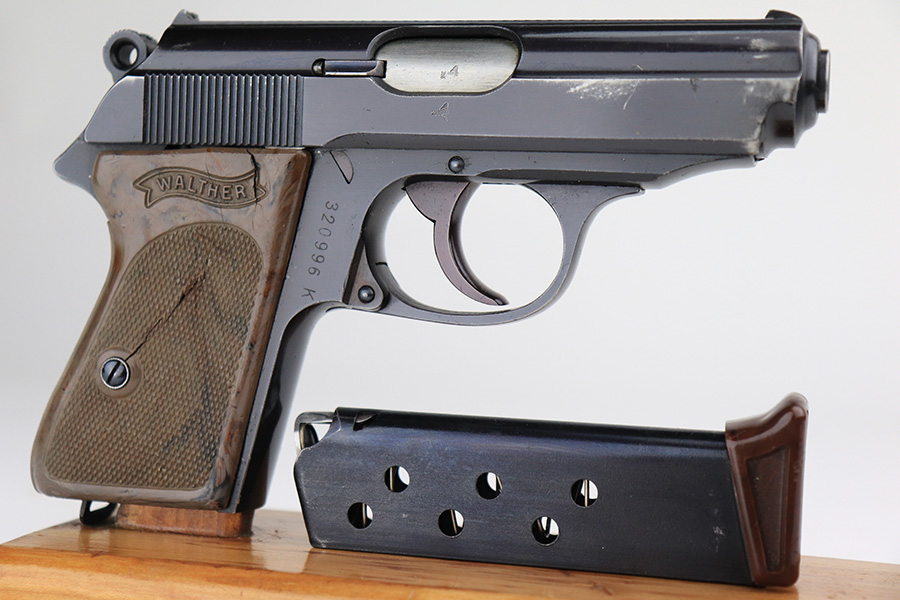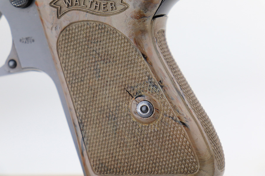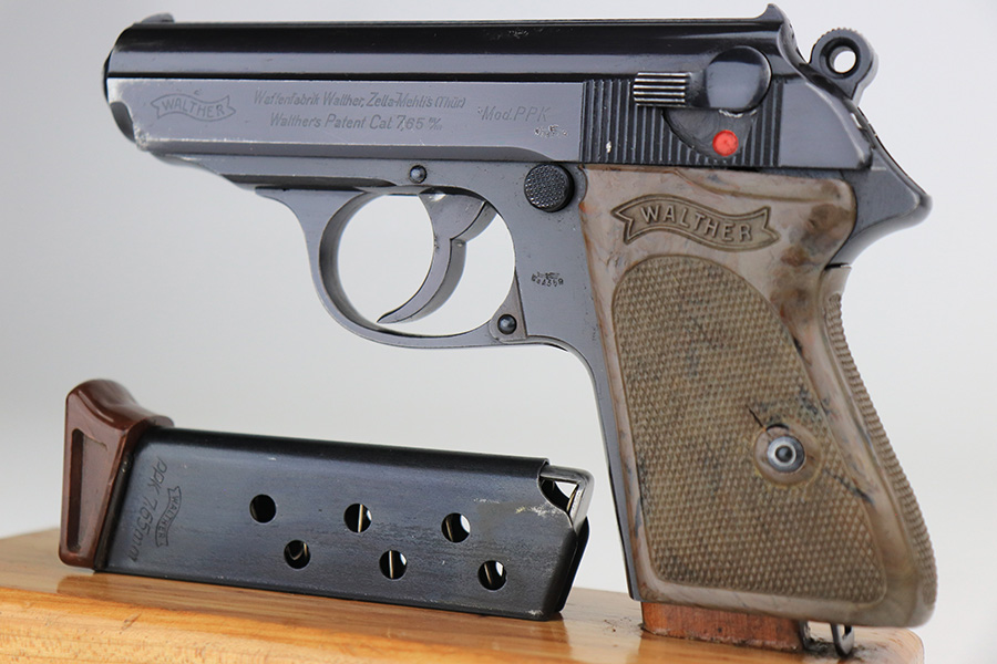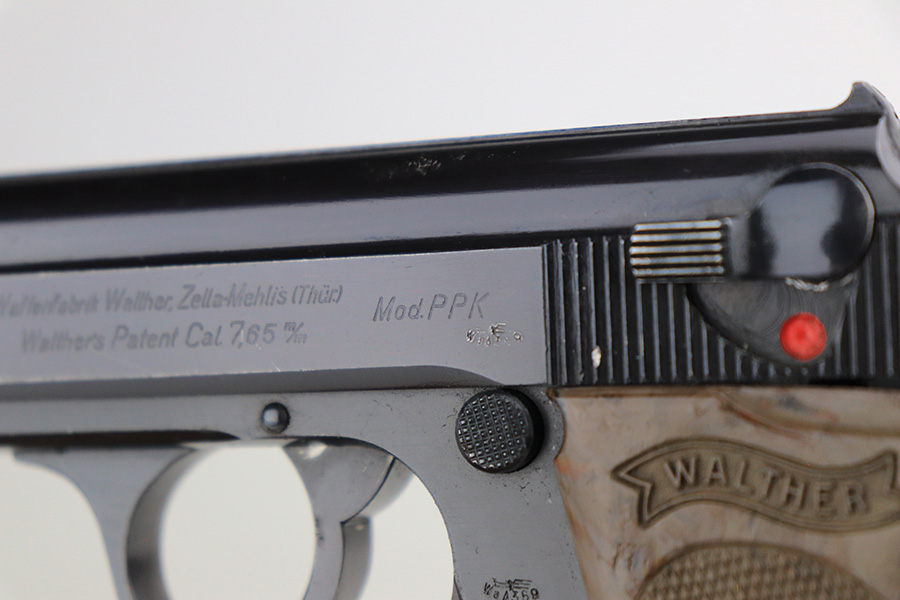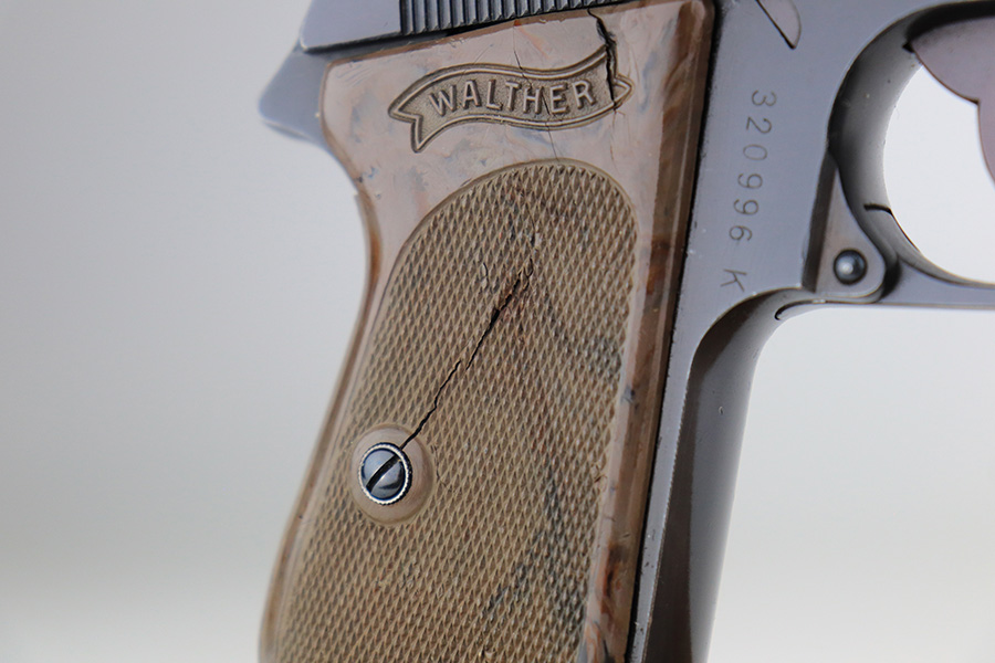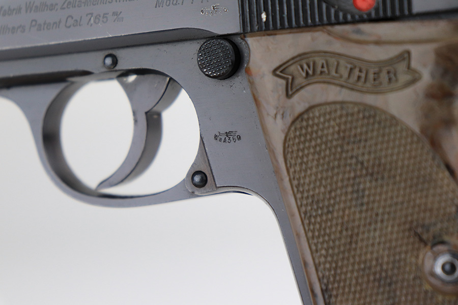1/6/22 – This is an excellent example of a Watlher PPK issued to the Nazi military in 1941. It is all matching and has the proper “Waffen 359” Nazi military acceptance proofs on the left side of the slide and frame. It has retained about 95-96% of its original high polish finish. There is minor muzzle wear and a few small areas of wear on the right side of the slide. The gun comes with a really nice grey-colored grip and a post-war finger extension magazine. There are a couple of noticeable cracks on the right side of the grip and a small crack on the left side around the screw hole. The bore is near-mint.