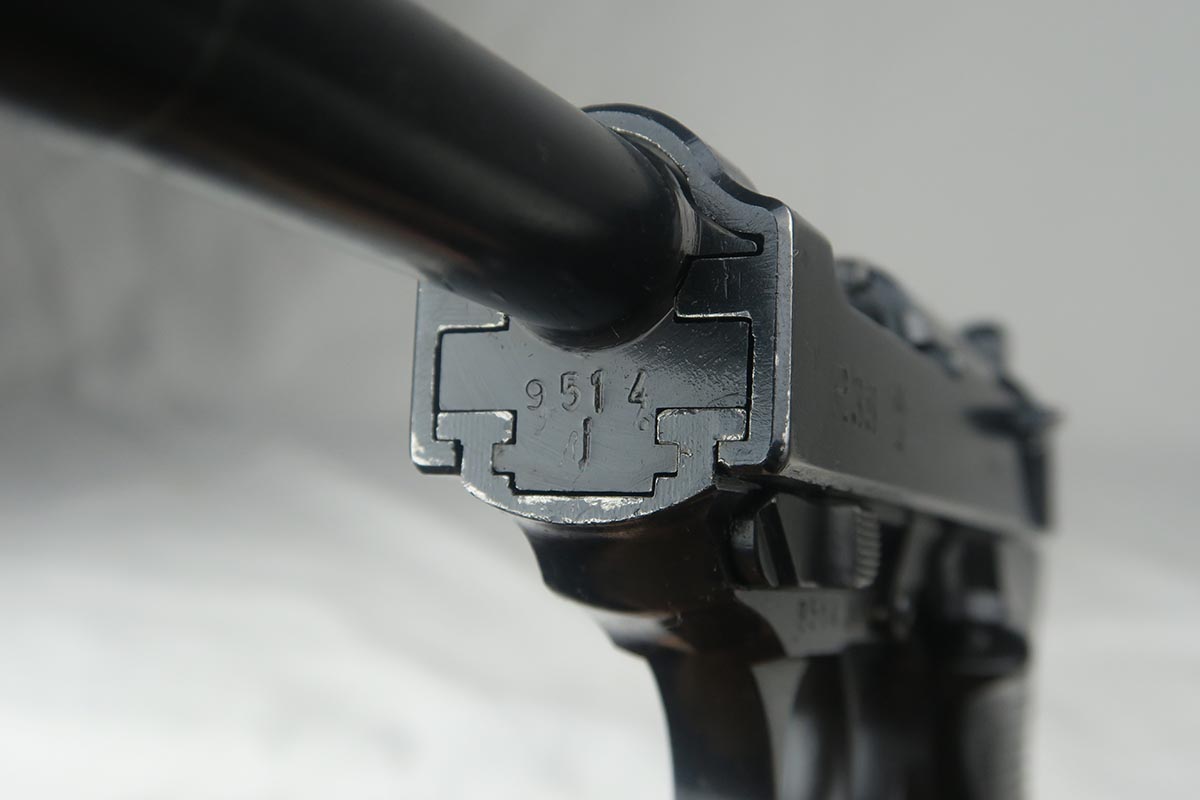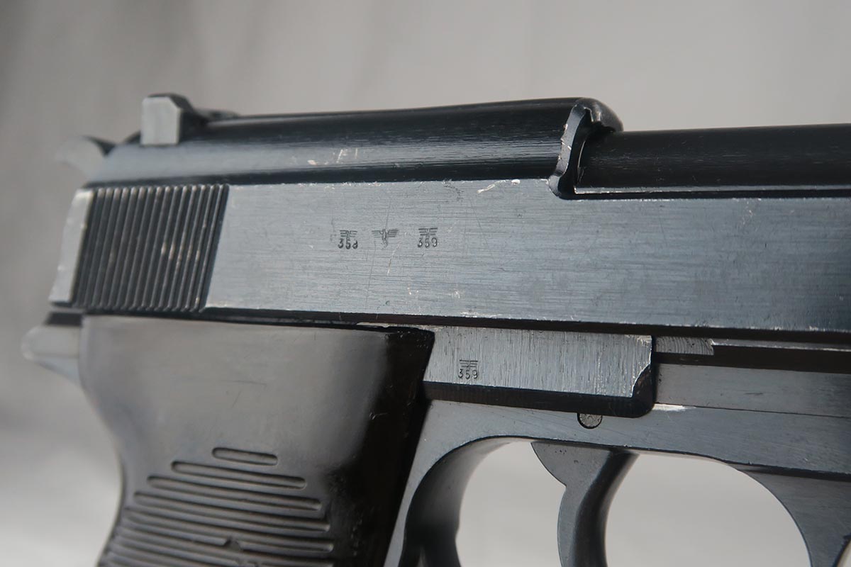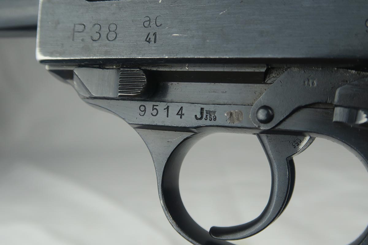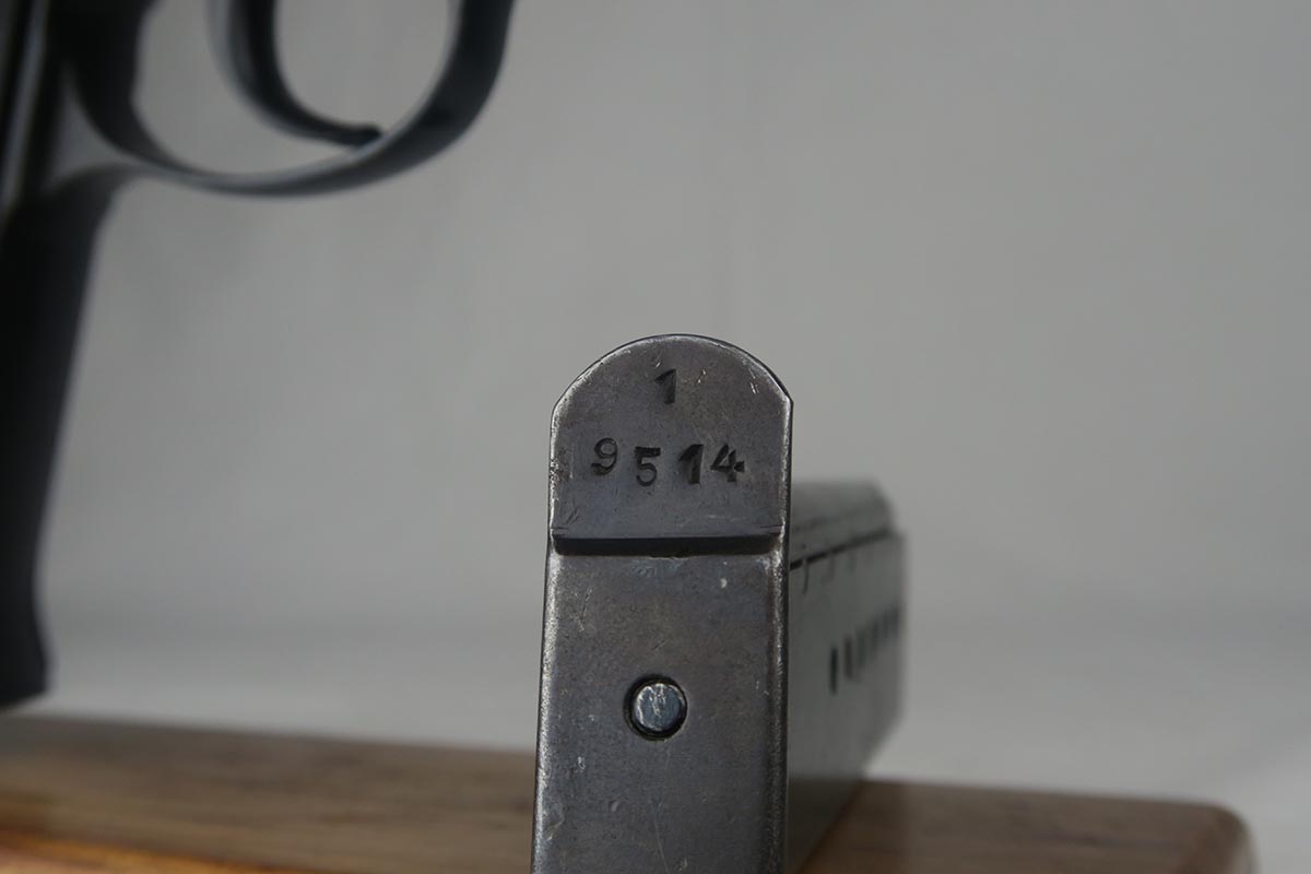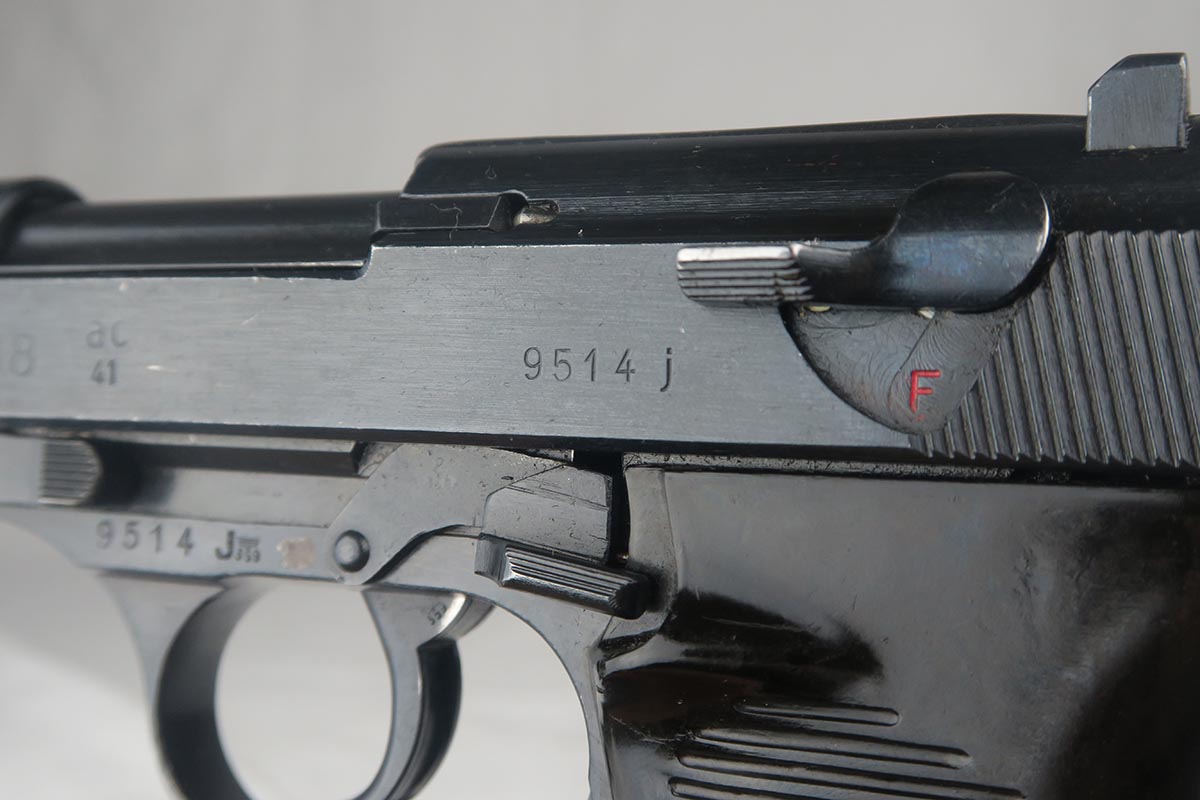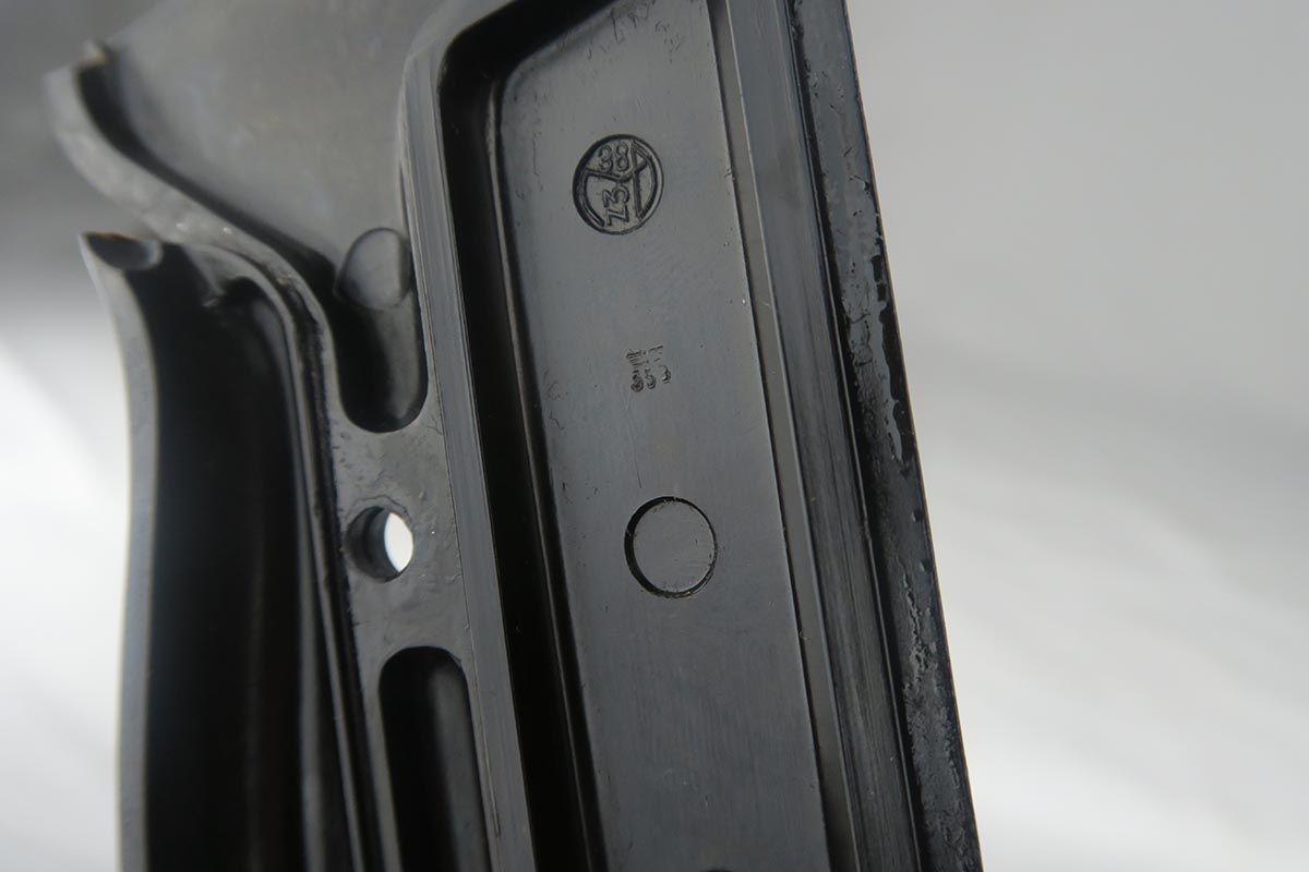 4/27/18 – In 1941 the finish on the AC41 went from high-polish blue to the more common military dull finish.   This is the later variation found in the J block.   The original finish covers about 98% of the gun.   Many of the small part are waffen proofed including the safety lever and take down lever; slide lever, trigger and hammer.  The grips are waffen stamped.  All numbered parts are matching.  This is just a real nice example of a 3rd variation ac 41.  The bore has strong rifling but definitely a few spots of pitting – most likely from not cleaning after use of corrosive ammo.   I would rate it a 5 or 6 out of 10; so not terrible, but not minty either.  Now for the magazine…it is matching to the gun, but NOT factory numbering.  It is roll stamped, so I don’t believe it was done by a “faker”.  It is in the style of the police arsenal mags I have seen or post war police.  It has the single waffen 359 stamp on the spine. So I am assuming the mag was numbered to the gun post factory and perhaps post war.  Priced as a non-matched magazine.  Note that the de-cocker does not work, which is common for early P.38’s.