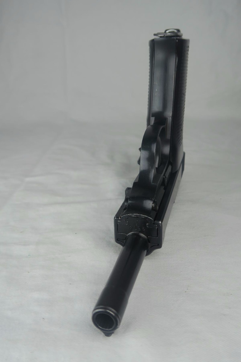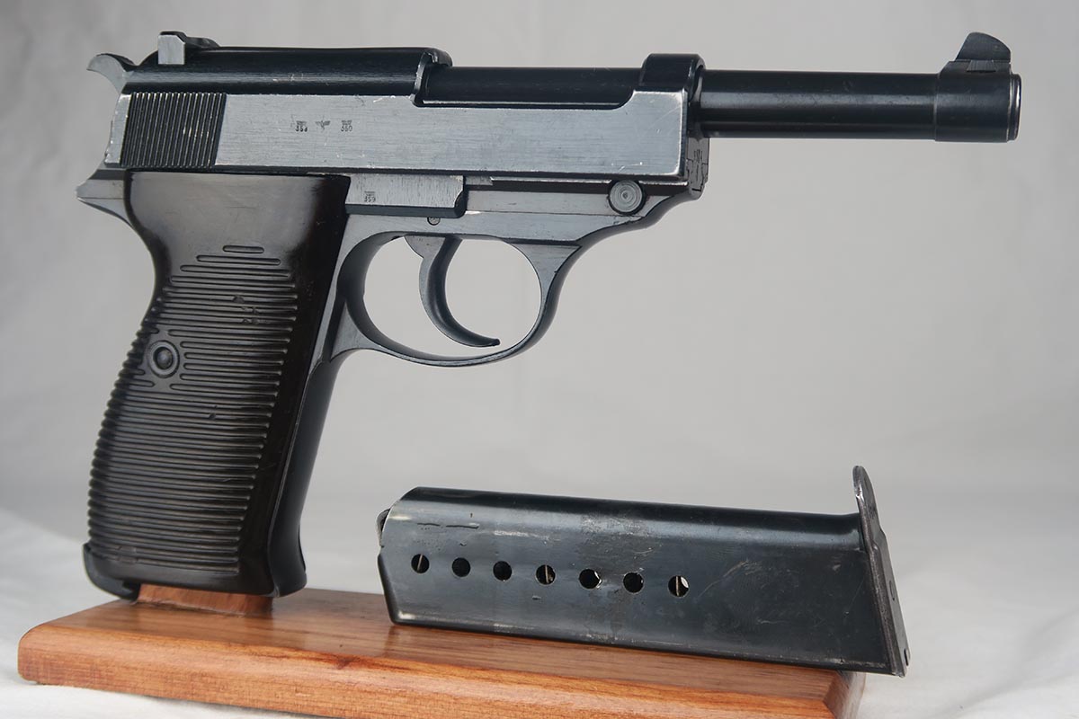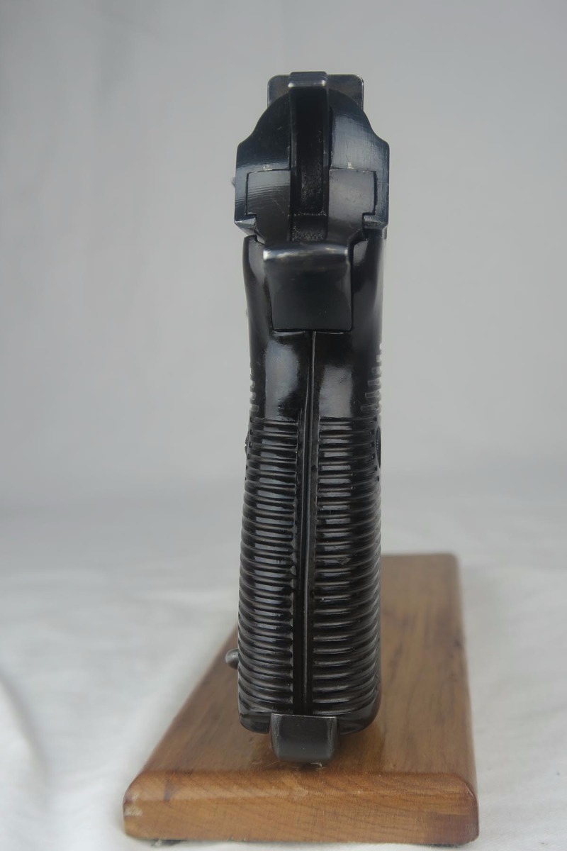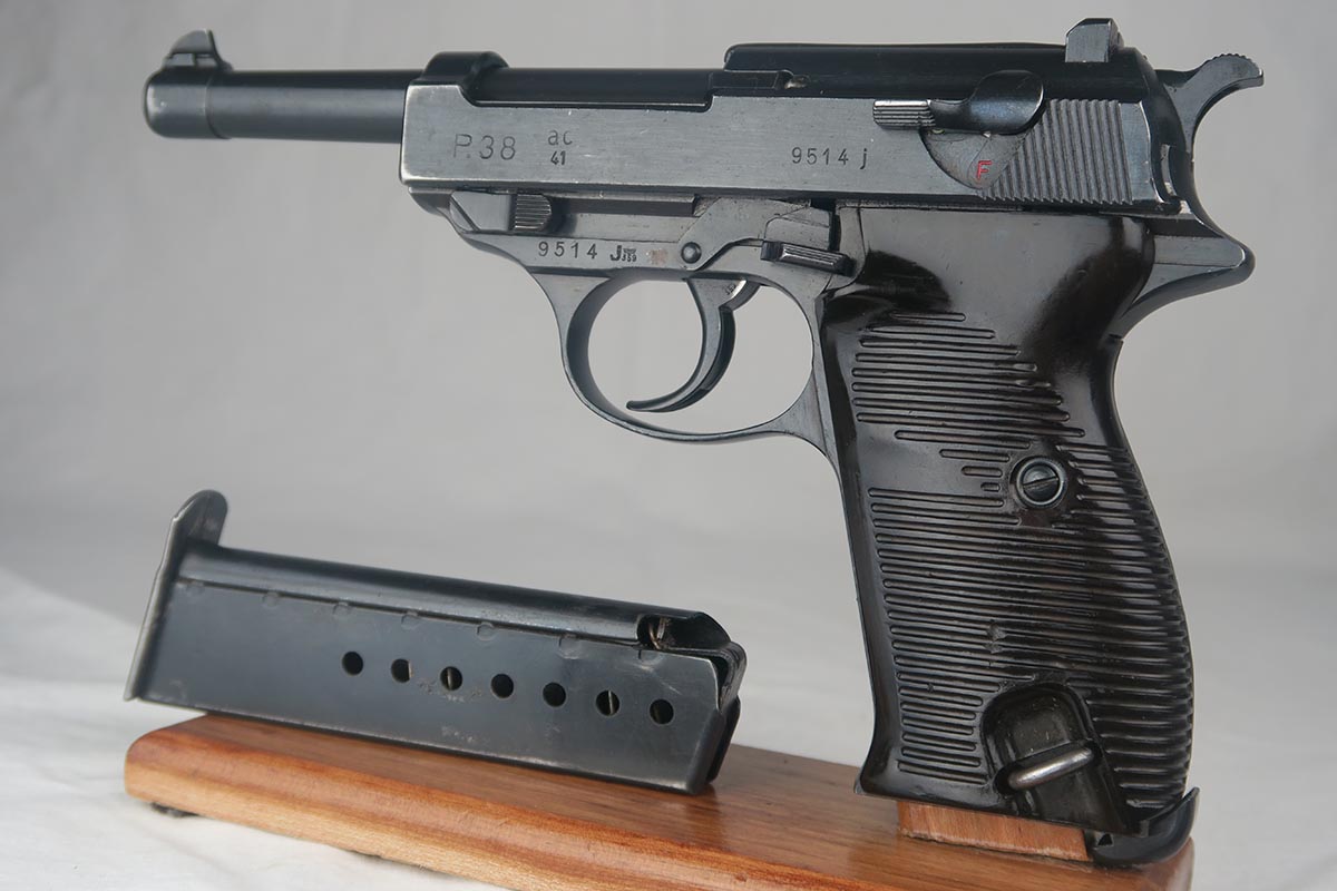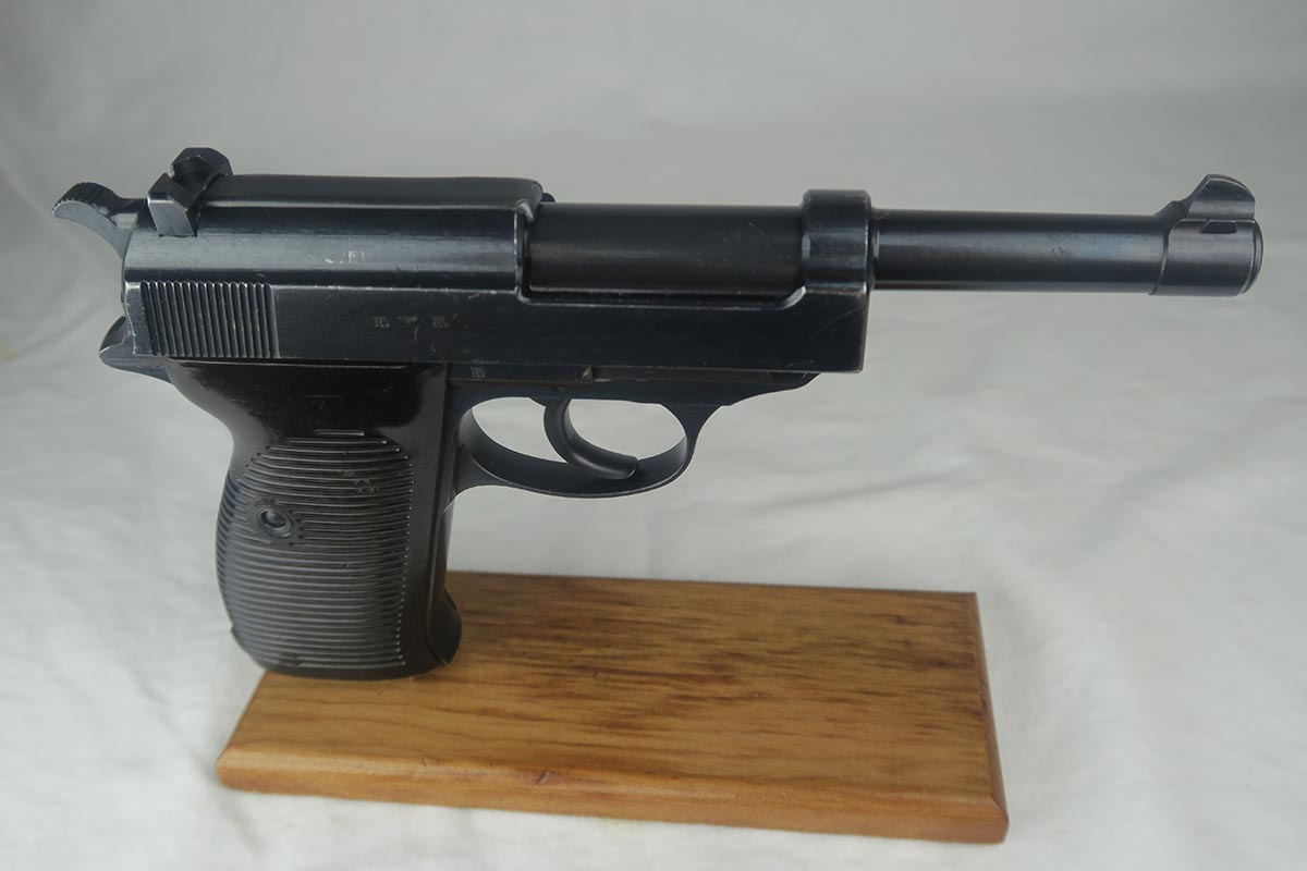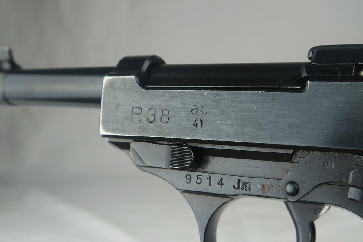 4/27/18 – In 1941 the finish on the AC41 went from high-polish blue to the more common military dull finish.   This is the later variation found in the J block.   The original finish covers about 98% of the gun.   Many of the small part are waffen proofed including the safety lever and take down lever; slide lever, trigger and hammer.  The grips are waffen stamped.  All numbered parts are matching.  This is just a real nice example of a 3rd variation ac 41.  The bore has strong rifling but definitely a few spots of pitting – most likely from not cleaning after use of corrosive ammo.   I would rate it a 5 or 6 out of 10; so not terrible, but not minty either.  Now for the magazine…it is matching to the gun, but NOT factory numbering.  It is roll stamped, so I don’t believe it was done by a “faker”.  It is in the style of the police arsenal mags I have seen or post war police.  It has the single waffen 359 stamp on the spine. So I am assuming the mag was numbered to the gun post factory and perhaps post war.  Priced as a non-matched magazine.  Note that the de-cocker does not work, which is common for early P.38’s.