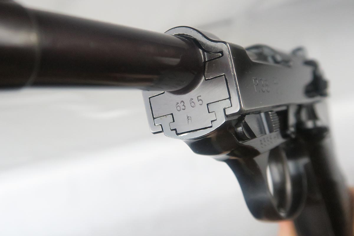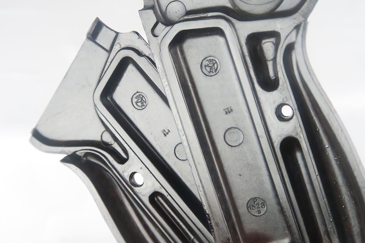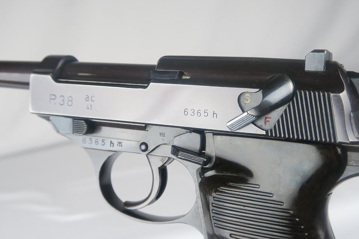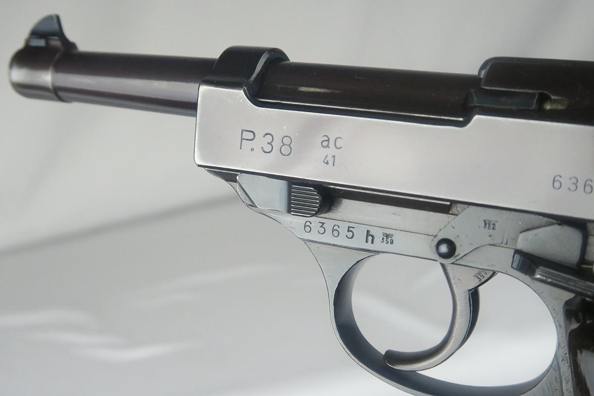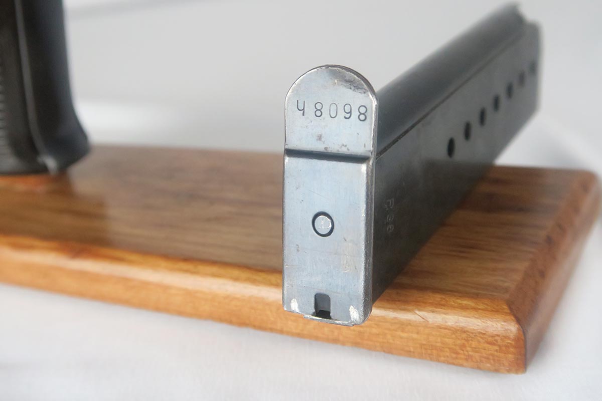 1/25/18 – This is an excellent Walther P.38 from 1941 with all matching parts. Marked ‘ac 41’ on the slide, this is a second variation pistol with high-polish finish but no ‘ac’ on the trigger guard. The pistol shows about 97% original blue with some edge wear, but the slide has a very nice plum color to the finish. The magazine is period correct but numbered to a different pistol. The grips are waffen proofed but not numbered. Bore is shiny with strong rifling and only minor signs of use.