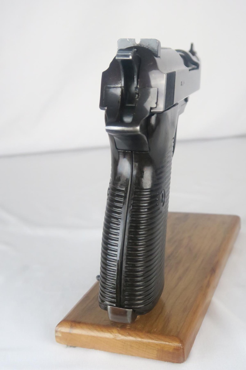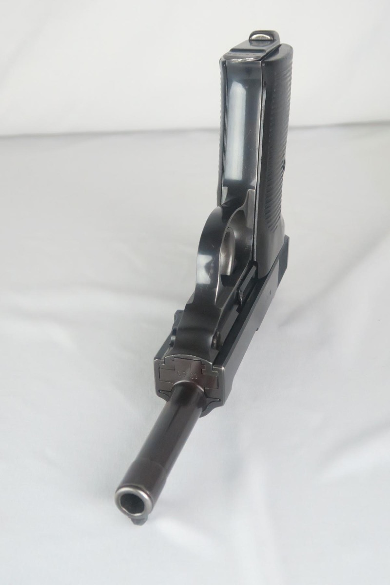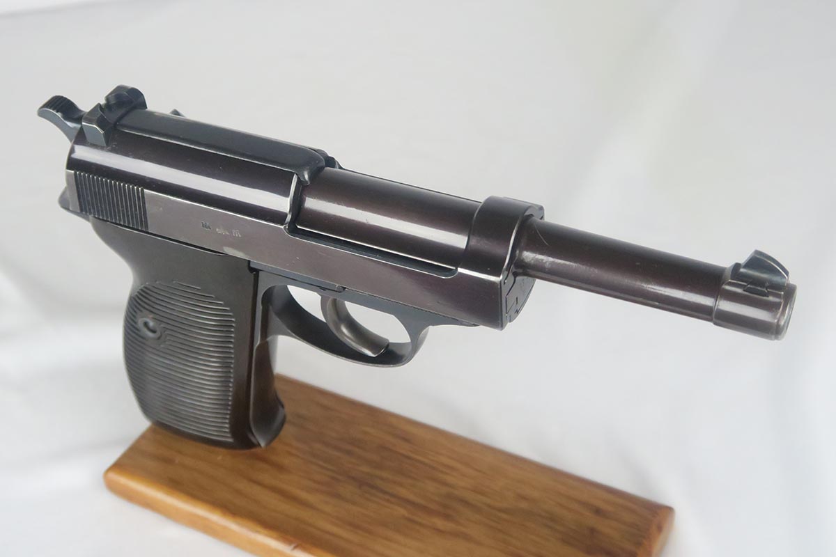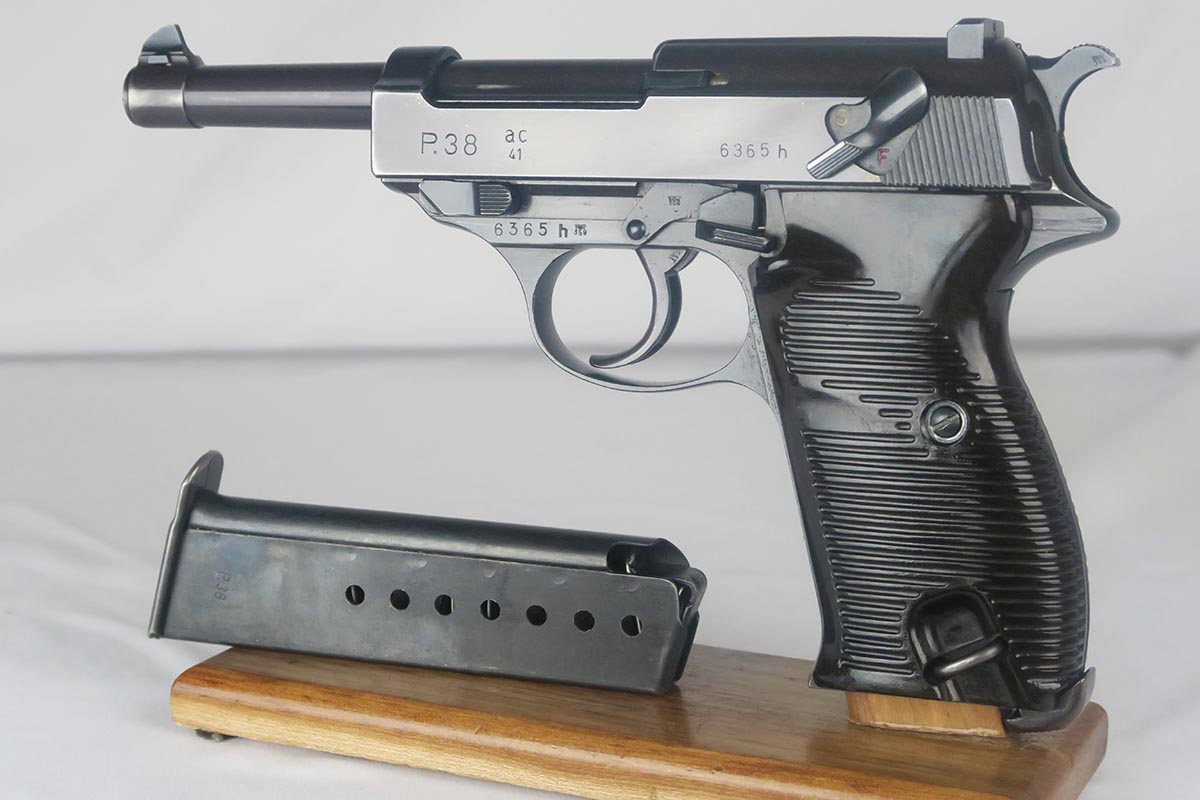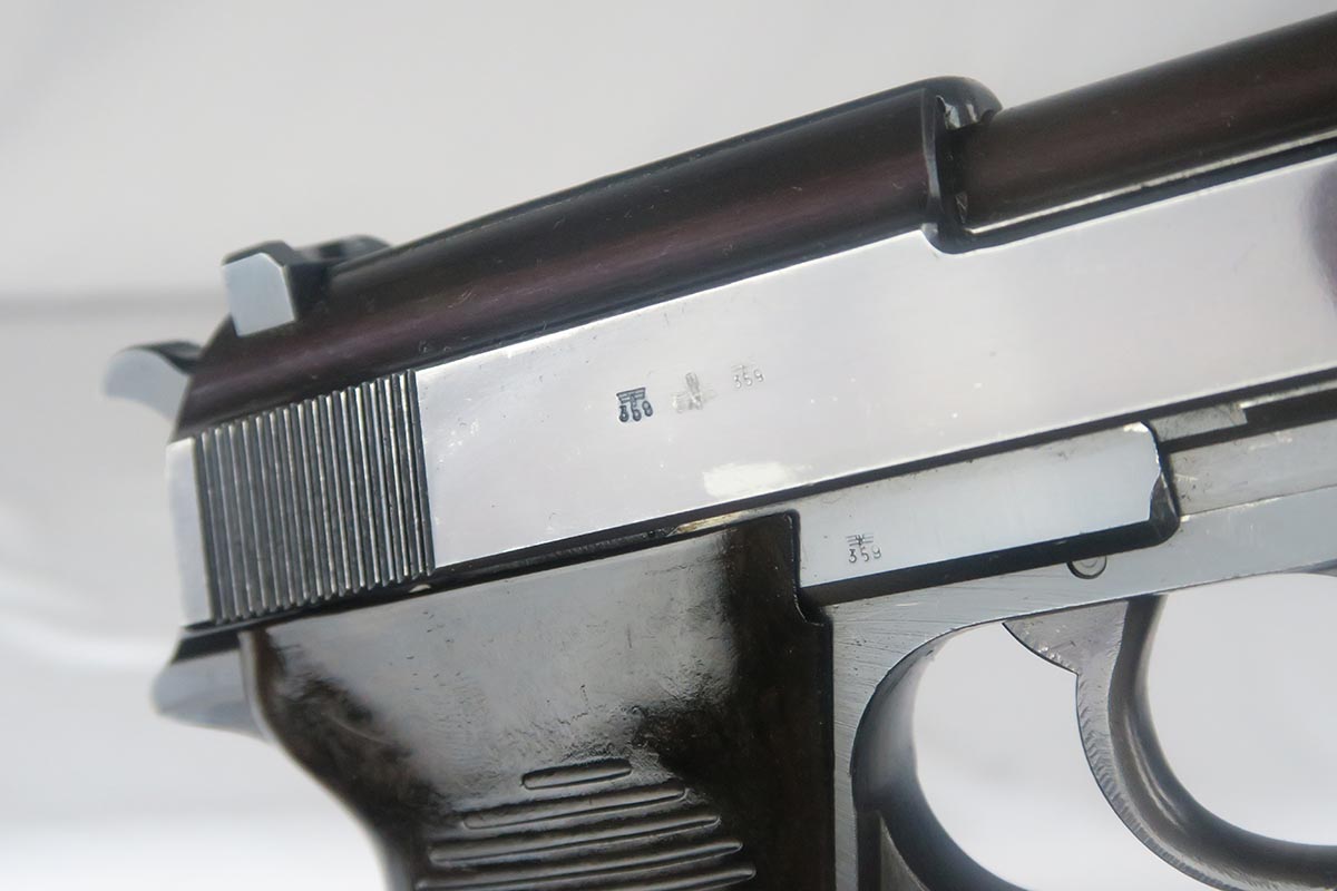 1/25/18 – This is an excellent Walther P.38 from 1941 with all matching parts. Marked ‘ac 41’ on the slide, this is a second variation pistol with high-polish finish but no ‘ac’ on the trigger guard. The pistol shows about 97% original blue with some edge wear, but the slide has a very nice plum color to the finish. The magazine is period correct but numbered to a different pistol. The grips are waffen proofed but not numbered. Bore is shiny with strong rifling and only minor signs of use.