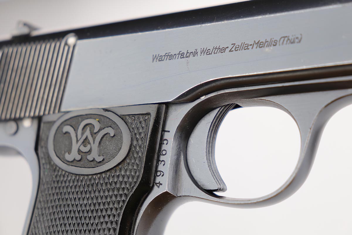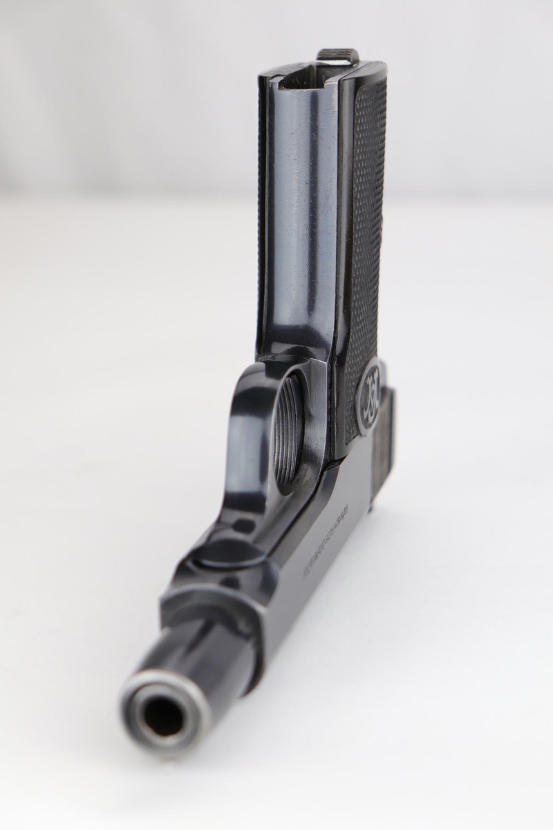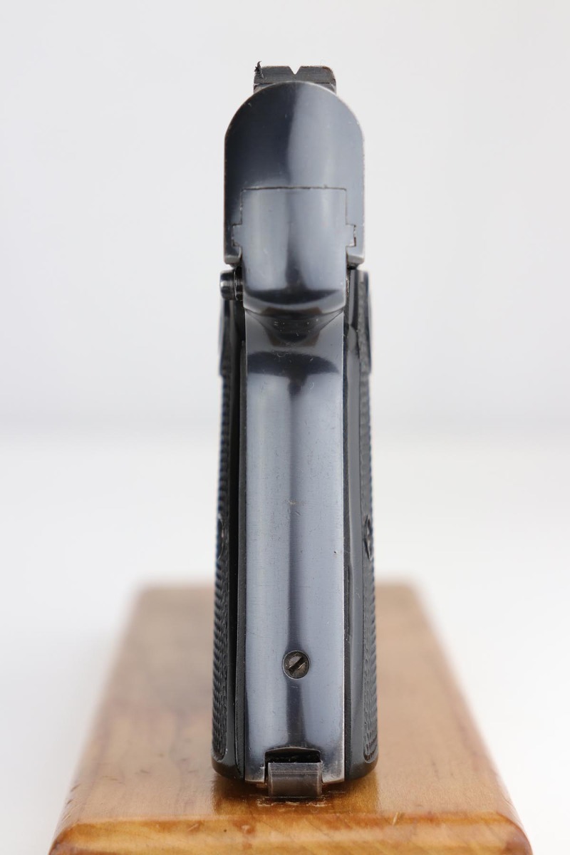 11/5/19 – This is an excellent example of an original and very late Walther Model 4. It is a 6th variation example, with rectangular ejection port and ‘MADE IN GERMANY’ export marking on frame. Dieter Marschall’s book on Walthers has the final serial on Model 4 production as 493,700, which would mean this was one of the final 50 ever produced. The original blue rates at 96-97% with minor high edge and muzzle thinning. Excellent bore and grips. Walther banner magazine.