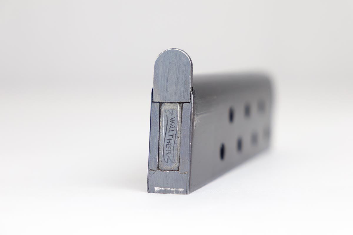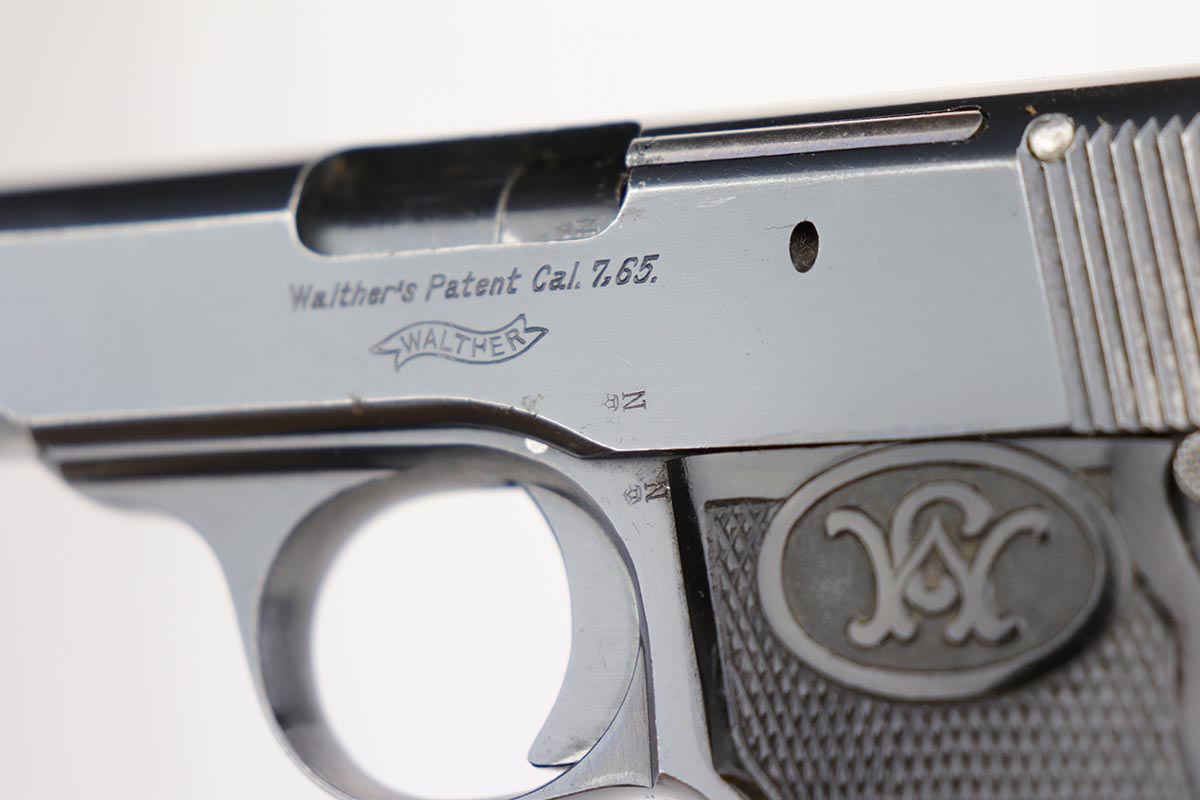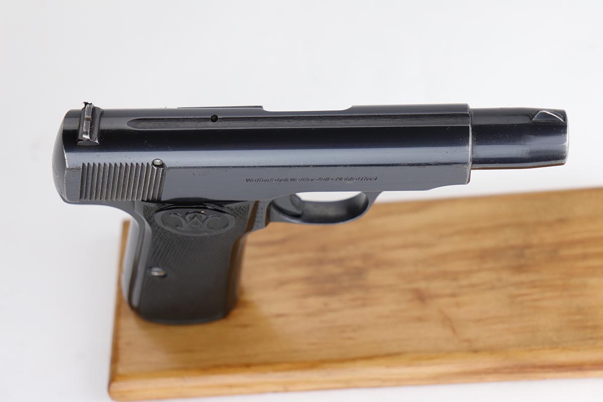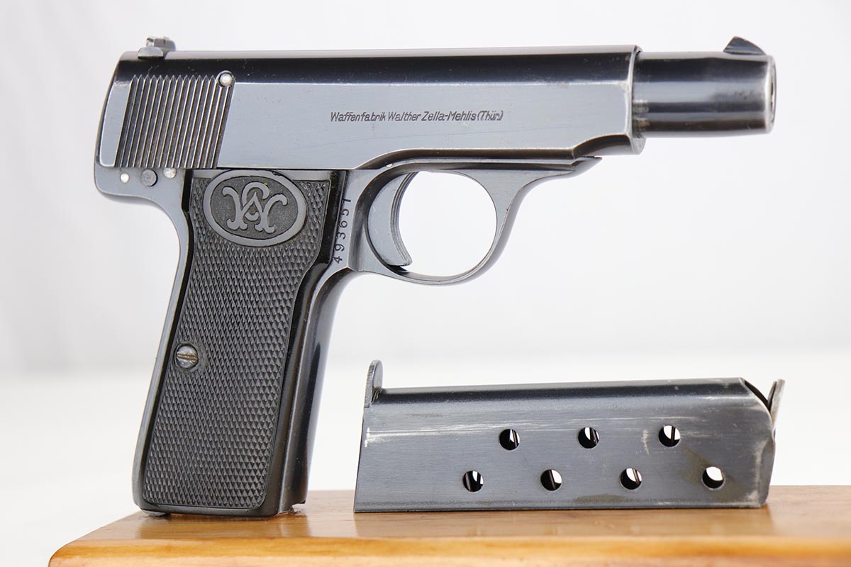11/5/19 – This is an excellent example of an original and very late Walther Model 4. It is a 6th variation example, with rectangular ejection port and ‘MADE IN GERMANY’ export marking on frame. Dieter Marschall’s book on Walthers has the final serial on Model 4 production as 493,700, which would mean this was one of the final 50 ever produced. The original blue rates at 96-97% with minor high edge and muzzle thinning. Excellent bore and grips. Walther banner magazine.