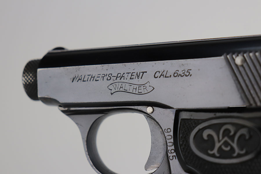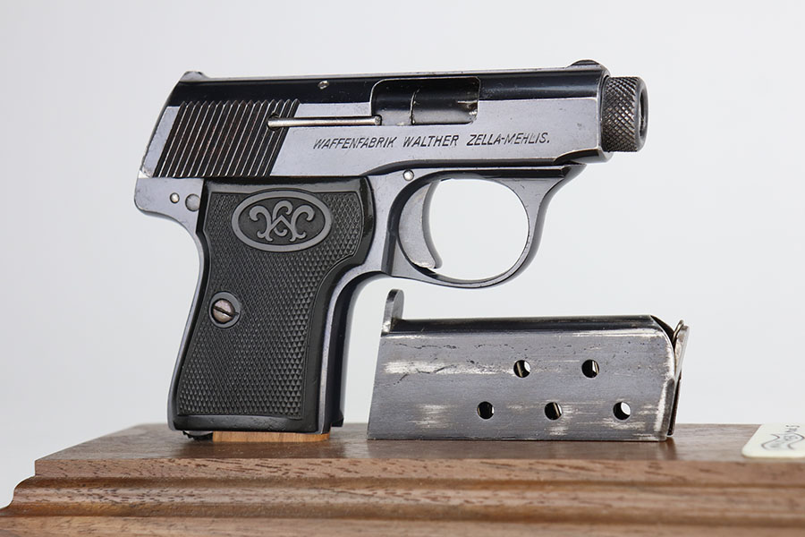 7/27/21 – This is an excellent, original Walther Model 5 from 1915-16. The bluing rates at about 97% with just a hint of high edge wear, though there is minor oxidation on the straps and left side of the slide. Beautiful original grips with no cracks. Bore is shiny but shows some slight wear to the rifling. The listing also includes the custom display stand in the photos.