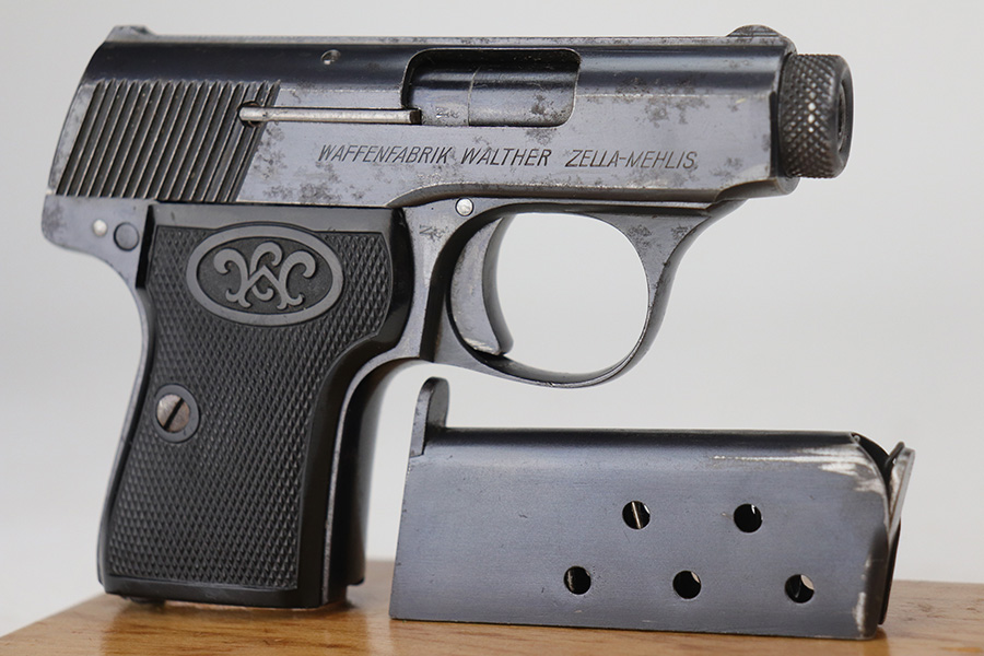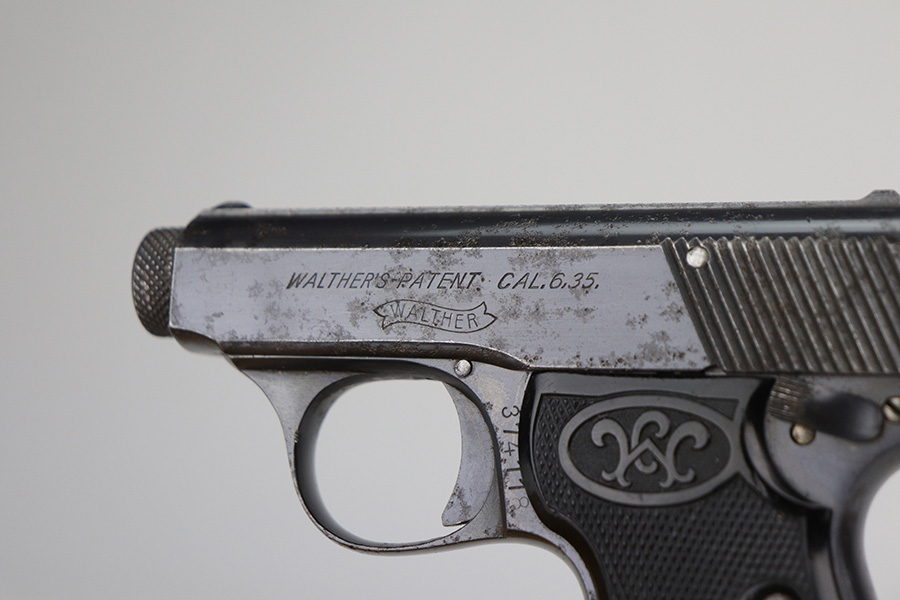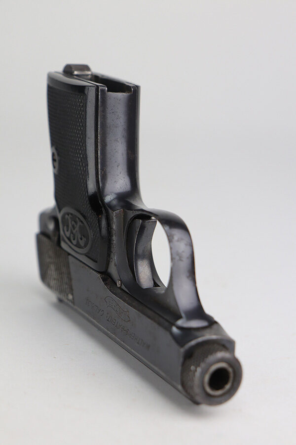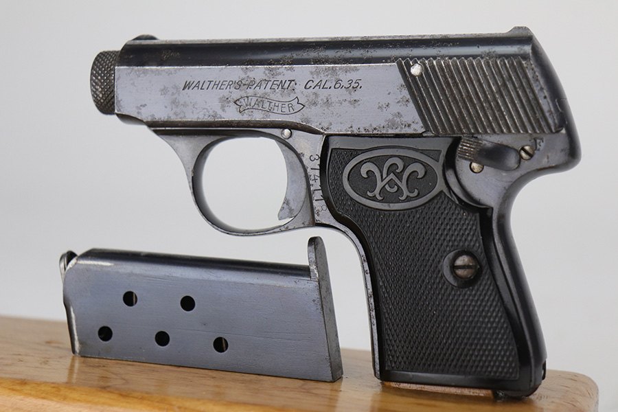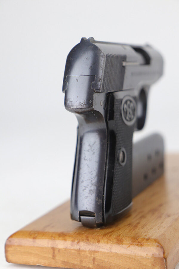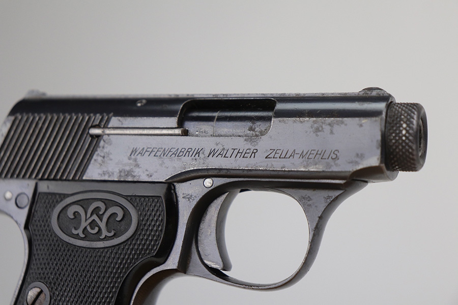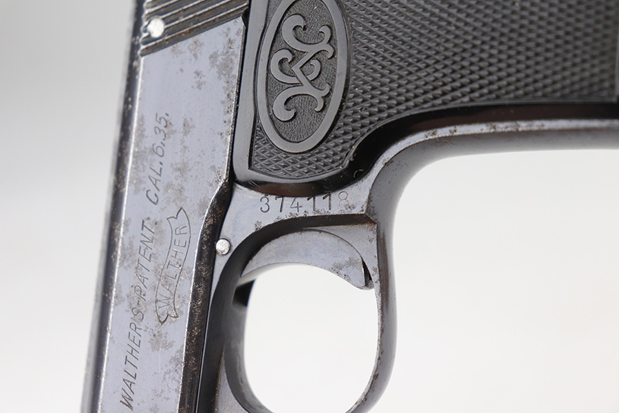 11/10/21 – This is an excellent example of a Walther Model 5. This one has a late serial number, which puts its date of production in the early 1920’s. It is all matching and has the proper “Crown N” commercial proofs. It has retained about 97% of its original finish. There are just hints of wear on the high edges and around the muzzle. While there is very little actual finish loss, there is minor pitting along the whole slide and minor freckling on both grip straps. Comes with excellent period-correct grips and one proper magazine. The bore is very nice – excellent rifling with some areas of very minor frosting.