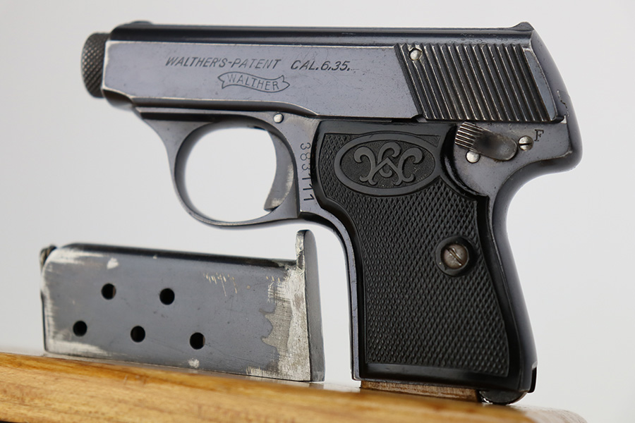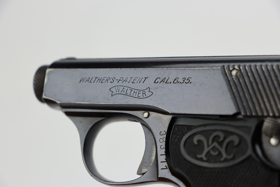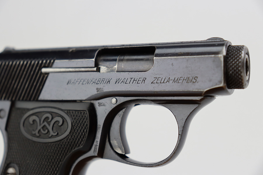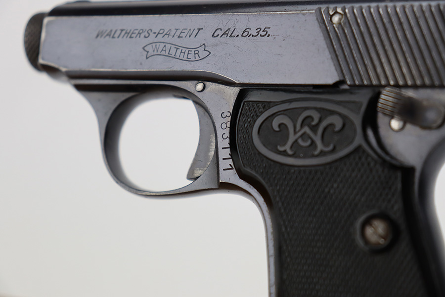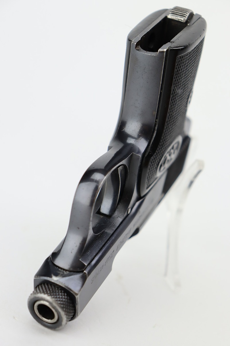 7/11/23 – This is an excellent example of a Walther Model 5. This one has a late serial number, which puts its date of production in the early 1920’s. It is all matching and has the proper “Crown N” commercial proofs. “Made in Germany” export marking on the right side of the frame. It has retained about 96-97% of its original finish. There is minor wear around the muzzle and high edges in general. Minor freckling on the grip straps. Fitted with excellent period-correct black bakelite grips and comes with one proper magazine. The bore has good rifling, but there is light pin-pricking throughout.