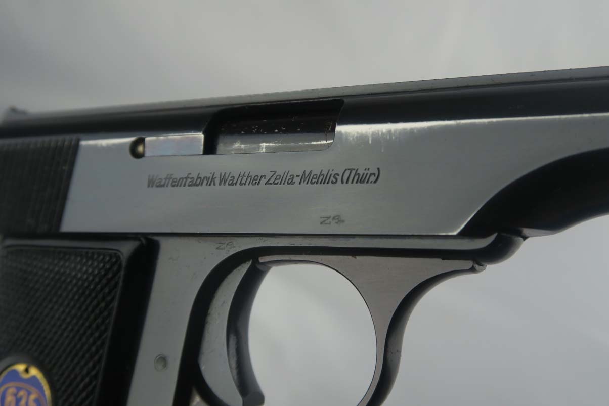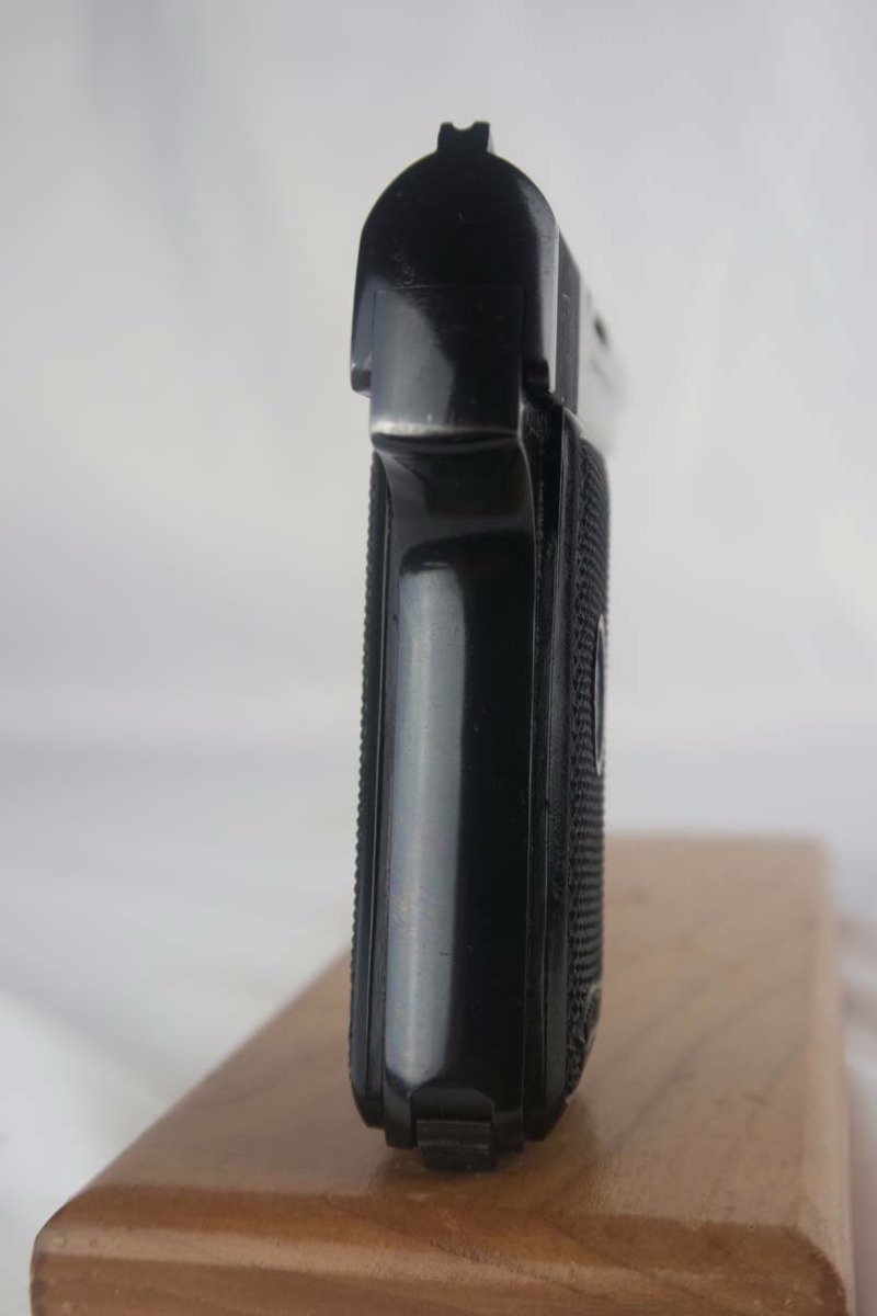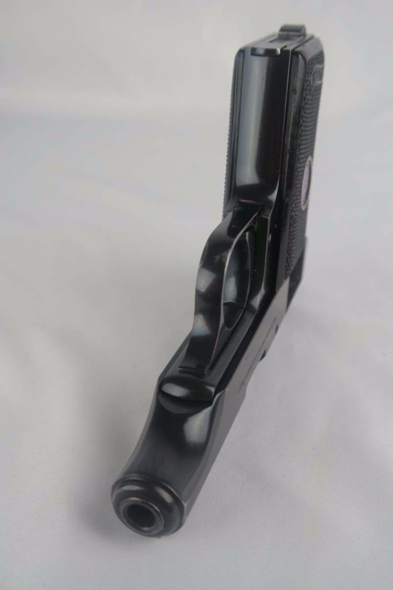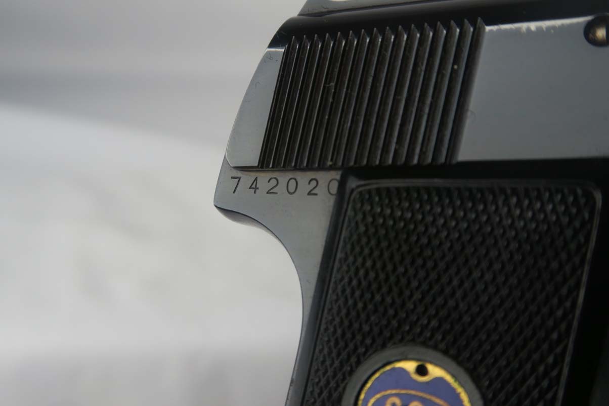 7/10/17 – This is a very nice Walther Model 8, with about 97-98% of its original bluing remaining. There is minor slide and trigger guard wear, with beautiful straps. This is a variation 3 pistol, with Crown/N proofs, and a spring loaded trigger guard. Excellent and original grips and magazine. Minty bore.