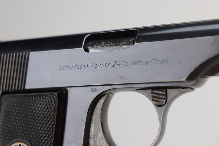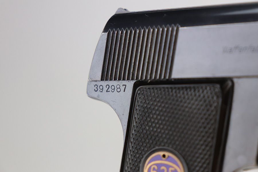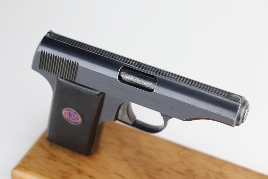 8/4/21 – This is an excellent example of a first variation Walther Model 8 sold in the commercial market in 1920-21. The gun is all matching and has the proper “Crown N” proofs. There is a “Made in Germany” export marking on the left side of the frame, indicating this gun was intended for international sale. It has retained about 95% of its original finish. There is very minor wear along the high edges in general. One area of very minor wear on the left side of the slide. Areas of very minor pin-pricking and oxidation here and there. Comes with excellent grips and one proper magazine. The bore has great rifling with very minor pin-pricking in the grooves.