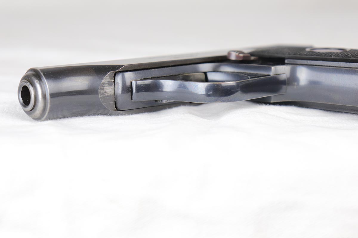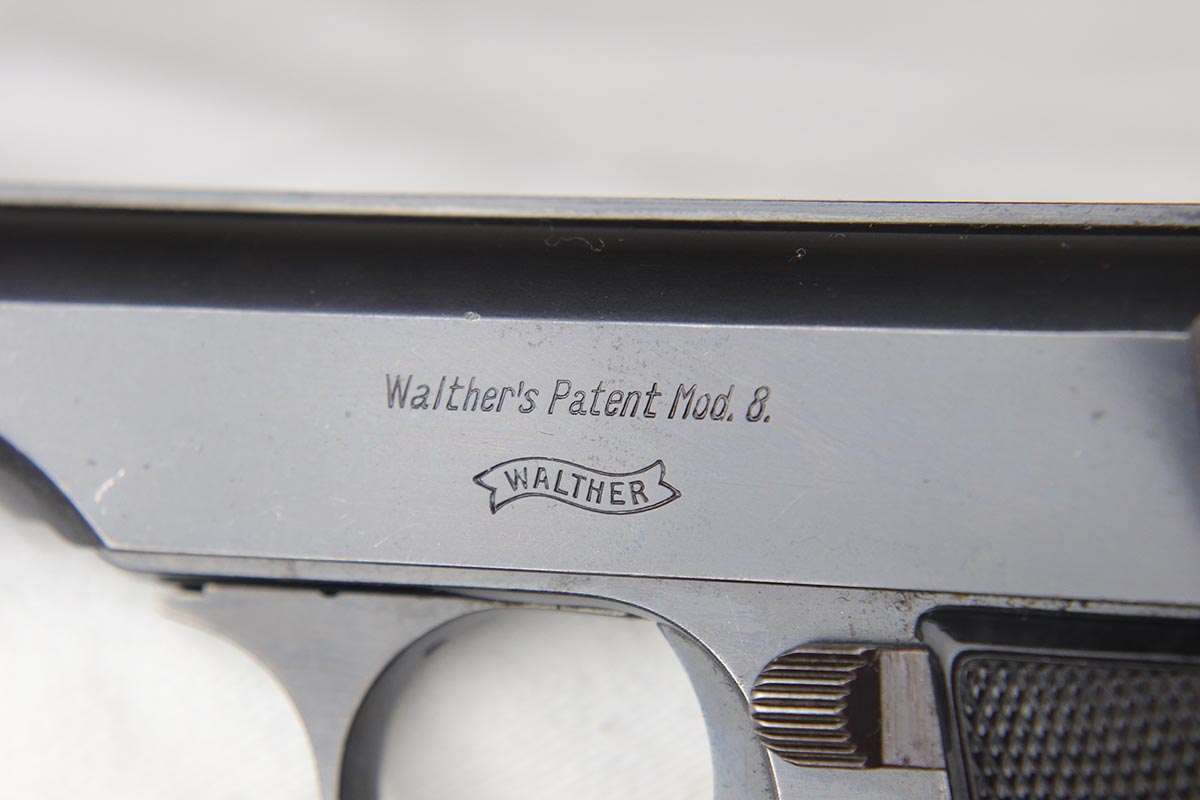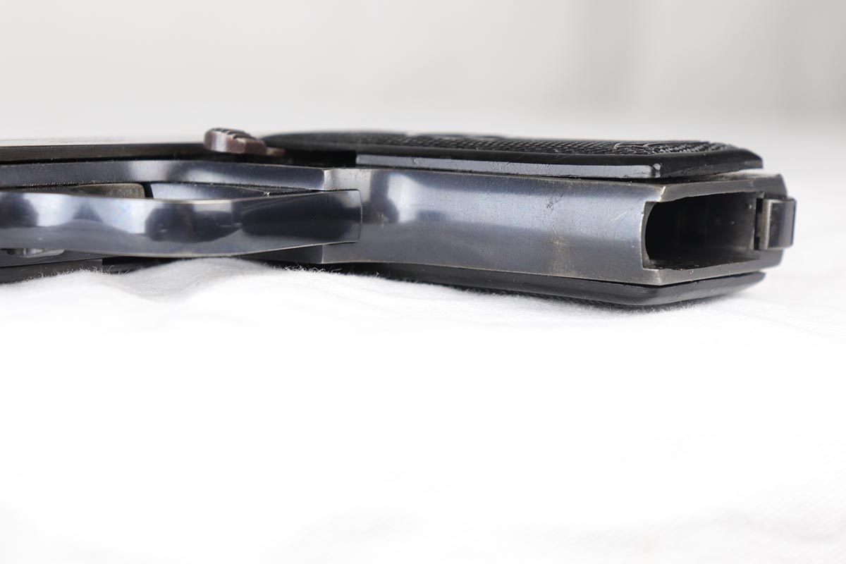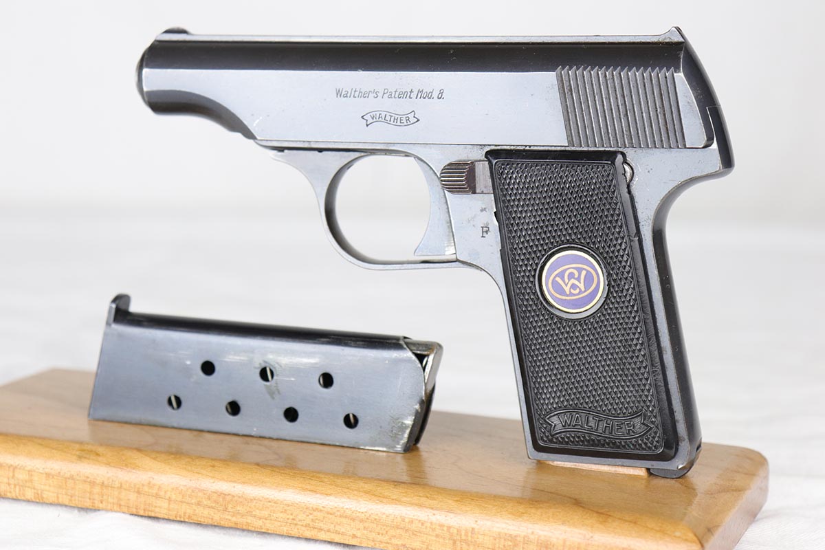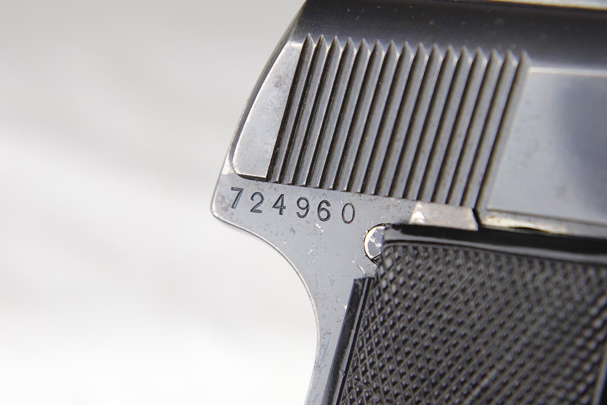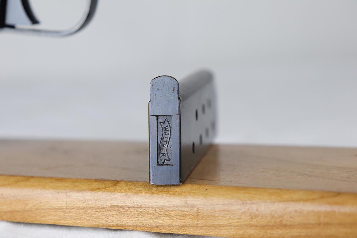 3/28/18 – This is a very nice condition, .25 caliber Walther model 8. It is all original finish rating at about 98%. Made in the late 20’s or early 30’s. All original parts including the Walther Banner marked magazine. Seems to function well. Desirable little pistols that were often used as a “lady’s pistol”. Eva Braun had one and they even issued them with ladies purses in the 1920’s. Only dings are on the right grip medallion as someone tried to take off the grip without the proper tool.