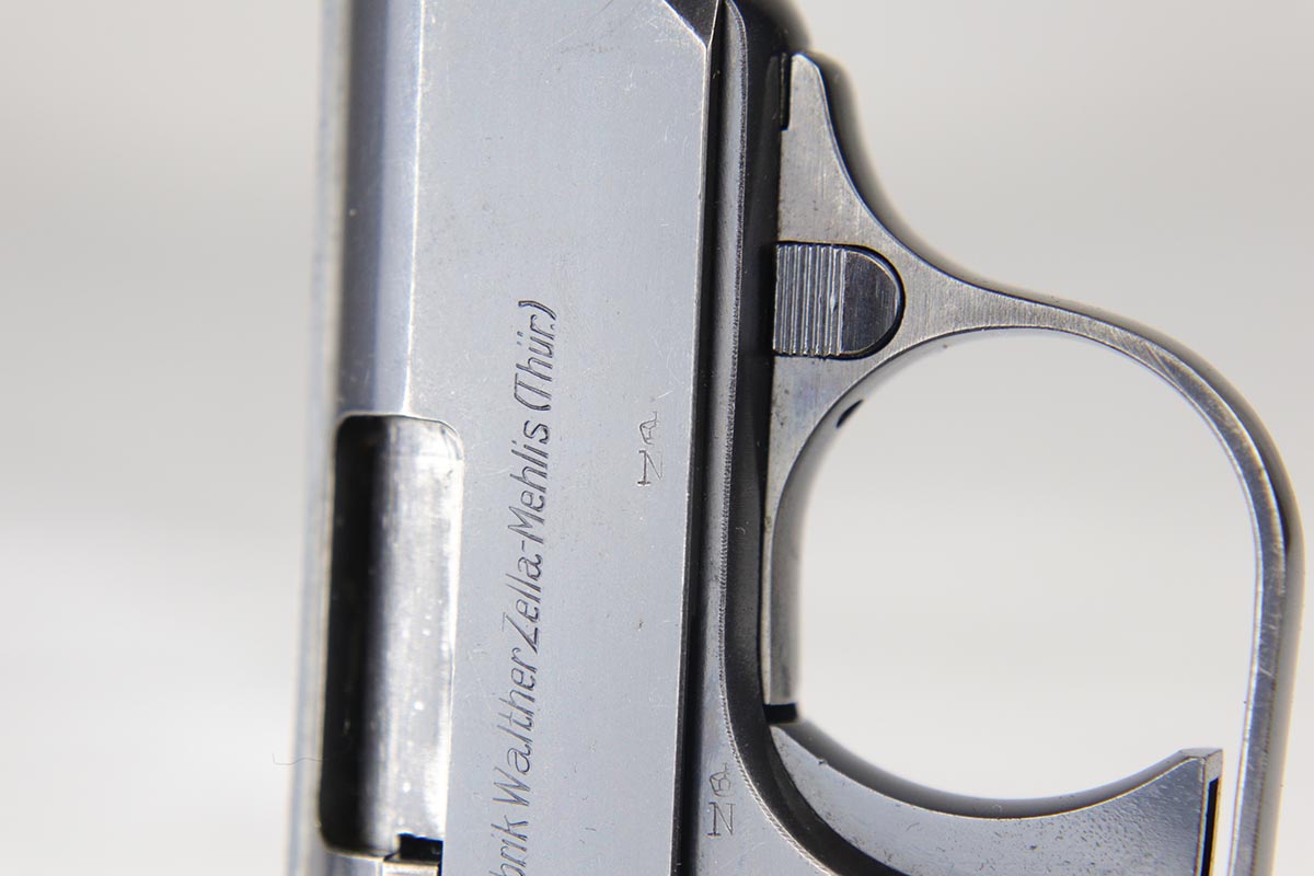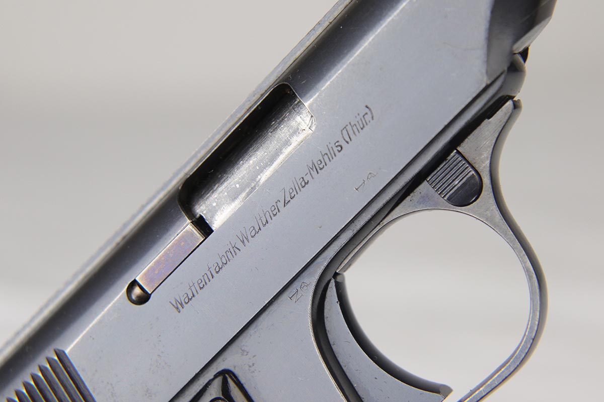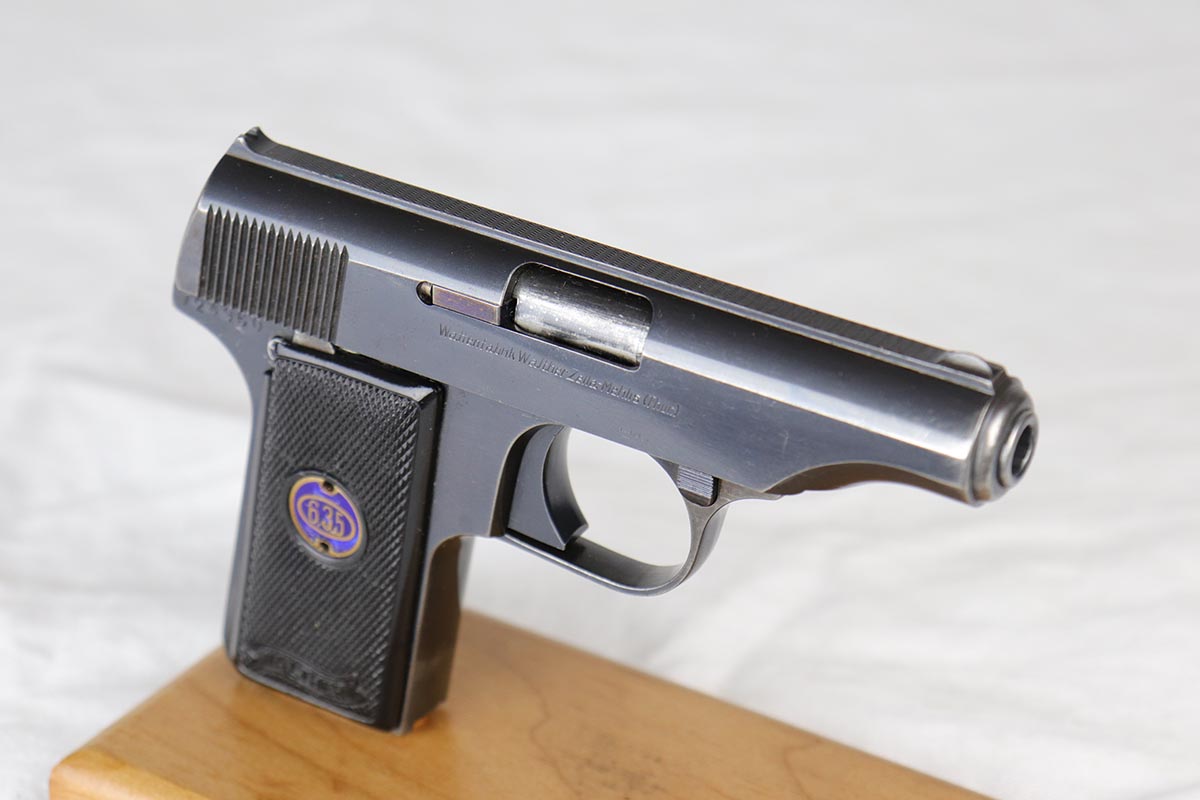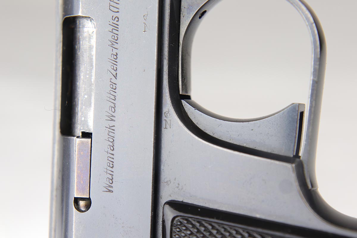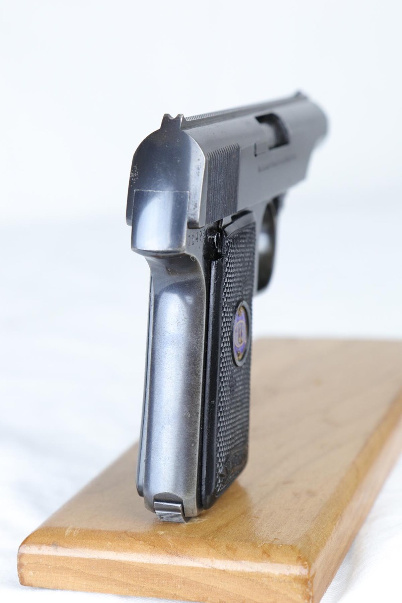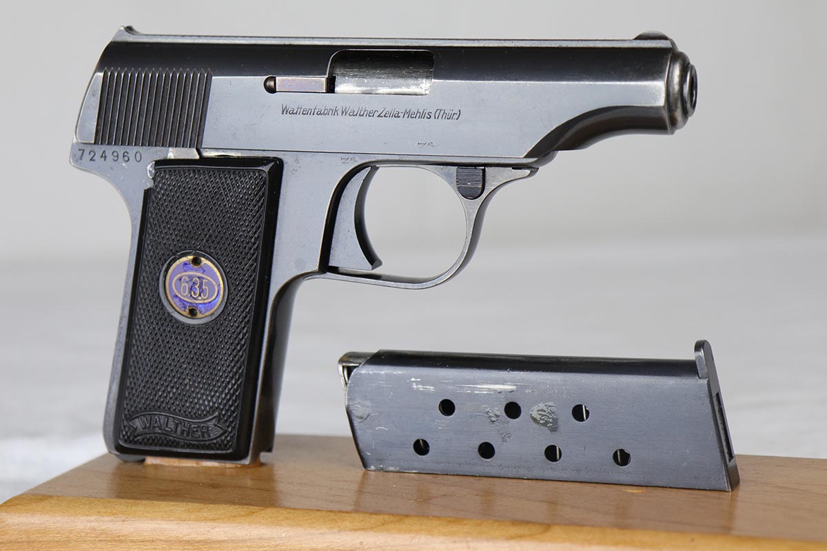 3/28/18 – This is a very nice condition, .25 caliber Walther model 8. It is all original finish rating at about 98%. Made in the late 20’s or early 30’s. All original parts including the Walther Banner marked magazine. Seems to function well. Desirable little pistols that were often used as a “lady’s pistol”. Eva Braun had one and they even issued them with ladies purses in the 1920’s. Only dings are on the right grip medallion as someone tried to take off the grip without the proper tool.