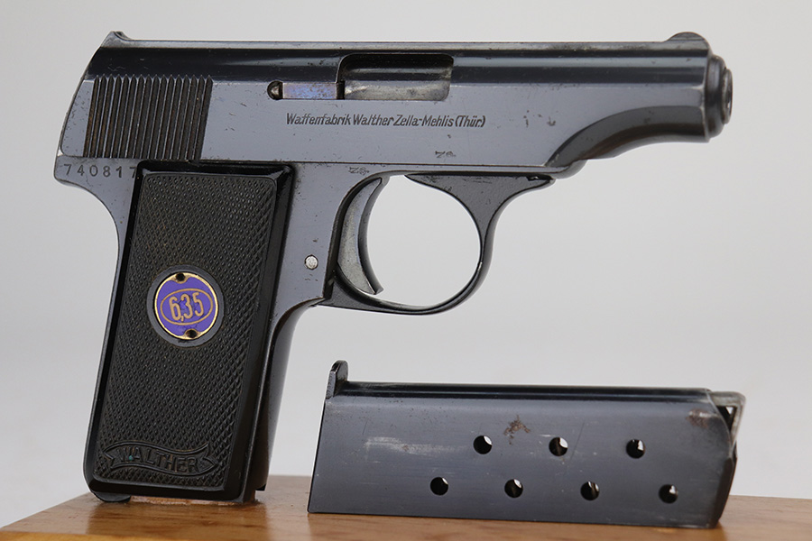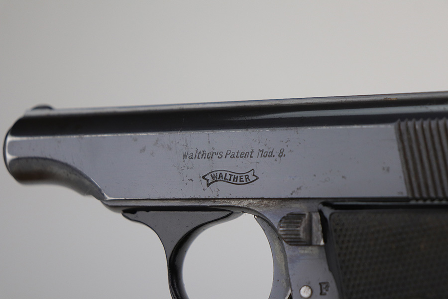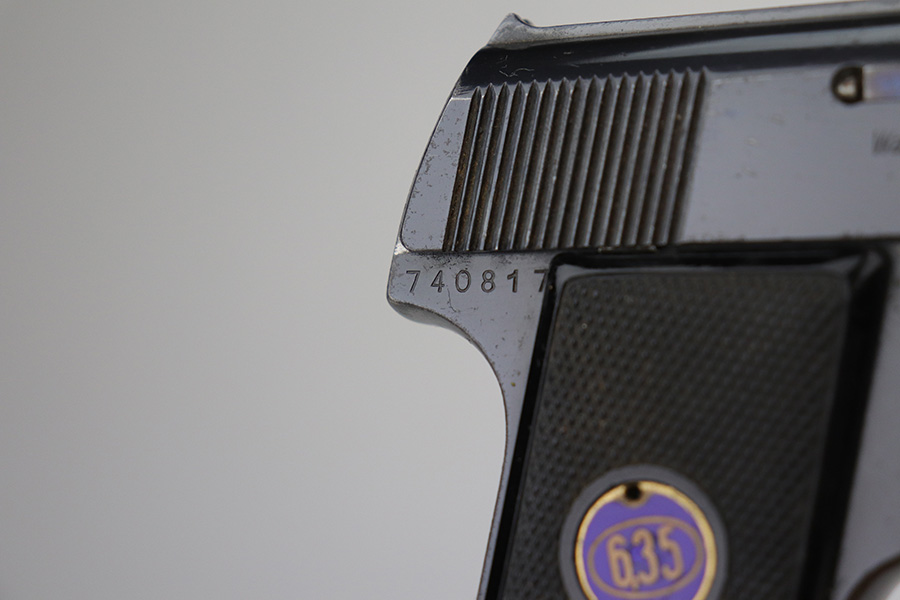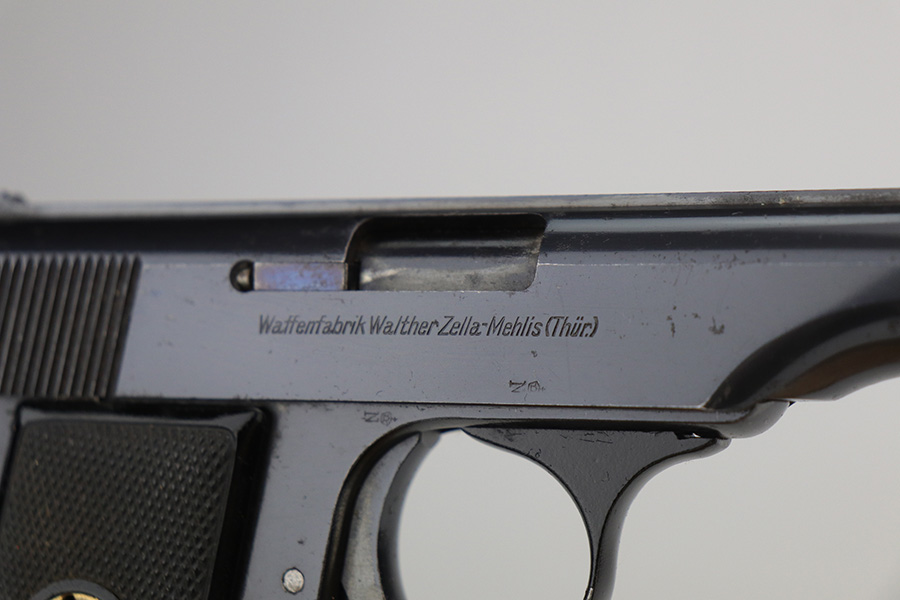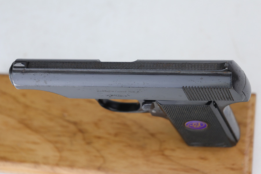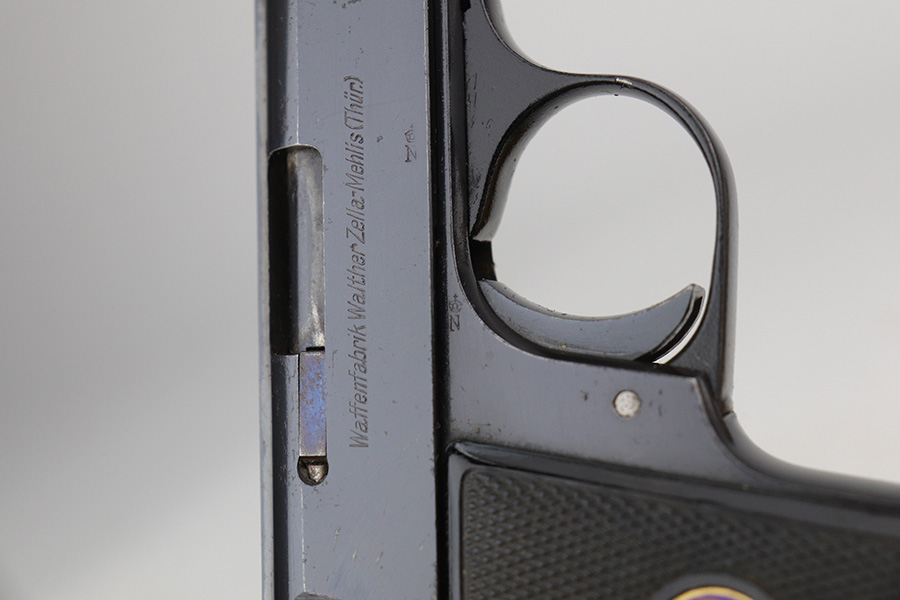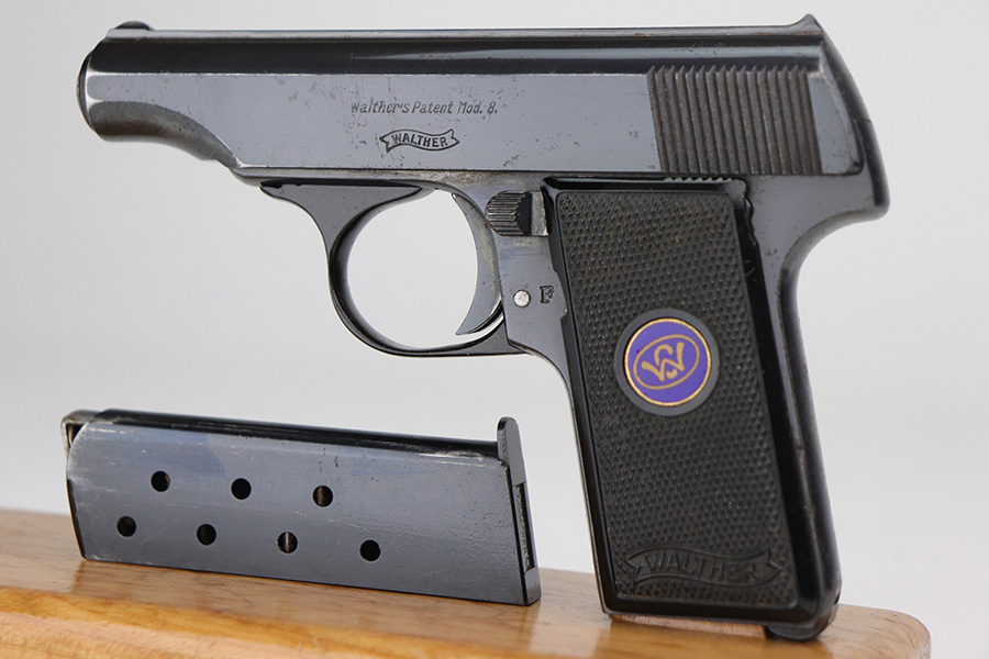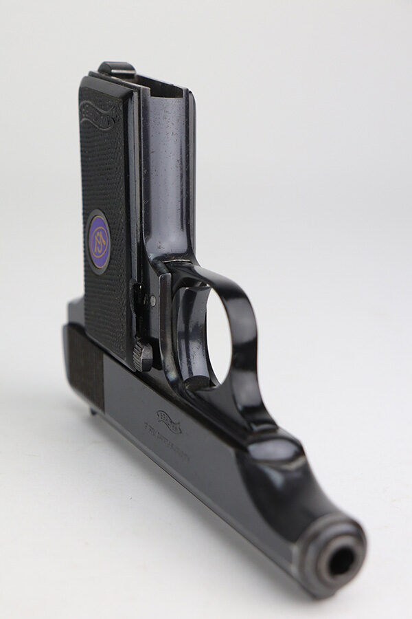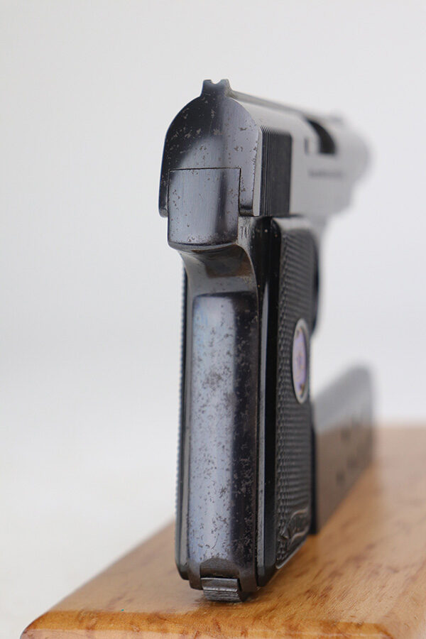 11/10/21 – This is an excellent example of a Walther Model 8 manufactured in 1937-38. It is fully functional and has the proper “Crown N” commercial proofs. It appears that the trigger guard has been replaced. The gun has retained about 98% of its original finish. There are just hints of wear on the high edges of the slide and around the muzzle. While there is very little actual finish loss, there is noticeable freckling throughout. There are a few tiny dings on the right side of the slide and an area of very light scratching on the left side of the slide. Comes with nice period-correct black bakelite grips (small chip in the left panel) and one period-correct magazine. Excellent bore – shiny with strong rifling.