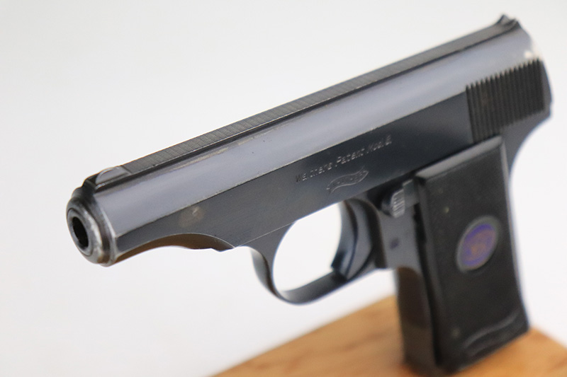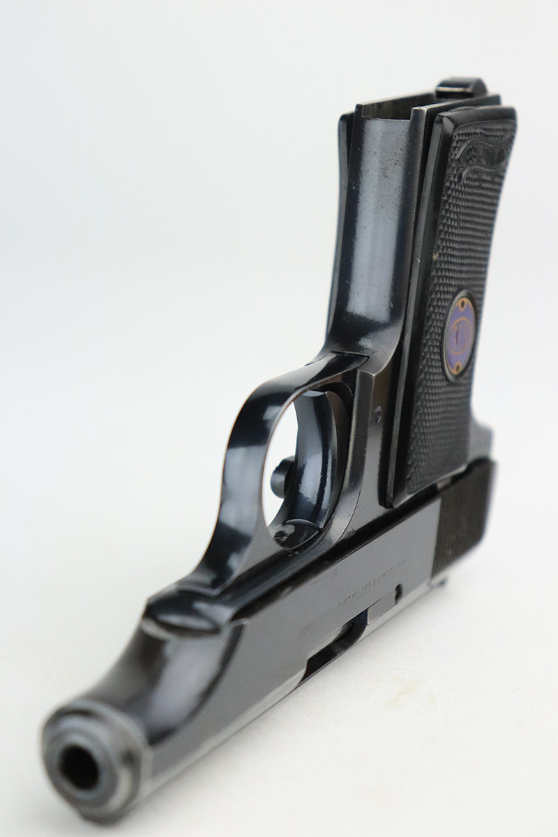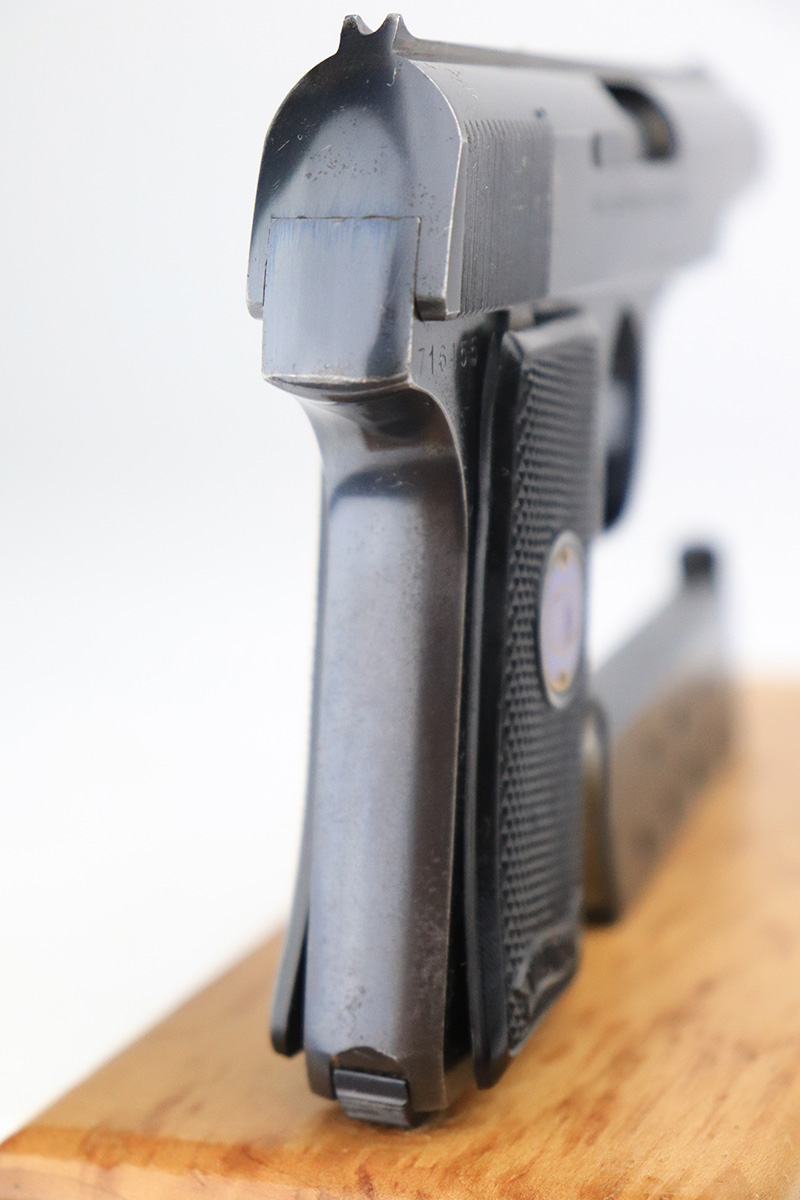 9/21/22 – This is an excellent example of a Walther Model 8 sold in the commercial market in 1931-32. This is a third variation example. It is all matching and has the proper “Crown N” proofs. It has retained about 97% of its original finish. There is just very minor wear on the high edges of the slide and a few small dots of discoloration on both sides of the slide. Minor pin-pricking on the grip straps. Comes with period-correct black bakelite grips – there is some noticeable warping on the bottom edges. Also comes with a Walther banner magazine. The bore has good rifling, but there is an area of minor spotty oxidation around the muzzle end.