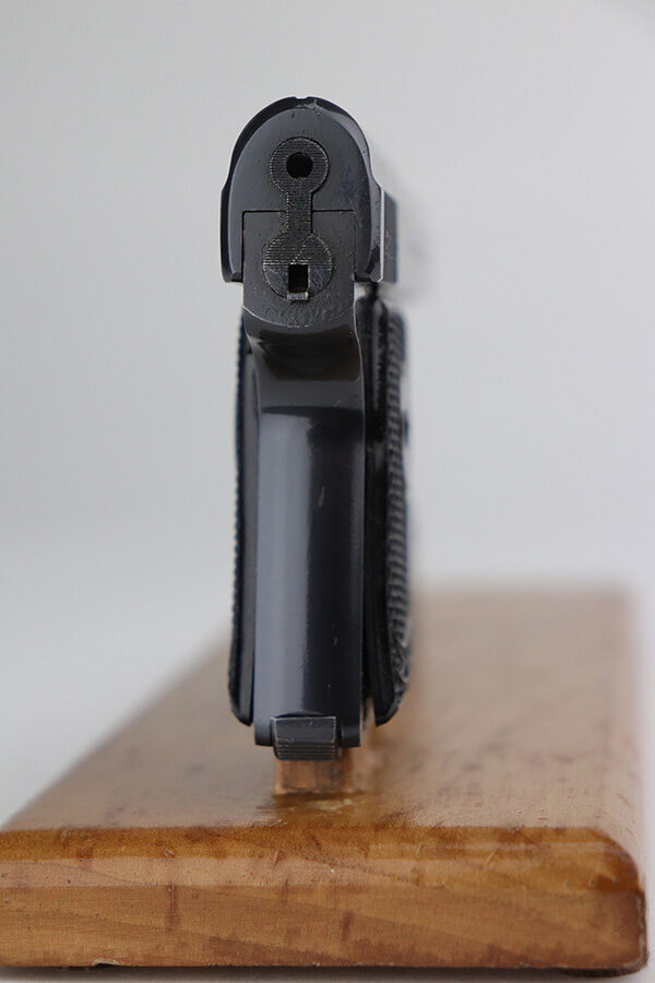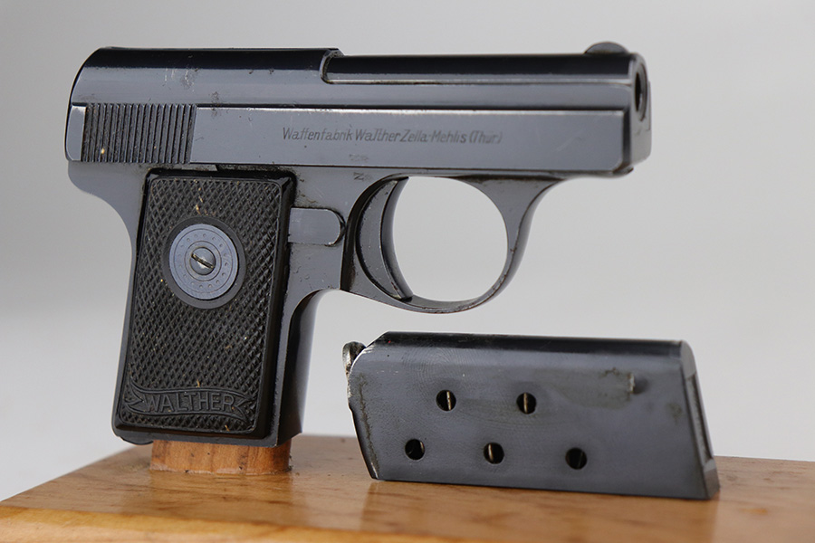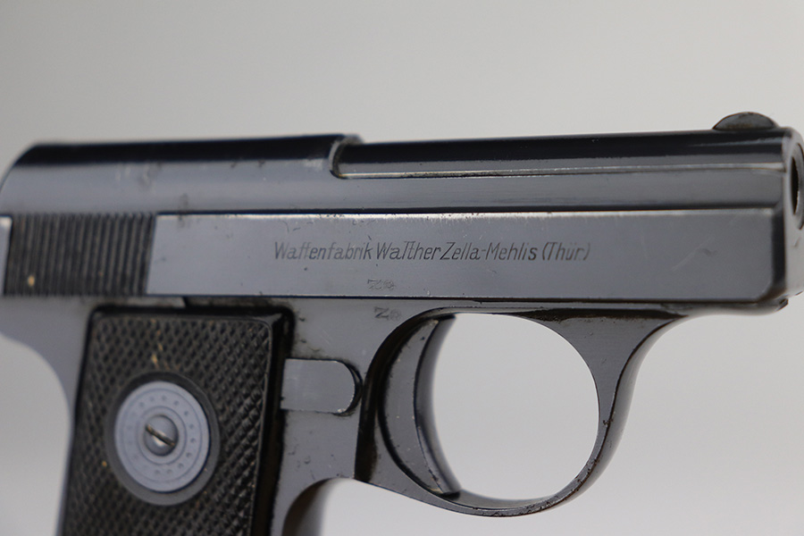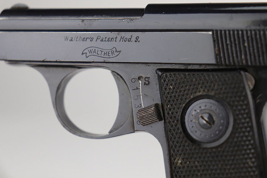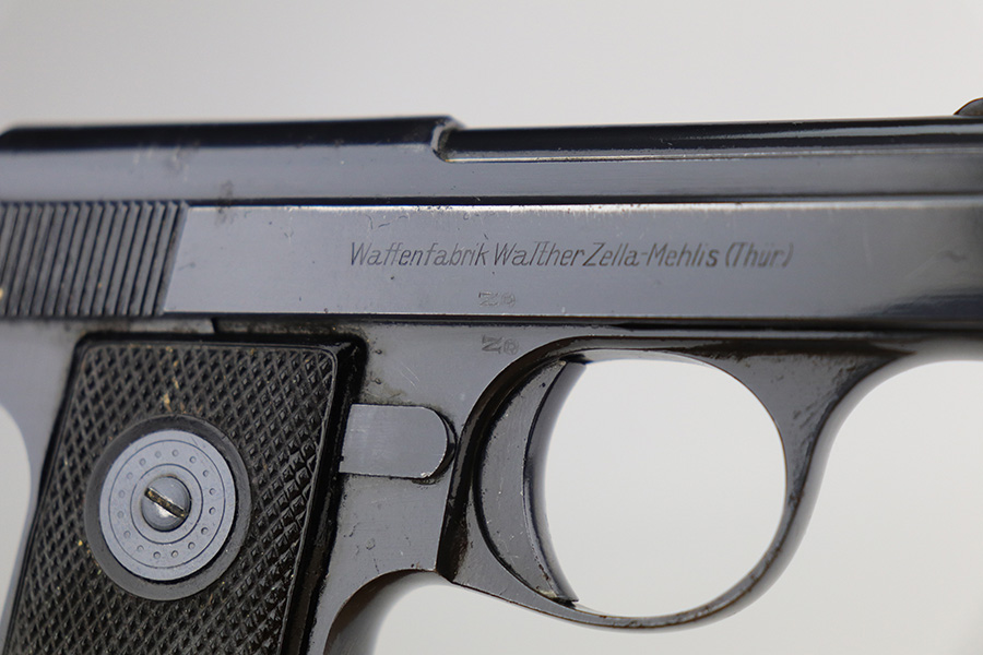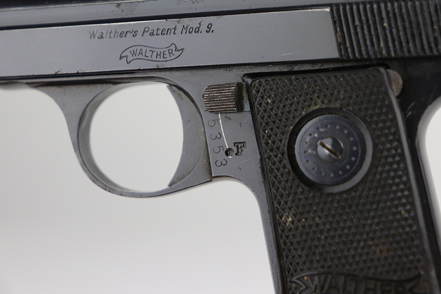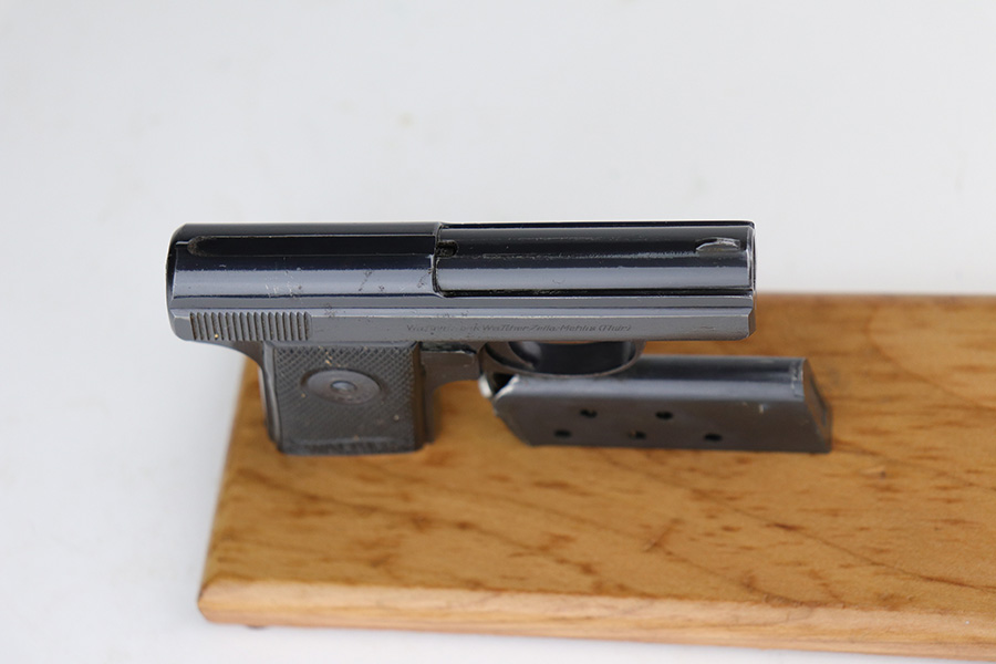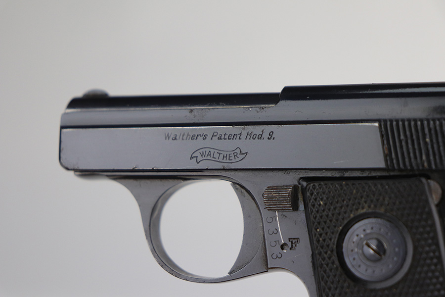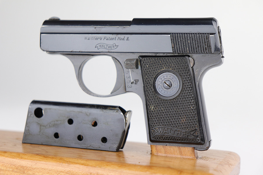 9/1/21 – This is an excellent example of a Walther Model 9, chambered in 25. The gun is all matching and has the proper “Crown N” commercial proofs. It comes with very nice original black bakelite grips and a proper magazine. It has retained about 97% of its original finish. There is scratchy wear along the high edges of the right side and top of the slide. One light scratch near the muzzle. A few tiny pits on the right side and top of the slide. The rifling in the bore is somewhat worn but the bore is shiny.